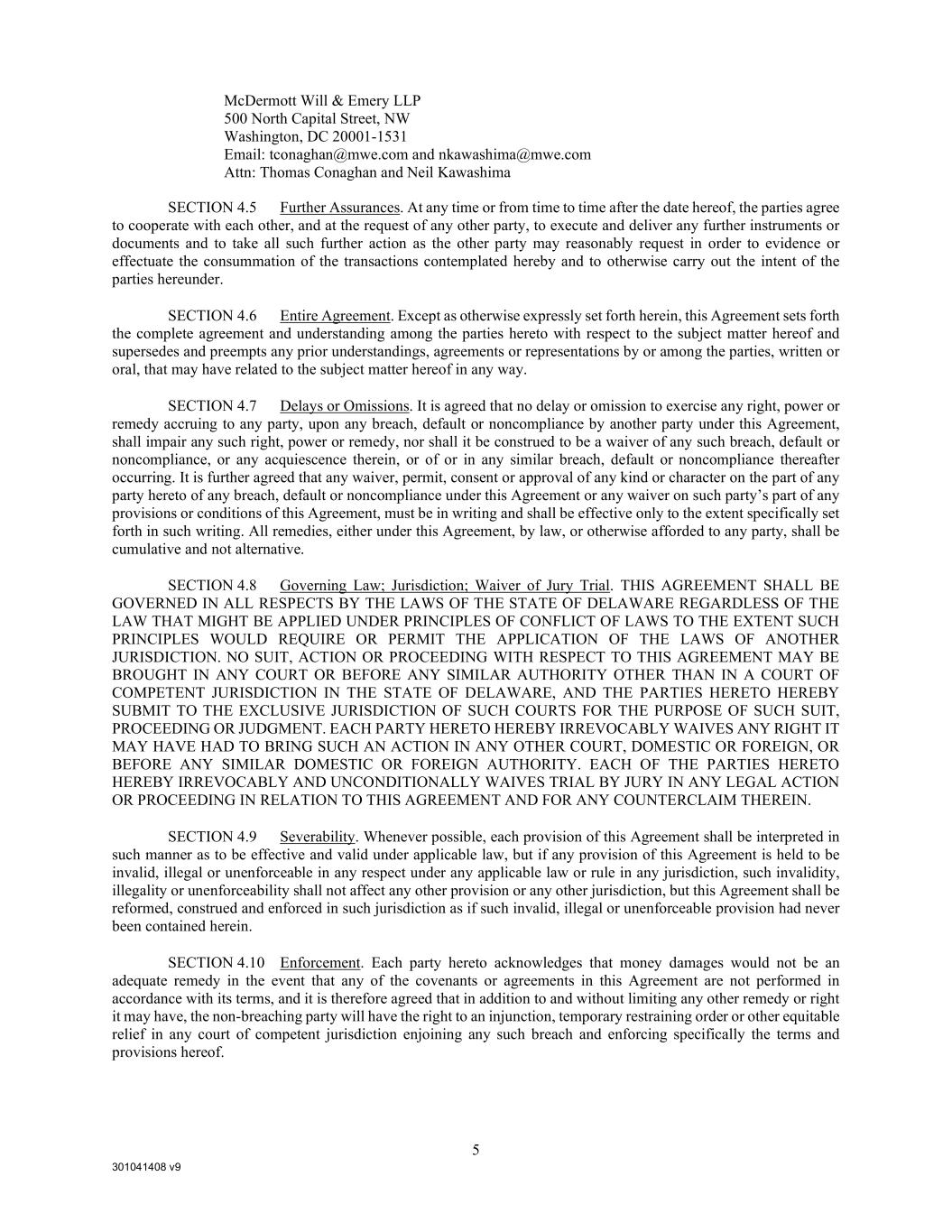 301041408 v9 5 McDermott Will & Emery LLP 500 North Capital Street, NW Washington, DC 20001-1531 Email: tconaghan@mwe.com and nkawashima@mwe.com Attn: Thomas Conaghan and Neil Kawashima SECTION 4.5 Further Assurances. At any time or from time to time after the date hereof, the parties agree to cooperate with each other, and at the request of any other party, to execute and deliver any further instruments or documents and to take all such further action as the other party may reasonably request in order to evidence or effectuate the consummation of the transactions contemplated hereby and to otherwise carry out the intent of the parties hereunder. SECTION 4.6 Entire Agreement. Except as otherwise expressly set forth herein, this Agreement sets forth the complete agreement and understanding among the parties hereto with respect to the subject matter hereof and supersedes and preempts any prior understandings, agreements or representations by or among the parties, written or oral, that may have related to the subject matter hereof in any way. SECTION 4.7 Delays or Omissions. It is agreed that no delay or omission to exercise any right, power or remedy accruing to any party, upon any breach, default or noncompliance by another party under this Agreement, shall impair any such right, power or remedy, nor shall it be construed to be a waiver of any such breach, default or noncompliance, or any acquiescence therein, or of or in any similar breach, default or noncompliance thereafter occurring. It is further agreed that any waiver, permit, consent or approval of any kind or character on the part of any party hereto of any breach, default or noncompliance under this Agreement or any waiver on such party’s part of any provisions or conditions of this Agreement, must be in writing and shall be effective only to the extent specifically set forth in such writing. All remedies, either under this Agreement, by law, or otherwise afforded to any party, shall be cumulative and not alternative. SECTION 4.8 Governing Law; Jurisdiction; Waiver of Jury Trial. THIS AGREEMENT SHALL BE GOVERNED IN ALL RESPECTS BY THE LAWS OF THE STATE OF DELAWARE REGARDLESS OF THE LAW THAT MIGHT BE APPLIED UNDER PRINCIPLES OF CONFLICT OF LAWS TO THE EXTENT SUCH PRINCIPLES WOULD REQUIRE OR PERMIT THE APPLICATION OF THE LAWS OF ANOTHER JURISDICTION. NO SUIT, ACTION OR PROCEEDING WITH RESPECT TO THIS AGREEMENT MAY BE BROUGHT IN ANY COURT OR BEFORE ANY SIMILAR AUTHORITY OTHER THAN IN A COURT OF COMPETENT JURISDICTION IN THE STATE OF DELAWARE, AND THE PARTIES HERETO HEREBY SUBMIT TO THE EXCLUSIVE JURISDICTION OF SUCH COURTS FOR THE PURPOSE OF SUCH SUIT, PROCEEDING OR JUDGMENT. EACH PARTY HERETO HEREBY IRREVOCABLY WAIVES ANY RIGHT IT MAY HAVE HAD TO BRING SUCH AN ACTION IN ANY OTHER COURT, DOMESTIC OR FOREIGN, OR BEFORE ANY SIMILAR DOMESTIC OR FOREIGN AUTHORITY. EACH OF THE PARTIES HERETO HEREBY IRREVOCABLY AND UNCONDITIONALLY WAIVES TRIAL BY JURY IN ANY LEGAL ACTION OR PROCEEDING IN RELATION TO THIS AGREEMENT AND FOR ANY COUNTERCLAIM THEREIN. SECTION 4.9 Severability. Whenever possible, each provision of this Agreement shall be interpreted in such manner as to be effective and valid under applicable law, but if any provision of this Agreement is held to be invalid, illegal or unenforceable in any respect under any applicable law or rule in any jurisdiction, such invalidity, illegality or unenforceability shall not affect any other provision or any other jurisdiction, but this Agreement shall be reformed, construed and enforced in such jurisdiction as if such invalid, illegal or unenforceable provision had never been contained herein. SECTION 4.10 Enforcement. Each party hereto acknowledges that money damages would not be an adequate remedy in the event that any of the covenants or agreements in this Agreement are not performed in accordance with its terms, and it is therefore agreed that in addition to and without limiting any other remedy or right it may have, the non-breaching party will have the right to an injunction, temporary restraining order or other equitable relief in any court of competent jurisdiction enjoining any such breach and enforcing specifically the terms and provisions hereof.