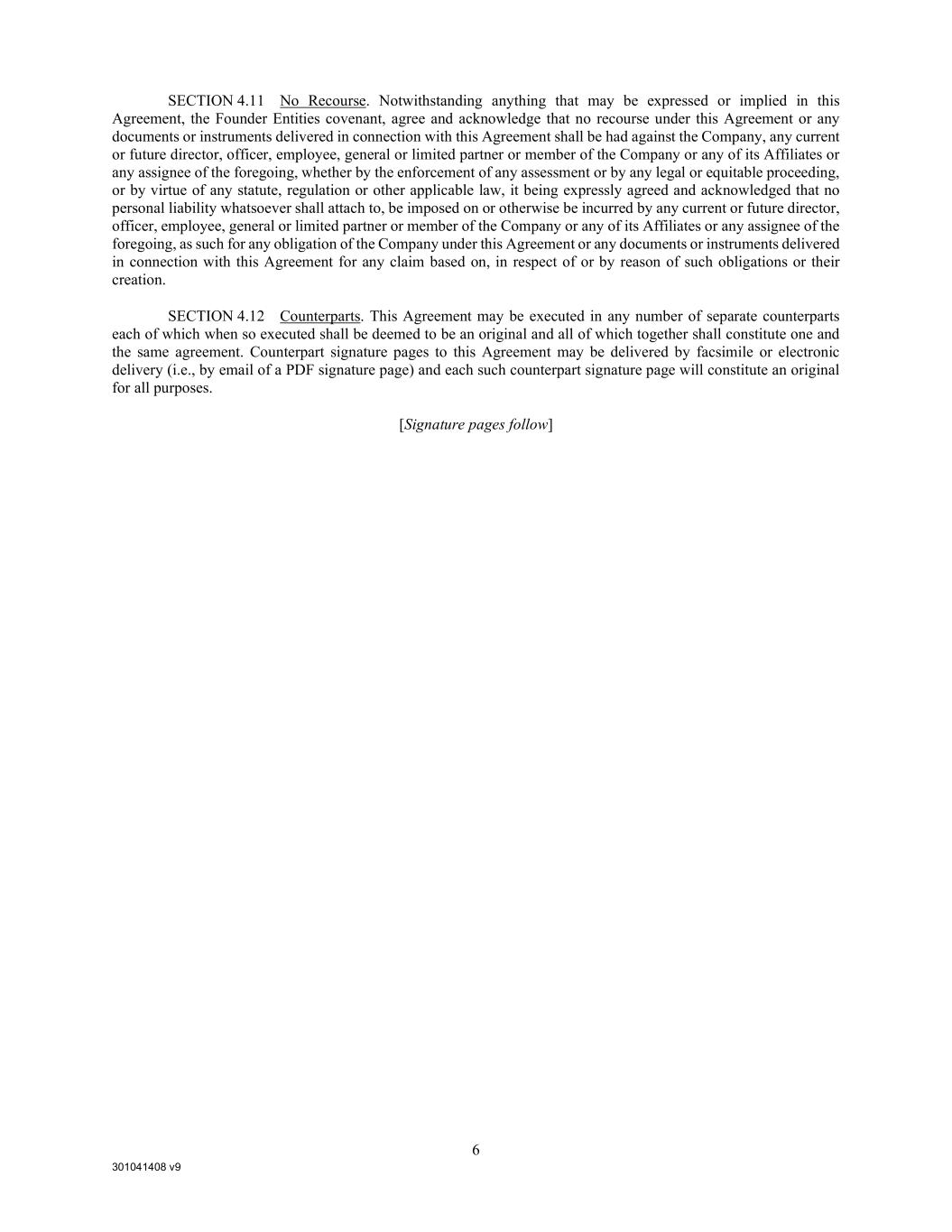301041408 v9 6 SECTION 4.11 No Recourse. Notwithstanding anything that may be expressed or implied in this Agreement, the Founder Entities covenant, agree and acknowledge that no recourse under this Agreement or any documents or instruments delivered in connection with this Agreement shall be had against the Company, any current or future director, officer, employee, general or limited partner or member of the Company or any of its Affiliates or any assignee of the foregoing, whether by the enforcement of any assessment or by any legal or equitable proceeding, or by virtue of any statute, regulation or other applicable law, it being expressly agreed and acknowledged that no personal liability whatsoever shall attach to, be imposed on or otherwise be incurred by any current or future director, officer, employee, general or limited partner or member of the Company or any of its Affiliates or any assignee of the foregoing, as such for any obligation of the Company under this Agreement or any documents or instruments delivered in connection with this Agreement for any claim based on, in respect of or by reason of such obligations or their creation. SECTION 4.12 Counterparts. This Agreement may be executed in any number of separate counterparts each of which when so executed shall be deemed to be an original and all of which together shall constitute one and the same agreement. Counterpart signature pages to this Agreement may be delivered by facsimile or electronic delivery (i.e., by email of a PDF signature page) and each such counterpart signature page will constitute an original for all purposes. [Signature pages follow]