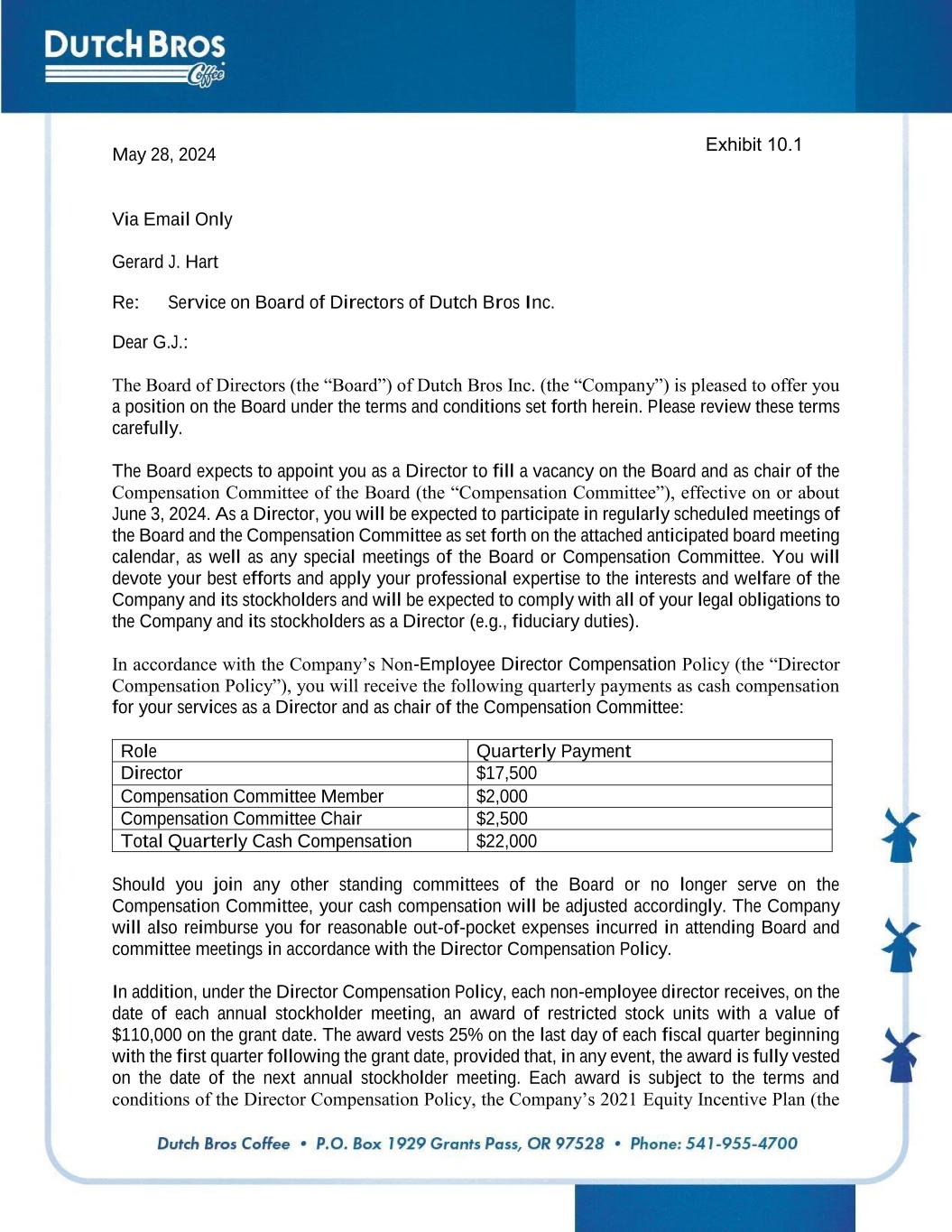 May 28, 2024 Via Email Only Gerard J. Hart Re: Service on Board of Directors of Dutch Bros Inc. Dear G.J.: The Board of Directors (the “Board”) of Dutch Bros Inc. (the “Company”) is pleased to offer you a position on the Board under the terms and conditions set forth herein. Please review these terms carefully. The Board expects to appoint you as a Director to fill a vacancy on the Board and as chair of the Compensation Committee of the Board (the “Compensation Committee”), effective on or about June 3, 2024. As a Director, you will be expected to participate in regularly scheduled meetings of the Board and the Compensation Committee as set forth on the attached anticipated board meeting calendar, as well as any special meetings of the Board or Compensation Committee. You will devote your best efforts and apply your professional expertise to the interests and welfare of the Company and its stockholders and will be expected to comply with all of your legal obligations to the Company and its stockholders as a Director (e.g., fiduciary duties). In accordance with the Company’s Non-Employee Director Compensation Policy (the “Director Compensation Policy”), you will receive the following quarterly payments as cash compensation for your services as a Director and as chair of the Compensation Committee: Role Quarterly Payment Director $17,500 Compensation Committee Member $2,000 Compensation Committee Chair $2,500 Total Quarterly Cash Compensation $22,000 Should you join any other standing committees of the Board or no longer serve on the Compensation Committee, your cash compensation will be adjusted accordingly. The Company will also reimburse you for reasonable out-of-pocket expenses incurred in attending Board and committee meetings in accordance with the Director Compensation Policy. In addition, under the Director Compensation Policy, each non-employee director receives, on the date of each annual stockholder meeting, an award of restricted stock units with a value of $110,000 on the grant date. The award vests 25% on the last day of each fiscal quarter beginning with the first quarter following the grant date, provided that, in any event, the award is fully vested on the date of the next annual stockholder meeting. Each award is subject to the terms and conditions of the Director Compensation Policy, the Company’s 2021 Equity Incentive Plan (the Exhibit 10.1
