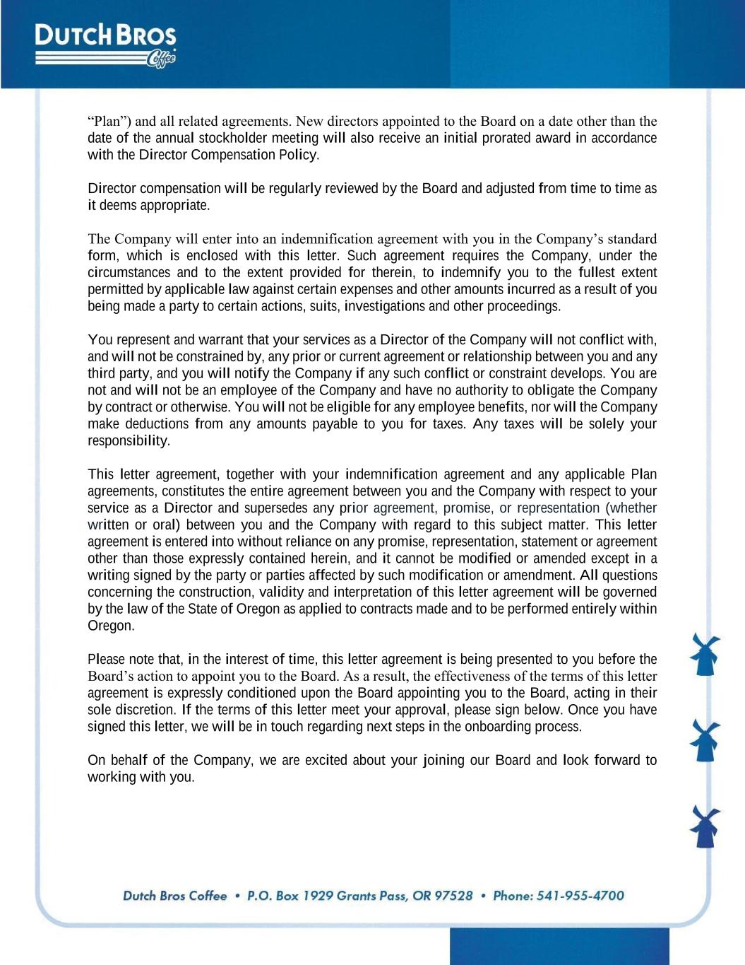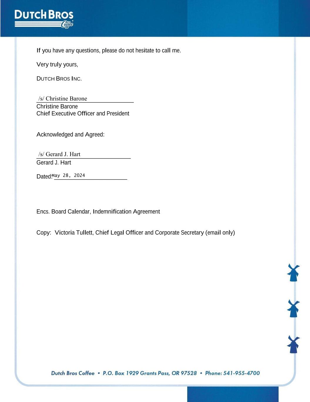 If you have any questions, please do not hesitate to call me. Very truly yours, DUTCH BROS INC. ________________________________ Christine Barone Chief Executive Officer and President Acknowledged and Agreed: _______________________________ Gerard J. Hart Dated: ________________________ Encs. Board Calendar, Indemnification Agreement Copy: Victoria Tullett, Chief Legal Officer and Corporate Secretary (email only) May 28, 2024 /s/ Christine Barone /s/ Gerard J. Hart