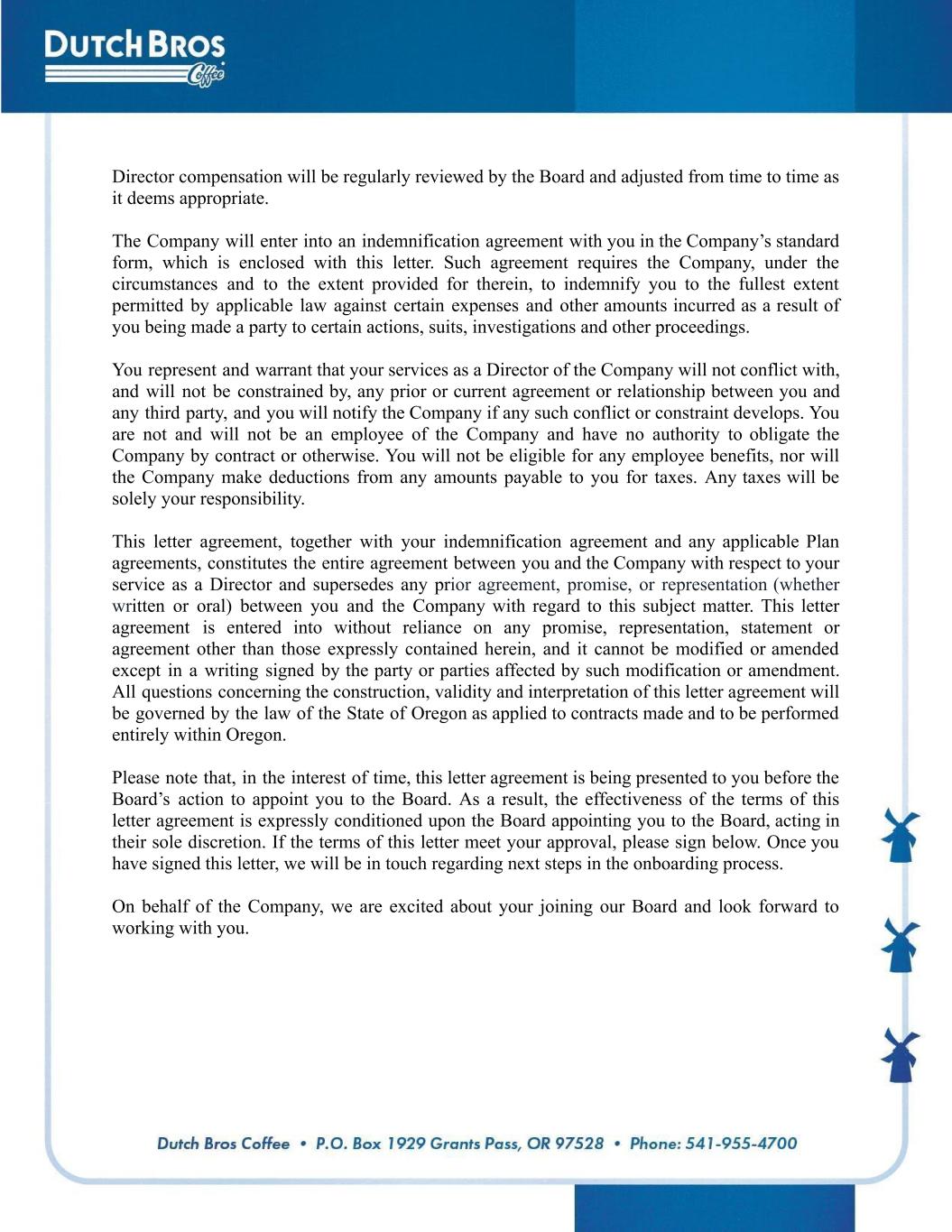 Director compensation will be regularly reviewed by the Board and adjusted from time to time as it deems appropriate. The Company will enter into an indemnification agreement with you in the Company’s standard form, which is enclosed with this letter. Such agreement requires the Company, under the circumstances and to the extent provided for therein, to indemnify you to the fullest extent permitted by applicable law against certain expenses and other amounts incurred as a result of you being made a party to certain actions, suits, investigations and other proceedings. You represent and warrant that your services as a Director of the Company will not conflict with, and will not be constrained by, any prior or current agreement or relationship between you and any third party, and you will notify the Company if any such conflict or constraint develops. You are not and will not be an employee of the Company and have no authority to obligate the Company by contract or otherwise. You will not be eligible for any employee benefits, nor will the Company make deductions from any amounts payable to you for taxes. Any taxes will be solely your responsibility. This letter agreement, together with your indemnification agreement and any applicable Plan agreements, constitutes the entire agreement between you and the Company with respect to your service as a Director and supersedes any prior agreement, promise, or representation (whether written or oral) between you and the Company with regard to this subject matter. This letter agreement is entered into without reliance on any promise, representation, statement or agreement other than those expressly contained herein, and it cannot be modified or amended except in a writing signed by the party or parties affected by such modification or amendment. All questions concerning the construction, validity and interpretation of this letter agreement will be governed by the law of the State of Oregon as applied to contracts made and to be performed entirely within Oregon. Please note that, in the interest of time, this letter agreement is being presented to you before the Board’s action to appoint you to the Board. As a result, the effectiveness of the terms of this letter agreement is expressly conditioned upon the Board appointing you to the Board, acting in their sole discretion. If the terms of this letter meet your approval, please sign below. Once you have signed this letter, we will be in touch regarding next steps in the onboarding process. On behalf of the Company, we are excited about your joining our Board and look forward to working with you.