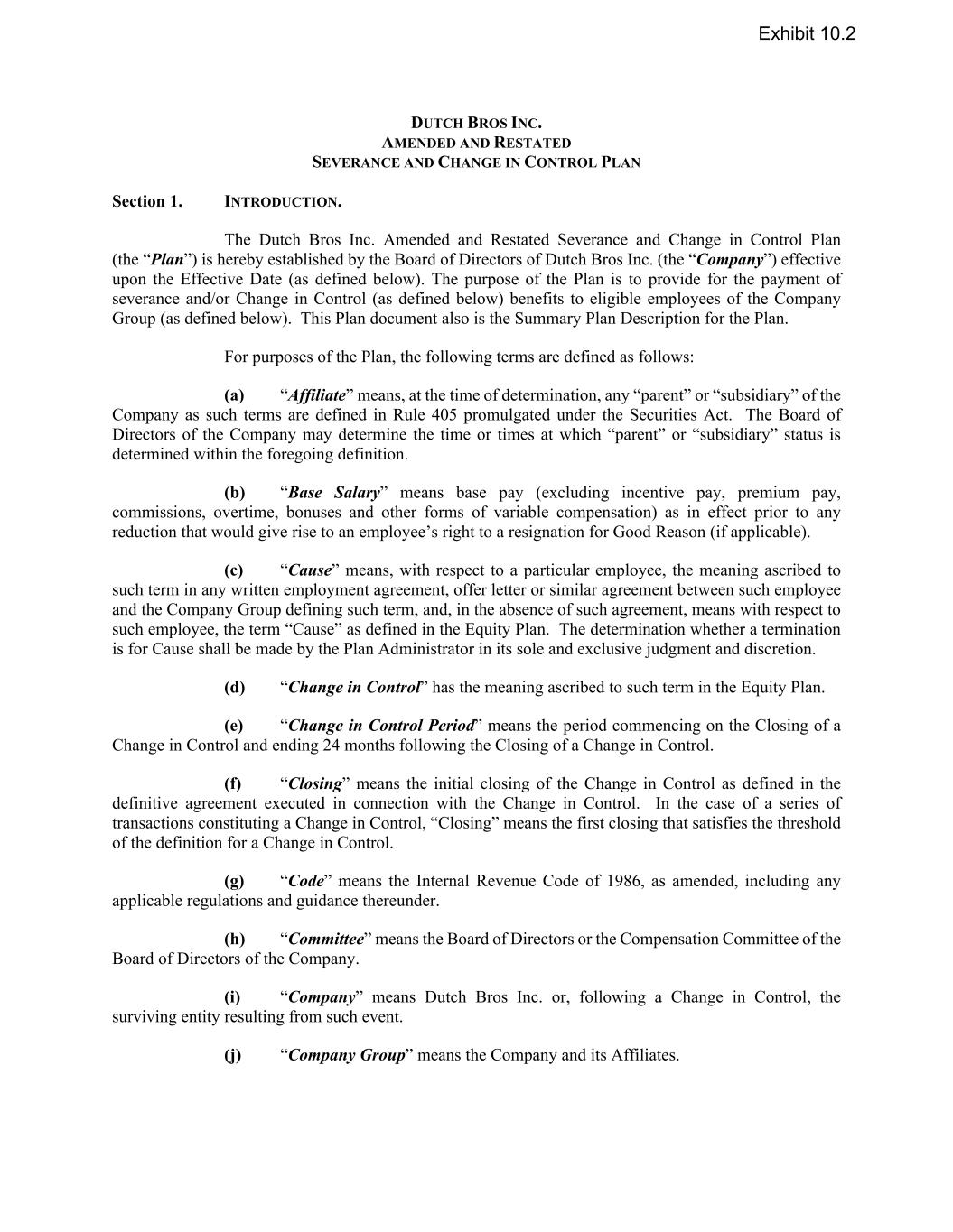 DUTCH BROS INC. AMENDED AND RESTATED SEVERANCE AND CHANGE IN CONTROL PLAN Section 1. INTRODUCTION. The Dutch Bros Inc. Amended and Restated Severance and Change in Control Plan (the “Plan”) is hereby established by the Board of Directors of Dutch Bros Inc. (the “Company”) effective upon the Effective Date (as defined below). The purpose of the Plan is to provide for the payment of severance and/or Change in Control (as defined below) benefits to eligible employees of the Company Group (as defined below). This Plan document also is the Summary Plan Description for the Plan. For purposes of the Plan, the following terms are defined as follows: (a) “Affiliate” means, at the time of determination, any “parent” or “subsidiary” of the Company as such terms are defined in Rule 405 promulgated under the Securities Act. The Board of Directors of the Company may determine the time or times at which “parent” or “subsidiary” status is determined within the foregoing definition. (b) “Base Salary” means base pay (excluding incentive pay, premium pay, commissions, overtime, bonuses and other forms of variable compensation) as in effect prior to any reduction that would give rise to an employee’s right to a resignation for Good Reason (if applicable). (c) “Cause” means, with respect to a particular employee, the meaning ascribed to such term in any written employment agreement, offer letter or similar agreement between such employee and the Company Group defining such term, and, in the absence of such agreement, means with respect to such employee, the term “Cause” as defined in the Equity Plan. The determination whether a termination is for Cause shall be made by the Plan Administrator in its sole and exclusive judgment and discretion. (d) “Change in Control” has the meaning ascribed to such term in the Equity Plan. (e) “Change in Control Period” means the period commencing on the Closing of a Change in Control and ending 24 months following the Closing of a Change in Control. (f) “Closing” means the initial closing of the Change in Control as defined in the definitive agreement executed in connection with the Change in Control. In the case of a series of transactions constituting a Change in Control, “Closing” means the first closing that satisfies the threshold of the definition for a Change in Control. (g) “Code” means the Internal Revenue Code of 1986, as amended, including any applicable regulations and guidance thereunder. (h) “Committee” means the Board of Directors or the Compensation Committee of the Board of Directors of the Company. (i) “Company” means Dutch Bros Inc. or, following a Change in Control, the surviving entity resulting from such event. (j) “Company Group” means the Company and its Affiliates. Exhibit 10.2