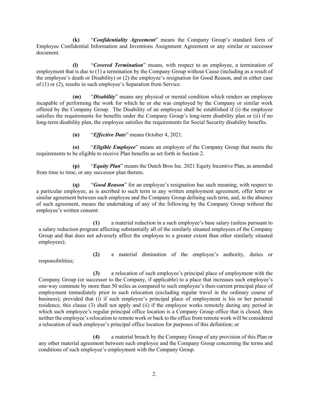 2. (k) “Confidentiality Agreement” means the Company Group’s standard form of Employee Confidential Information and Inventions Assignment Agreement or any similar or successor document. (l) “Covered Termination” means, with respect to an employee, a termination of employment that is due to (1) a termination by the Company Group without Cause (including as a result of the employee’s death or Disability) or (2) the employee’s resignation for Good Reason, and in either case of (1) or (2), results in such employee’s Separation from Service. (m) “Disability” means any physical or mental condition which renders an employee incapable of performing the work for which he or she was employed by the Company or similar work offered by the Company Group. The Disability of an employee shall be established if (i) the employee satisfies the requirements for benefits under the Company Group’s long-term disability plan or (ii) if no long-term disability plan, the employee satisfies the requirements for Social Security disability benefits. (n) “Effective Date” means October 4, 2021. (o) “Eligible Employee” means an employee of the Company Group that meets the requirements to be eligible to receive Plan benefits as set forth in Section 2. (p) “Equity Plan” means the Dutch Bros Inc. 2021 Equity Incentive Plan, as amended from time to time, or any successor plan thereto. (q) “Good Reason” for an employee’s resignation has such meaning, with respect to a particular employee, as is ascribed to such term in any written employment agreement, offer letter or similar agreement between such employee and the Company Group defining such term, and, in the absence of such agreement, means the undertaking of any of the following by the Company Group without the employee’s written consent: (1) a material reduction in a such employee’s base salary (unless pursuant to a salary reduction program affecting substantially all of the similarly situated employees of the Company Group and that does not adversely affect the employee to a greater extent than other similarly situated employees); (2) a material diminution of the employee’s authority, duties or responsibilities; (3) a relocation of such employee’s principal place of employment with the Company Group (or successor to the Company, if applicable) to a place that increases such employee’s one-way commute by more than 50 miles as compared to such employee’s then-current principal place of employment immediately prior to such relocation (excluding regular travel in the ordinary course of business); provided that (i) if such employee’s principal place of employment is his or her personal residence, this clause (3) shall not apply and (ii) if the employee works remotely during any period in which such employee’s regular principal office location is a Company Group office that is closed, then neither the employee’s relocation to remote work or back to the office from remote work will be considered a relocation of such employee’s principal office location for purposes of this definition; or (4) a material breach by the Company Group of any provision of this Plan or any other material agreement between such employee and the Company Group concerning the terms and conditions of such employee’s employment with the Company Group.