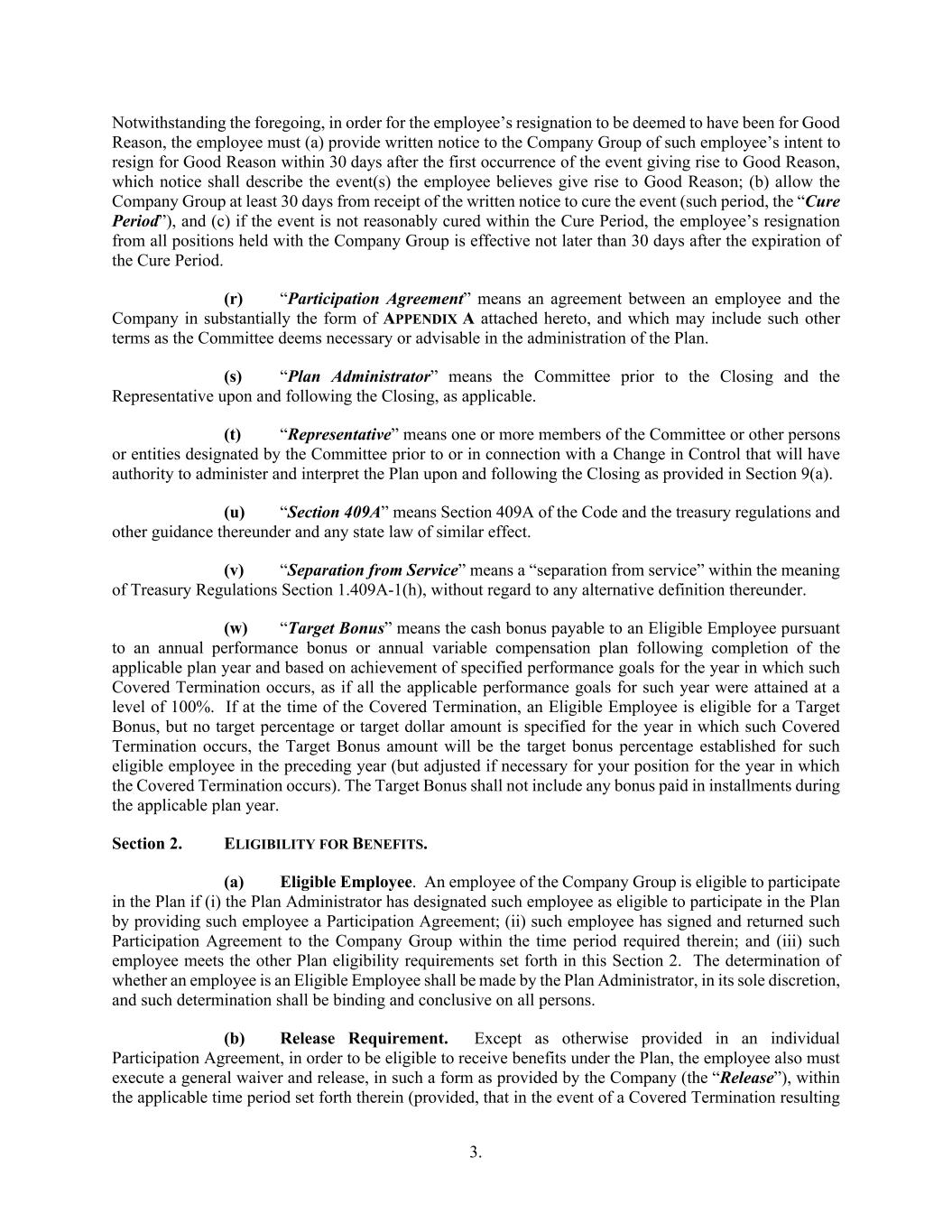 3. Notwithstanding the foregoing, in order for the employee’s resignation to be deemed to have been for Good Reason, the employee must (a) provide written notice to the Company Group of such employee’s intent to resign for Good Reason within 30 days after the first occurrence of the event giving rise to Good Reason, which notice shall describe the event(s) the employee believes give rise to Good Reason; (b) allow the Company Group at least 30 days from receipt of the written notice to cure the event (such period, the “Cure Period”), and (c) if the event is not reasonably cured within the Cure Period, the employee’s resignation from all positions held with the Company Group is effective not later than 30 days after the expiration of the Cure Period. (r) “Participation Agreement” means an agreement between an employee and the Company in substantially the form of APPENDIX A attached hereto, and which may include such other terms as the Committee deems necessary or advisable in the administration of the Plan. (s) “Plan Administrator” means the Committee prior to the Closing and the Representative upon and following the Closing, as applicable. (t) “Representative” means one or more members of the Committee or other persons or entities designated by the Committee prior to or in connection with a Change in Control that will have authority to administer and interpret the Plan upon and following the Closing as provided in Section 9(a). (u) “Section 409A” means Section 409A of the Code and the treasury regulations and other guidance thereunder and any state law of similar effect. (v) “Separation from Service” means a “separation from service” within the meaning of Treasury Regulations Section 1.409A-1(h), without regard to any alternative definition thereunder. (w) “Target Bonus” means the cash bonus payable to an Eligible Employee pursuant to an annual performance bonus or annual variable compensation plan following completion of the applicable plan year and based on achievement of specified performance goals for the year in which such Covered Termination occurs, as if all the applicable performance goals for such year were attained at a level of 100%. If at the time of the Covered Termination, an Eligible Employee is eligible for a Target Bonus, but no target percentage or target dollar amount is specified for the year in which such Covered Termination occurs, the Target Bonus amount will be the target bonus percentage established for such eligible employee in the preceding year (but adjusted if necessary for your position for the year in which the Covered Termination occurs). The Target Bonus shall not include any bonus paid in installments during the applicable plan year. Section 2. ELIGIBILITY FOR BENEFITS. (a) Eligible Employee. An employee of the Company Group is eligible to participate in the Plan if (i) the Plan Administrator has designated such employee as eligible to participate in the Plan by providing such employee a Participation Agreement; (ii) such employee has signed and returned such Participation Agreement to the Company Group within the time period required therein; and (iii) such employee meets the other Plan eligibility requirements set forth in this Section 2. The determination of whether an employee is an Eligible Employee shall be made by the Plan Administrator, in its sole discretion, and such determination shall be binding and conclusive on all persons. (b) Release Requirement. Except as otherwise provided in an individual Participation Agreement, in order to be eligible to receive benefits under the Plan, the employee also must execute a general waiver and release, in such a form as provided by the Company (the “Release”), within the applicable time period set forth therein (provided, that in the event of a Covered Termination resulting