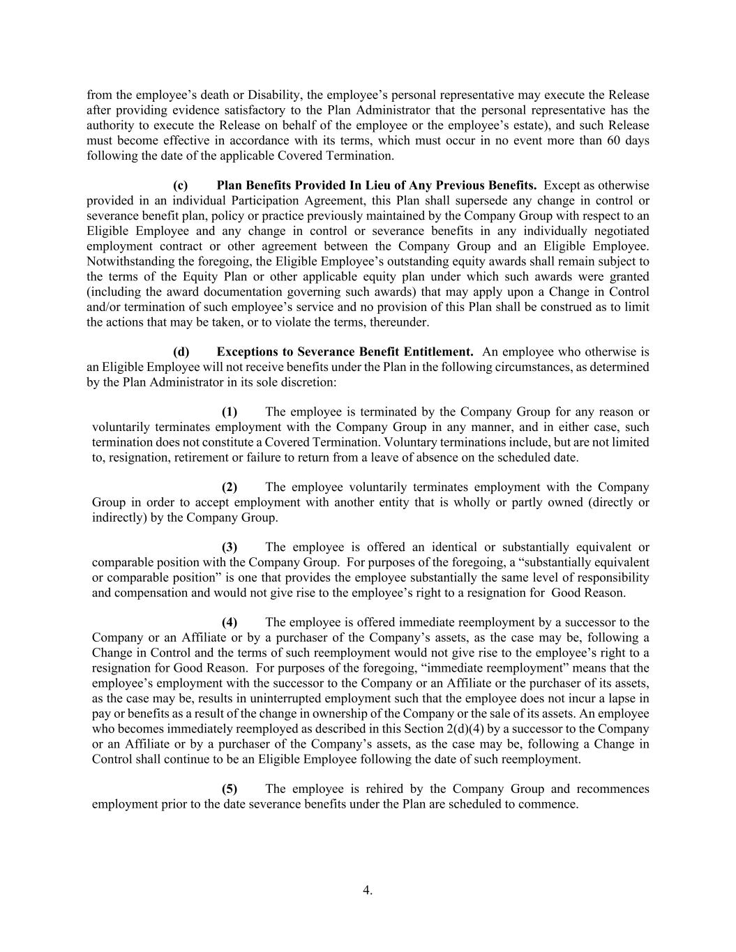 4. from the employee’s death or Disability, the employee’s personal representative may execute the Release after providing evidence satisfactory to the Plan Administrator that the personal representative has the authority to execute the Release on behalf of the employee or the employee’s estate), and such Release must become effective in accordance with its terms, which must occur in no event more than 60 days following the date of the applicable Covered Termination. (c) Plan Benefits Provided In Lieu of Any Previous Benefits. Except as otherwise provided in an individual Participation Agreement, this Plan shall supersede any change in control or severance benefit plan, policy or practice previously maintained by the Company Group with respect to an Eligible Employee and any change in control or severance benefits in any individually negotiated employment contract or other agreement between the Company Group and an Eligible Employee. Notwithstanding the foregoing, the Eligible Employee’s outstanding equity awards shall remain subject to the terms of the Equity Plan or other applicable equity plan under which such awards were granted (including the award documentation governing such awards) that may apply upon a Change in Control and/or termination of such employee’s service and no provision of this Plan shall be construed as to limit the actions that may be taken, or to violate the terms, thereunder. (d) Exceptions to Severance Benefit Entitlement. An employee who otherwise is an Eligible Employee will not receive benefits under the Plan in the following circumstances, as determined by the Plan Administrator in its sole discretion: (1) The employee is terminated by the Company Group for any reason or voluntarily terminates employment with the Company Group in any manner, and in either case, such termination does not constitute a Covered Termination. Voluntary terminations include, but are not limited to, resignation, retirement or failure to return from a leave of absence on the scheduled date. (2) The employee voluntarily terminates employment with the Company Group in order to accept employment with another entity that is wholly or partly owned (directly or indirectly) by the Company Group. (3) The employee is offered an identical or substantially equivalent or comparable position with the Company Group. For purposes of the foregoing, a “substantially equivalent or comparable position” is one that provides the employee substantially the same level of responsibility and compensation and would not give rise to the employee’s right to a resignation for Good Reason. (4) The employee is offered immediate reemployment by a successor to the Company or an Affiliate or by a purchaser of the Company’s assets, as the case may be, following a Change in Control and the terms of such reemployment would not give rise to the employee’s right to a resignation for Good Reason. For purposes of the foregoing, “immediate reemployment” means that the employee’s employment with the successor to the Company or an Affiliate or the purchaser of its assets, as the case may be, results in uninterrupted employment such that the employee does not incur a lapse in pay or benefits as a result of the change in ownership of the Company or the sale of its assets. An employee who becomes immediately reemployed as described in this Section 2(d)(4) by a successor to the Company or an Affiliate or by a purchaser of the Company’s assets, as the case may be, following a Change in Control shall continue to be an Eligible Employee following the date of such reemployment. (5) The employee is rehired by the Company Group and recommences employment prior to the date severance benefits under the Plan are scheduled to commence.