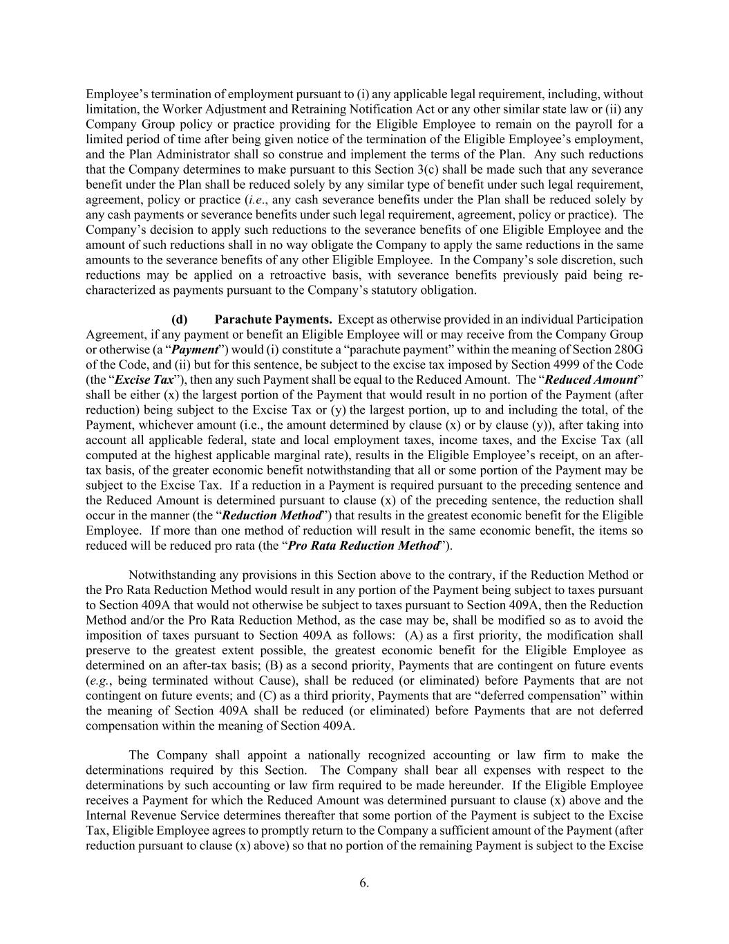 6. Employee’s termination of employment pursuant to (i) any applicable legal requirement, including, without limitation, the Worker Adjustment and Retraining Notification Act or any other similar state law or (ii) any Company Group policy or practice providing for the Eligible Employee to remain on the payroll for a limited period of time after being given notice of the termination of the Eligible Employee’s employment, and the Plan Administrator shall so construe and implement the terms of the Plan. Any such reductions that the Company determines to make pursuant to this Section 3(c) shall be made such that any severance benefit under the Plan shall be reduced solely by any similar type of benefit under such legal requirement, agreement, policy or practice (i.e., any cash severance benefits under the Plan shall be reduced solely by any cash payments or severance benefits under such legal requirement, agreement, policy or practice). The Company’s decision to apply such reductions to the severance benefits of one Eligible Employee and the amount of such reductions shall in no way obligate the Company to apply the same reductions in the same amounts to the severance benefits of any other Eligible Employee. In the Company’s sole discretion, such reductions may be applied on a retroactive basis, with severance benefits previously paid being re- characterized as payments pursuant to the Company’s statutory obligation. (d) Parachute Payments. Except as otherwise provided in an individual Participation Agreement, if any payment or benefit an Eligible Employee will or may receive from the Company Group or otherwise (a “Payment”) would (i) constitute a “parachute payment” within the meaning of Section 280G of the Code, and (ii) but for this sentence, be subject to the excise tax imposed by Section 4999 of the Code (the “Excise Tax”), then any such Payment shall be equal to the Reduced Amount. The “Reduced Amount” shall be either (x) the largest portion of the Payment that would result in no portion of the Payment (after reduction) being subject to the Excise Tax or (y) the largest portion, up to and including the total, of the Payment, whichever amount (i.e., the amount determined by clause (x) or by clause (y)), after taking into account all applicable federal, state and local employment taxes, income taxes, and the Excise Tax (all computed at the highest applicable marginal rate), results in the Eligible Employee’s receipt, on an after- tax basis, of the greater economic benefit notwithstanding that all or some portion of the Payment may be subject to the Excise Tax. If a reduction in a Payment is required pursuant to the preceding sentence and the Reduced Amount is determined pursuant to clause (x) of the preceding sentence, the reduction shall occur in the manner (the “Reduction Method”) that results in the greatest economic benefit for the Eligible Employee. If more than one method of reduction will result in the same economic benefit, the items so reduced will be reduced pro rata (the “Pro Rata Reduction Method”). Notwithstanding any provisions in this Section above to the contrary, if the Reduction Method or the Pro Rata Reduction Method would result in any portion of the Payment being subject to taxes pursuant to Section 409A that would not otherwise be subject to taxes pursuant to Section 409A, then the Reduction Method and/or the Pro Rata Reduction Method, as the case may be, shall be modified so as to avoid the imposition of taxes pursuant to Section 409A as follows: (A) as a first priority, the modification shall preserve to the greatest extent possible, the greatest economic benefit for the Eligible Employee as determined on an after-tax basis; (B) as a second priority, Payments that are contingent on future events (e.g., being terminated without Cause), shall be reduced (or eliminated) before Payments that are not contingent on future events; and (C) as a third priority, Payments that are “deferred compensation” within the meaning of Section 409A shall be reduced (or eliminated) before Payments that are not deferred compensation within the meaning of Section 409A. The Company shall appoint a nationally recognized accounting or law firm to make the determinations required by this Section. The Company shall bear all expenses with respect to the determinations by such accounting or law firm required to be made hereunder. If the Eligible Employee receives a Payment for which the Reduced Amount was determined pursuant to clause (x) above and the Internal Revenue Service determines thereafter that some portion of the Payment is subject to the Excise Tax, Eligible Employee agrees to promptly return to the Company a sufficient amount of the Payment (after reduction pursuant to clause (x) above) so that no portion of the remaining Payment is subject to the Excise