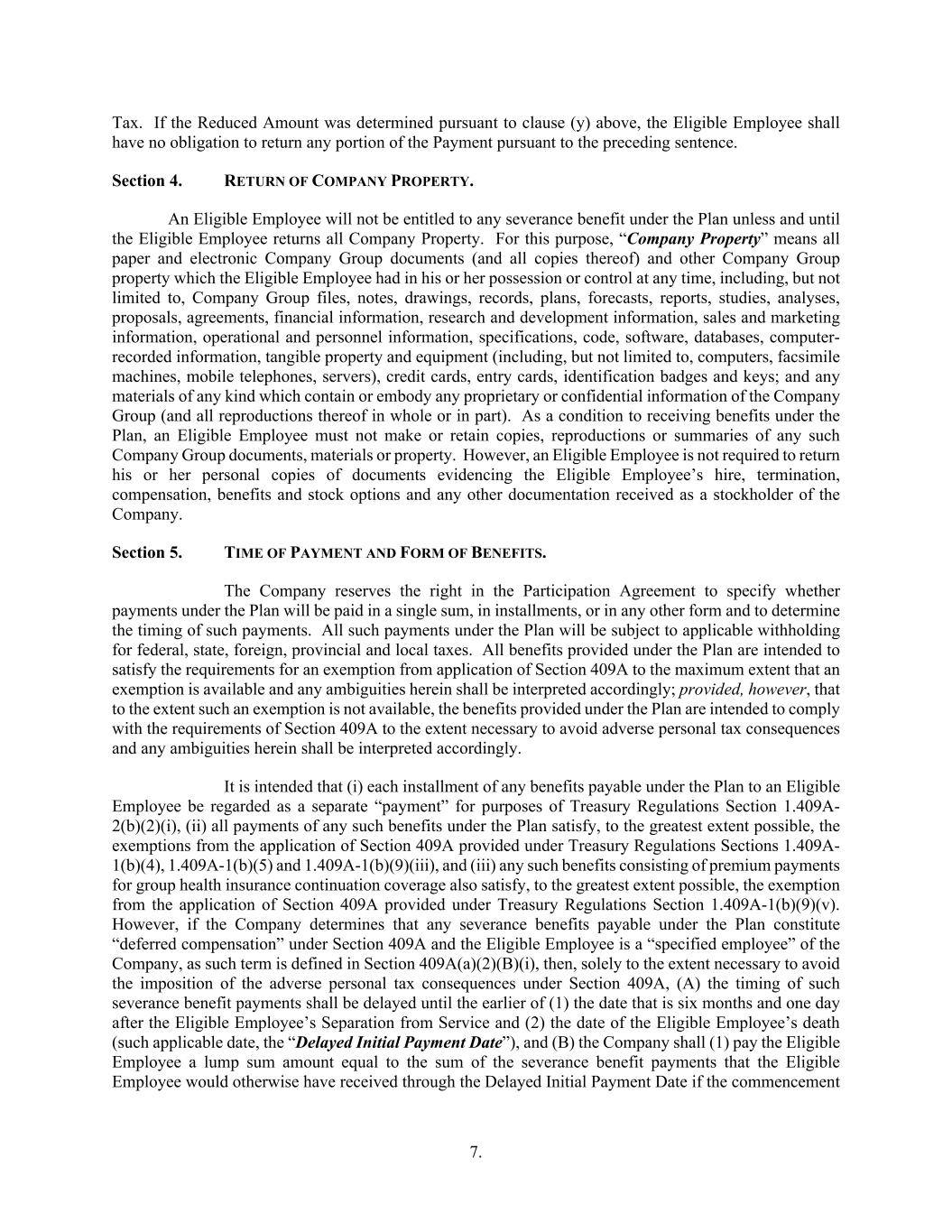 7. Tax. If the Reduced Amount was determined pursuant to clause (y) above, the Eligible Employee shall have no obligation to return any portion of the Payment pursuant to the preceding sentence. Section 4. RETURN OF COMPANY PROPERTY. An Eligible Employee will not be entitled to any severance benefit under the Plan unless and until the Eligible Employee returns all Company Property. For this purpose, “Company Property” means all paper and electronic Company Group documents (and all copies thereof) and other Company Group property which the Eligible Employee had in his or her possession or control at any time, including, but not limited to, Company Group files, notes, drawings, records, plans, forecasts, reports, studies, analyses, proposals, agreements, financial information, research and development information, sales and marketing information, operational and personnel information, specifications, code, software, databases, computer- recorded information, tangible property and equipment (including, but not limited to, computers, facsimile machines, mobile telephones, servers), credit cards, entry cards, identification badges and keys; and any materials of any kind which contain or embody any proprietary or confidential information of the Company Group (and all reproductions thereof in whole or in part). As a condition to receiving benefits under the Plan, an Eligible Employee must not make or retain copies, reproductions or summaries of any such Company Group documents, materials or property. However, an Eligible Employee is not required to return his or her personal copies of documents evidencing the Eligible Employee’s hire, termination, compensation, benefits and stock options and any other documentation received as a stockholder of the Company. Section 5. TIME OF PAYMENT AND FORM OF BENEFITS. The Company reserves the right in the Participation Agreement to specify whether payments under the Plan will be paid in a single sum, in installments, or in any other form and to determine the timing of such payments. All such payments under the Plan will be subject to applicable withholding for federal, state, foreign, provincial and local taxes. All benefits provided under the Plan are intended to satisfy the requirements for an exemption from application of Section 409A to the maximum extent that an exemption is available and any ambiguities herein shall be interpreted accordingly; provided, however, that to the extent such an exemption is not available, the benefits provided under the Plan are intended to comply with the requirements of Section 409A to the extent necessary to avoid adverse personal tax consequences and any ambiguities herein shall be interpreted accordingly. It is intended that (i) each installment of any benefits payable under the Plan to an Eligible Employee be regarded as a separate “payment” for purposes of Treasury Regulations Section 1.409A- 2(b)(2)(i), (ii) all payments of any such benefits under the Plan satisfy, to the greatest extent possible, the exemptions from the application of Section 409A provided under Treasury Regulations Sections 1.409A- 1(b)(4), 1.409A-1(b)(5) and 1.409A-1(b)(9)(iii), and (iii) any such benefits consisting of premium payments for group health insurance continuation coverage also satisfy, to the greatest extent possible, the exemption from the application of Section 409A provided under Treasury Regulations Section 1.409A-1(b)(9)(v). However, if the Company determines that any severance benefits payable under the Plan constitute “deferred compensation” under Section 409A and the Eligible Employee is a “specified employee” of the Company, as such term is defined in Section 409A(a)(2)(B)(i), then, solely to the extent necessary to avoid the imposition of the adverse personal tax consequences under Section 409A, (A) the timing of such severance benefit payments shall be delayed until the earlier of (1) the date that is six months and one day after the Eligible Employee’s Separation from Service and (2) the date of the Eligible Employee’s death (such applicable date, the “Delayed Initial Payment Date”), and (B) the Company shall (1) pay the Eligible Employee a lump sum amount equal to the sum of the severance benefit payments that the Eligible Employee would otherwise have received through the Delayed Initial Payment Date if the commencement