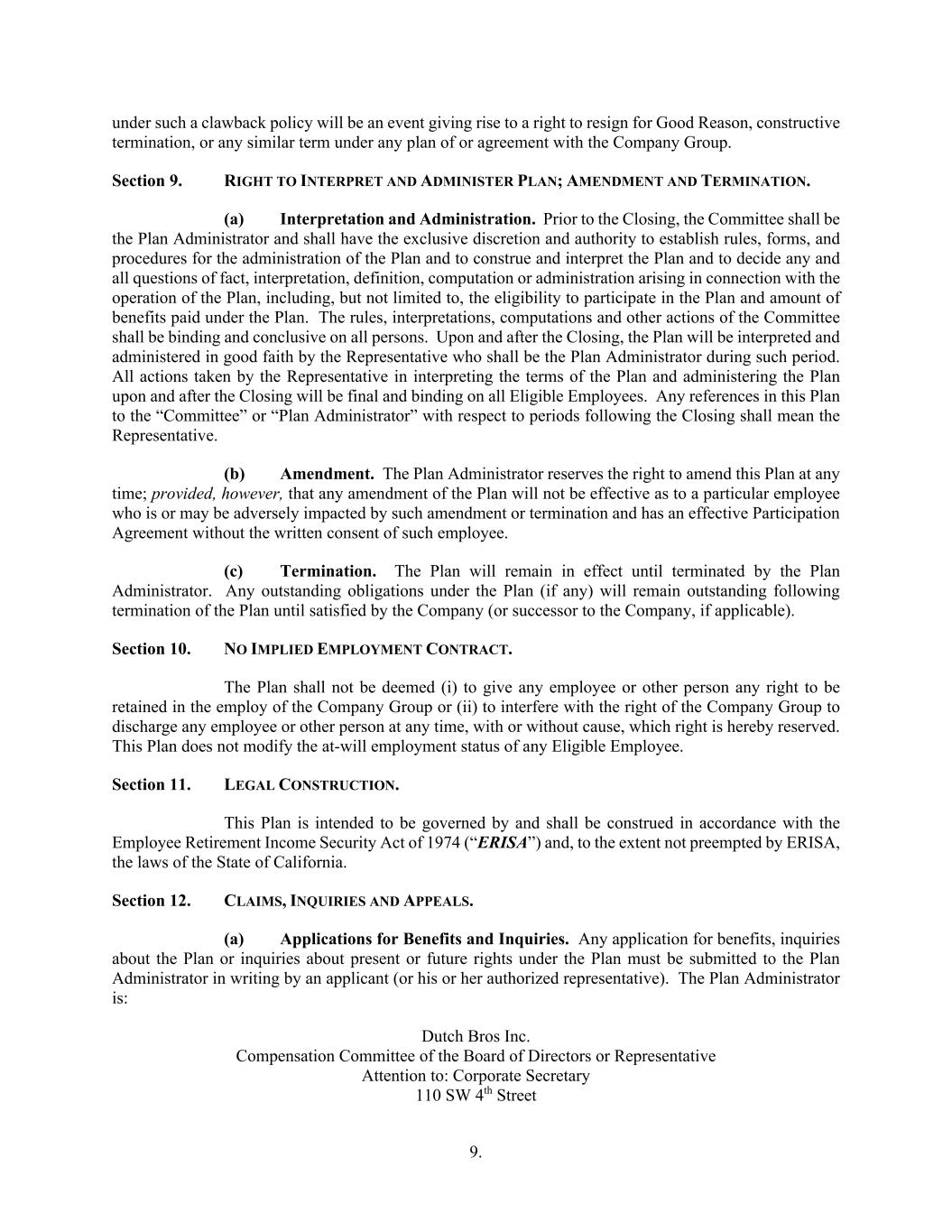 9. under such a clawback policy will be an event giving rise to a right to resign for Good Reason, constructive termination, or any similar term under any plan of or agreement with the Company Group. Section 9. RIGHT TO INTERPRET AND ADMINISTER PLAN; AMENDMENT AND TERMINATION. (a) Interpretation and Administration. Prior to the Closing, the Committee shall be the Plan Administrator and shall have the exclusive discretion and authority to establish rules, forms, and procedures for the administration of the Plan and to construe and interpret the Plan and to decide any and all questions of fact, interpretation, definition, computation or administration arising in connection with the operation of the Plan, including, but not limited to, the eligibility to participate in the Plan and amount of benefits paid under the Plan. The rules, interpretations, computations and other actions of the Committee shall be binding and conclusive on all persons. Upon and after the Closing, the Plan will be interpreted and administered in good faith by the Representative who shall be the Plan Administrator during such period. All actions taken by the Representative in interpreting the terms of the Plan and administering the Plan upon and after the Closing will be final and binding on all Eligible Employees. Any references in this Plan to the “Committee” or “Plan Administrator” with respect to periods following the Closing shall mean the Representative. (b) Amendment. The Plan Administrator reserves the right to amend this Plan at any time; provided, however, that any amendment of the Plan will not be effective as to a particular employee who is or may be adversely impacted by such amendment or termination and has an effective Participation Agreement without the written consent of such employee. (c) Termination. The Plan will remain in effect until terminated by the Plan Administrator. Any outstanding obligations under the Plan (if any) will remain outstanding following termination of the Plan until satisfied by the Company (or successor to the Company, if applicable). Section 10. NO IMPLIED EMPLOYMENT CONTRACT. The Plan shall not be deemed (i) to give any employee or other person any right to be retained in the employ of the Company Group or (ii) to interfere with the right of the Company Group to discharge any employee or other person at any time, with or without cause, which right is hereby reserved. This Plan does not modify the at-will employment status of any Eligible Employee. Section 11. LEGAL CONSTRUCTION. This Plan is intended to be governed by and shall be construed in accordance with the Employee Retirement Income Security Act of 1974 (“ERISA”) and, to the extent not preempted by ERISA, the laws of the State of California. Section 12. CLAIMS, INQUIRIES AND APPEALS. (a) Applications for Benefits and Inquiries. Any application for benefits, inquiries about the Plan or inquiries about present or future rights under the Plan must be submitted to the Plan Administrator in writing by an applicant (or his or her authorized representative). The Plan Administrator is: Dutch Bros Inc. Compensation Committee of the Board of Directors or Representative Attention to: Corporate Secretary 110 SW 4th Street