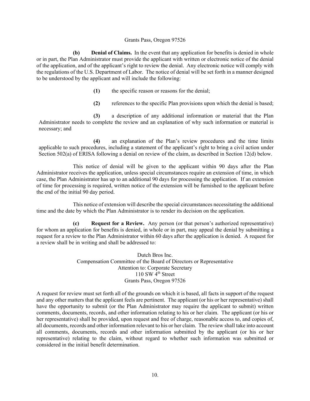 10. Grants Pass, Oregon 97526 (b) Denial of Claims. In the event that any application for benefits is denied in whole or in part, the Plan Administrator must provide the applicant with written or electronic notice of the denial of the application, and of the applicant’s right to review the denial. Any electronic notice will comply with the regulations of the U.S. Department of Labor. The notice of denial will be set forth in a manner designed to be understood by the applicant and will include the following: (1) the specific reason or reasons for the denial; (2) references to the specific Plan provisions upon which the denial is based; (3) a description of any additional information or material that the Plan Administrator needs to complete the review and an explanation of why such information or material is necessary; and (4) an explanation of the Plan’s review procedures and the time limits applicable to such procedures, including a statement of the applicant’s right to bring a civil action under Section 502(a) of ERISA following a denial on review of the claim, as described in Section 12(d) below. This notice of denial will be given to the applicant within 90 days after the Plan Administrator receives the application, unless special circumstances require an extension of time, in which case, the Plan Administrator has up to an additional 90 days for processing the application. If an extension of time for processing is required, written notice of the extension will be furnished to the applicant before the end of the initial 90 day period. This notice of extension will describe the special circumstances necessitating the additional time and the date by which the Plan Administrator is to render its decision on the application. (c) Request for a Review. Any person (or that person’s authorized representative) for whom an application for benefits is denied, in whole or in part, may appeal the denial by submitting a request for a review to the Plan Administrator within 60 days after the application is denied. A request for a review shall be in writing and shall be addressed to: Dutch Bros Inc. Compensation Committee of the Board of Directors or Representative Attention to: Corporate Secretary 110 SW 4th Street Grants Pass, Oregon 97526 A request for review must set forth all of the grounds on which it is based, all facts in support of the request and any other matters that the applicant feels are pertinent. The applicant (or his or her representative) shall have the opportunity to submit (or the Plan Administrator may require the applicant to submit) written comments, documents, records, and other information relating to his or her claim. The applicant (or his or her representative) shall be provided, upon request and free of charge, reasonable access to, and copies of, all documents, records and other information relevant to his or her claim. The review shall take into account all comments, documents, records and other information submitted by the applicant (or his or her representative) relating to the claim, without regard to whether such information was submitted or considered in the initial benefit determination.