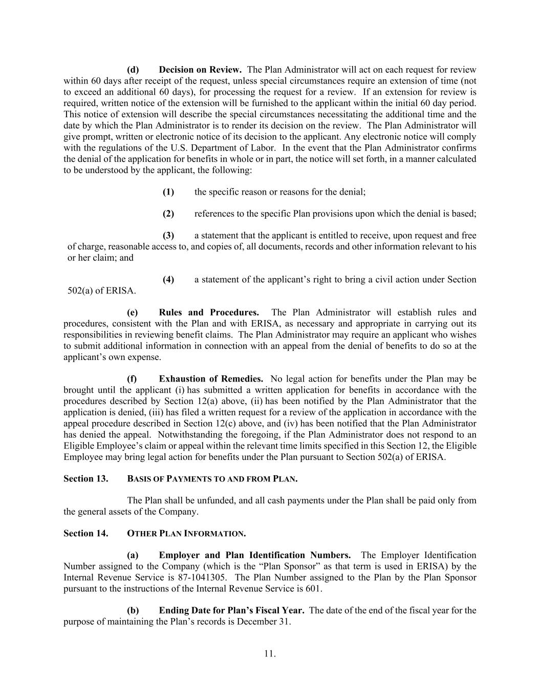 11. (d) Decision on Review. The Plan Administrator will act on each request for review within 60 days after receipt of the request, unless special circumstances require an extension of time (not to exceed an additional 60 days), for processing the request for a review. If an extension for review is required, written notice of the extension will be furnished to the applicant within the initial 60 day period. This notice of extension will describe the special circumstances necessitating the additional time and the date by which the Plan Administrator is to render its decision on the review. The Plan Administrator will give prompt, written or electronic notice of its decision to the applicant. Any electronic notice will comply with the regulations of the U.S. Department of Labor. In the event that the Plan Administrator confirms the denial of the application for benefits in whole or in part, the notice will set forth, in a manner calculated to be understood by the applicant, the following: (1) the specific reason or reasons for the denial; (2) references to the specific Plan provisions upon which the denial is based; (3) a statement that the applicant is entitled to receive, upon request and free of charge, reasonable access to, and copies of, all documents, records and other information relevant to his or her claim; and (4) a statement of the applicant’s right to bring a civil action under Section 502(a) of ERISA. (e) Rules and Procedures. The Plan Administrator will establish rules and procedures, consistent with the Plan and with ERISA, as necessary and appropriate in carrying out its responsibilities in reviewing benefit claims. The Plan Administrator may require an applicant who wishes to submit additional information in connection with an appeal from the denial of benefits to do so at the applicant’s own expense. (f) Exhaustion of Remedies. No legal action for benefits under the Plan may be brought until the applicant (i) has submitted a written application for benefits in accordance with the procedures described by Section 12(a) above, (ii) has been notified by the Plan Administrator that the application is denied, (iii) has filed a written request for a review of the application in accordance with the appeal procedure described in Section 12(c) above, and (iv) has been notified that the Plan Administrator has denied the appeal. Notwithstanding the foregoing, if the Plan Administrator does not respond to an Eligible Employee’s claim or appeal within the relevant time limits specified in this Section 12, the Eligible Employee may bring legal action for benefits under the Plan pursuant to Section 502(a) of ERISA. Section 13. BASIS OF PAYMENTS TO AND FROM PLAN. The Plan shall be unfunded, and all cash payments under the Plan shall be paid only from the general assets of the Company. Section 14. OTHER PLAN INFORMATION. (a) Employer and Plan Identification Numbers. The Employer Identification Number assigned to the Company (which is the “Plan Sponsor” as that term is used in ERISA) by the Internal Revenue Service is 87-1041305. The Plan Number assigned to the Plan by the Plan Sponsor pursuant to the instructions of the Internal Revenue Service is 601. (b) Ending Date for Plan’s Fiscal Year. The date of the end of the fiscal year for the purpose of maintaining the Plan’s records is December 31.