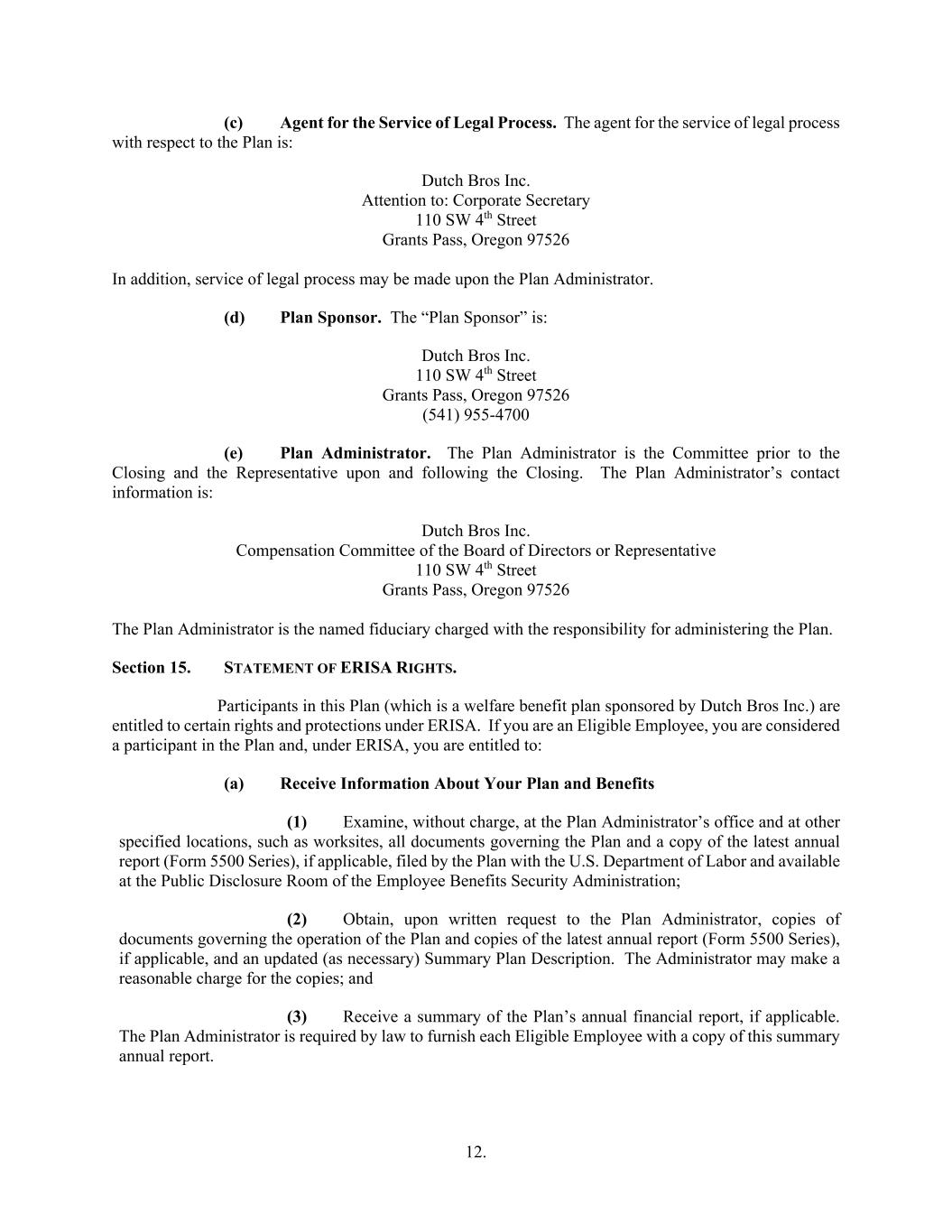 12. (c) Agent for the Service of Legal Process. The agent for the service of legal process with respect to the Plan is: Dutch Bros Inc. Attention to: Corporate Secretary 110 SW 4th Street Grants Pass, Oregon 97526 In addition, service of legal process may be made upon the Plan Administrator. (d) Plan Sponsor. The “Plan Sponsor” is: Dutch Bros Inc. 110 SW 4th Street Grants Pass, Oregon 97526 (541) 955-4700 (e) Plan Administrator. The Plan Administrator is the Committee prior to the Closing and the Representative upon and following the Closing. The Plan Administrator’s contact information is: Dutch Bros Inc. Compensation Committee of the Board of Directors or Representative 110 SW 4th Street Grants Pass, Oregon 97526 The Plan Administrator is the named fiduciary charged with the responsibility for administering the Plan. Section 15. STATEMENT OF ERISA RIGHTS. Participants in this Plan (which is a welfare benefit plan sponsored by Dutch Bros Inc.) are entitled to certain rights and protections under ERISA. If you are an Eligible Employee, you are considered a participant in the Plan and, under ERISA, you are entitled to: (a) Receive Information About Your Plan and Benefits (1) Examine, without charge, at the Plan Administrator’s office and at other specified locations, such as worksites, all documents governing the Plan and a copy of the latest annual report (Form 5500 Series), if applicable, filed by the Plan with the U.S. Department of Labor and available at the Public Disclosure Room of the Employee Benefits Security Administration; (2) Obtain, upon written request to the Plan Administrator, copies of documents governing the operation of the Plan and copies of the latest annual report (Form 5500 Series), if applicable, and an updated (as necessary) Summary Plan Description. The Administrator may make a reasonable charge for the copies; and (3) Receive a summary of the Plan’s annual financial report, if applicable. The Plan Administrator is required by law to furnish each Eligible Employee with a copy of this summary annual report.