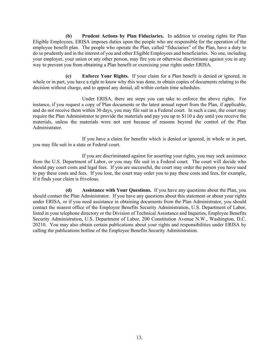 13. (b) Prudent Actions by Plan Fiduciaries. In addition to creating rights for Plan Eligible Employees, ERISA imposes duties upon the people who are responsible for the operation of the employee benefit plan. The people who operate the Plan, called “fiduciaries” of the Plan, have a duty to do so prudently and in the interest of you and other Eligible Employees and beneficiaries. No one, including your employer, your union or any other person, may fire you or otherwise discriminate against you in any way to prevent you from obtaining a Plan benefit or exercising your rights under ERISA. (c) Enforce Your Rights. If your claim for a Plan benefit is denied or ignored, in whole or in part, you have a right to know why this was done, to obtain copies of documents relating to the decision without charge, and to appeal any denial, all within certain time schedules. Under ERISA, there are steps you can take to enforce the above rights. For instance, if you request a copy of Plan documents or the latest annual report from the Plan, if applicable, and do not receive them within 30 days, you may file suit in a Federal court. In such a case, the court may require the Plan Administrator to provide the materials and pay you up to $110 a day until you receive the materials, unless the materials were not sent because of reasons beyond the control of the Plan Administrator. If you have a claim for benefits which is denied or ignored, in whole or in part, you may file suit in a state or Federal court. If you are discriminated against for asserting your rights, you may seek assistance from the U.S. Department of Labor, or you may file suit in a Federal court. The court will decide who should pay court costs and legal fees. If you are successful, the court may order the person you have sued to pay these costs and fees. If you lose, the court may order you to pay these costs and fees, for example, if it finds your claim is frivolous. (d) Assistance with Your Questions. If you have any questions about the Plan, you should contact the Plan Administrator. If you have any questions about this statement or about your rights under ERISA, or if you need assistance in obtaining documents from the Plan Administrator, you should contact the nearest office of the Employee Benefits Security Administration, U.S. Department of Labor, listed in your telephone directory or the Division of Technical Assistance and Inquiries, Employee Benefits Security Administration, U.S. Department of Labor, 200 Constitution Avenue N.W., Washington, D.C. 20210. You may also obtain certain publications about your rights and responsibilities under ERISA by calling the publications hotline of the Employee Benefits Security Administration.