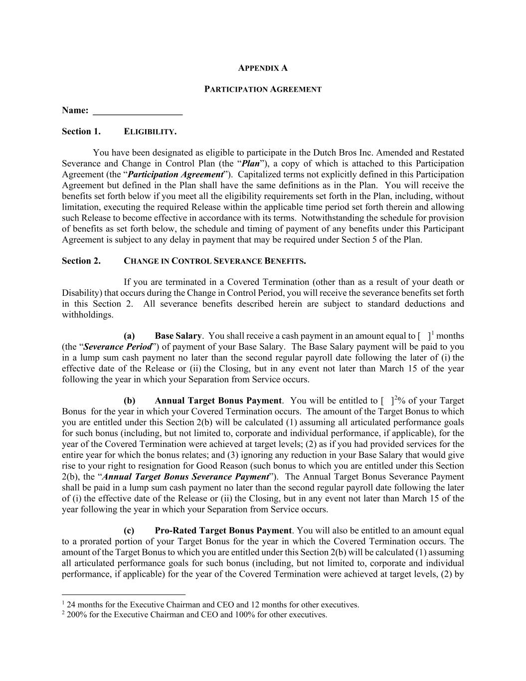 APPENDIX A PARTICIPATION AGREEMENT Name: ___________________ Section 1. ELIGIBILITY. You have been designated as eligible to participate in the Dutch Bros Inc. Amended and Restated Severance and Change in Control Plan (the “Plan”), a copy of which is attached to this Participation Agreement (the “Participation Agreement”). Capitalized terms not explicitly defined in this Participation Agreement but defined in the Plan shall have the same definitions as in the Plan. You will receive the benefits set forth below if you meet all the eligibility requirements set forth in the Plan, including, without limitation, executing the required Release within the applicable time period set forth therein and allowing such Release to become effective in accordance with its terms. Notwithstanding the schedule for provision of benefits as set forth below, the schedule and timing of payment of any benefits under this Participant Agreement is subject to any delay in payment that may be required under Section 5 of the Plan. Section 2. CHANGE IN CONTROL SEVERANCE BENEFITS. If you are terminated in a Covered Termination (other than as a result of your death or Disability) that occurs during the Change in Control Period, you will receive the severance benefits set forth in this Section 2. All severance benefits described herein are subject to standard deductions and withholdings. (a) Base Salary. You shall receive a cash payment in an amount equal to [ ]1 months (the “Severance Period”) of payment of your Base Salary. The Base Salary payment will be paid to you in a lump sum cash payment no later than the second regular payroll date following the later of (i) the effective date of the Release or (ii) the Closing, but in any event not later than March 15 of the year following the year in which your Separation from Service occurs. (b) Annual Target Bonus Payment. You will be entitled to [ ]2% of your Target Bonus for the year in which your Covered Termination occurs. The amount of the Target Bonus to which you are entitled under this Section 2(b) will be calculated (1) assuming all articulated performance goals for such bonus (including, but not limited to, corporate and individual performance, if applicable), for the year of the Covered Termination were achieved at target levels; (2) as if you had provided services for the entire year for which the bonus relates; and (3) ignoring any reduction in your Base Salary that would give rise to your right to resignation for Good Reason (such bonus to which you are entitled under this Section 2(b), the “Annual Target Bonus Severance Payment”). The Annual Target Bonus Severance Payment shall be paid in a lump sum cash payment no later than the second regular payroll date following the later of (i) the effective date of the Release or (ii) the Closing, but in any event not later than March 15 of the year following the year in which your Separation from Service occurs. (c) Pro-Rated Target Bonus Payment. You will also be entitled to an amount equal to a prorated portion of your Target Bonus for the year in which the Covered Termination occurs. The amount of the Target Bonus to which you are entitled under this Section 2(b) will be calculated (1) assuming all articulated performance goals for such bonus (including, but not limited to, corporate and individual performance, if applicable) for the year of the Covered Termination were achieved at target levels, (2) by 1 24 months for the Executive Chairman and CEO and 12 months for other executives. 2 200% for the Executive Chairman and CEO and 100% for other executives.