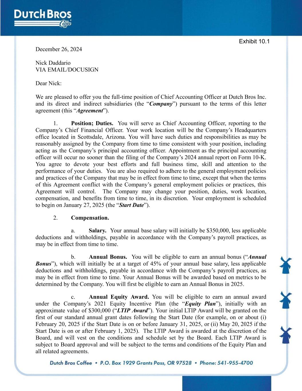 December 26, 2024 Nick Daddario VIA EMAIL/DOCUSIGN Dear Nick: We are pleased to offer you the full-time position of Chief Accounting Officer at Dutch Bros Inc. and its direct and indirect subsidiaries (the “Company”) pursuant to the terms of this letter agreement (this “Agreement”). 1. Position; Duties. You will serve as Chief Accounting Officer, reporting to the Company’s Chief Financial Officer. Your work location will be the Company’s Headquarters office located in Scottsdale, Arizona. You will have such duties and responsibilities as may be reasonably assigned by the Company from time to time consistent with your position, including acting as the Company’s principal accounting officer. Appointment as the principal accounting officer will occur no sooner than the filing of the Company’s 2024 annual report on Form 10-K. You agree to devote your best efforts and full business time, skill and attention to the performance of your duties. You are also required to adhere to the general employment policies and practices of the Company that may be in effect from time to time, except that when the terms of this Agreement conflict with the Company’s general employment policies or practices, this Agreement will control. The Company may change your position, duties, work location, compensation, and benefits from time to time, in its discretion. Your employment is scheduled to begin on January 27, 2025 (the “Start Date”). 2. Compensation. a. Salary. Your annual base salary will initially be $350,000, less applicable deductions and withholdings, payable in accordance with the Company’s payroll practices, as may be in effect from time to time. b. Annual Bonus. You will be eligible to earn an annual bonus (“Annual Bonus”), which will initially be at a target of 45% of your annual base salary, less applicable deductions and withholdings, payable in accordance with the Company’s payroll practices, as may be in effect from time to time. Your Annual Bonus will be awarded based on metrics to be determined by the Company. You will first be eligible to earn an Annual Bonus in 2025. c. Annual Equity Award. You will be eligible to earn an annual award under the Company’s 2021 Equity Incentive Plan (the “Equity Plan”), initially with an approximate value of $300,000 (“LTIP Award”). Your initial LTIP Award will be granted on the first of our standard annual grant dates following the Start Date (for example, on or about (i) February 20, 2025 if the Start Date is on or before January 31, 2025, or (ii) May 20, 2025 if the Start Date is on or after February 1, 2025). The LTIP Award is awarded at the discretion of the Board, and will vest on the conditions and schedule set by the Board. Each LTIP Award is subject to Board approval and will be subject to the terms and conditions of the Equity Plan and all related agreements. Exhibit 10.1