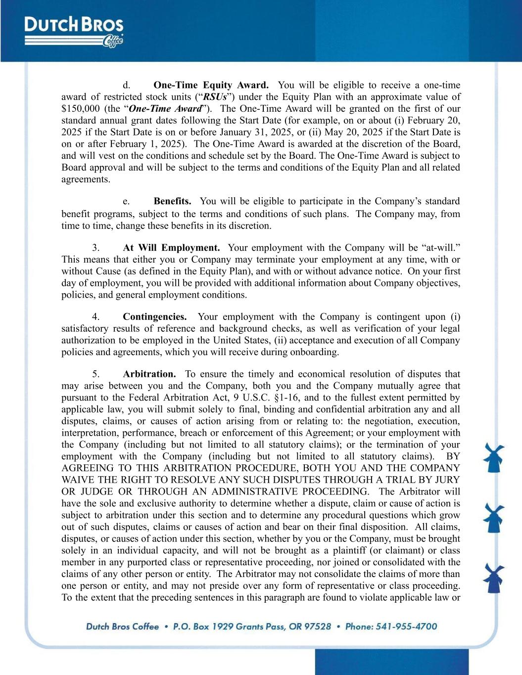 d. One-Time Equity Award. You will be eligible to receive a one-time award of restricted stock units (“RSUs”) under the Equity Plan with an approximate value of $150,000 (the “One-Time Award”). The One-Time Award will be granted on the first of our standard annual grant dates following the Start Date (for example, on or about (i) February 20, 2025 if the Start Date is on or before January 31, 2025, or (ii) May 20, 2025 if the Start Date is on or after February 1, 2025). The One-Time Award is awarded at the discretion of the Board, and will vest on the conditions and schedule set by the Board. The One-Time Award is subject to Board approval and will be subject to the terms and conditions of the Equity Plan and all related agreements. e. Benefits. You will be eligible to participate in the Company’s standard benefit programs, subject to the terms and conditions of such plans. The Company may, from time to time, change these benefits in its discretion. 3. At Will Employment. Your employment with the Company will be “at-will.” This means that either you or Company may terminate your employment at any time, with or without Cause (as defined in the Equity Plan), and with or without advance notice. On your first day of employment, you will be provided with additional information about Company objectives, policies, and general employment conditions. 4. Contingencies. Your employment with the Company is contingent upon (i) satisfactory results of reference and background checks, as well as verification of your legal authorization to be employed in the United States, (ii) acceptance and execution of all Company policies and agreements, which you will receive during onboarding. 5. Arbitration. To ensure the timely and economical resolution of disputes that may arise between you and the Company, both you and the Company mutually agree that pursuant to the Federal Arbitration Act, 9 U.S.C. §1-16, and to the fullest extent permitted by applicable law, you will submit solely to final, binding and confidential arbitration any and all disputes, claims, or causes of action arising from or relating to: the negotiation, execution, interpretation, performance, breach or enforcement of this Agreement; or your employment with the Company (including but not limited to all statutory claims); or the termination of your employment with the Company (including but not limited to all statutory claims). BY AGREEING TO THIS ARBITRATION PROCEDURE, BOTH YOU AND THE COMPANY WAIVE THE RIGHT TO RESOLVE ANY SUCH DISPUTES THROUGH A TRIAL BY JURY OR JUDGE OR THROUGH AN ADMINISTRATIVE PROCEEDING. The Arbitrator will have the sole and exclusive authority to determine whether a dispute, claim or cause of action is subject to arbitration under this section and to determine any procedural questions which grow out of such disputes, claims or causes of action and bear on their final disposition. All claims, disputes, or causes of action under this section, whether by you or the Company, must be brought solely in an individual capacity, and will not be brought as a plaintiff (or claimant) or class member in any purported class or representative proceeding, nor joined or consolidated with the claims of any other person or entity. The Arbitrator may not consolidate the claims of more than one person or entity, and may not preside over any form of representative or class proceeding. To the extent that the preceding sentences in this paragraph are found to violate applicable law or