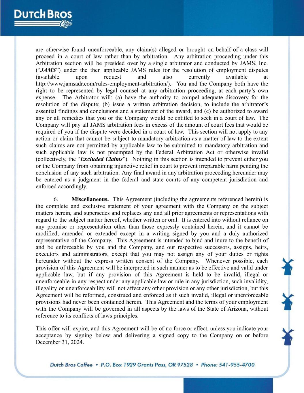 are otherwise found unenforceable, any claim(s) alleged or brought on behalf of a class will proceed in a court of law rather than by arbitration. Any arbitration proceeding under this Arbitration section will be presided over by a single arbitrator and conducted by JAMS, Inc. (“JAMS”) under the then applicable JAMS rules for the resolution of employment disputes (available upon request and also currently available at http://www.jamsadr.com/rules-employment-arbitration/). You and the Company both have the right to be represented by legal counsel at any arbitration proceeding, at each party’s own expense. The Arbitrator will: (a) have the authority to compel adequate discovery for the resolution of the dispute; (b) issue a written arbitration decision, to include the arbitrator’s essential findings and conclusions and a statement of the award; and (c) be authorized to award any or all remedies that you or the Company would be entitled to seek in a court of law. The Company will pay all JAMS arbitration fees in excess of the amount of court fees that would be required of you if the dispute were decided in a court of law. This section will not apply to any action or claim that cannot be subject to mandatory arbitration as a matter of law to the extent such claims are not permitted by applicable law to be submitted to mandatory arbitration and such applicable law is not preempted by the Federal Arbitration Act or otherwise invalid (collectively, the “Excluded Claims”). Nothing in this section is intended to prevent either you or the Company from obtaining injunctive relief in court to prevent irreparable harm pending the conclusion of any such arbitration. Any final award in any arbitration proceeding hereunder may be entered as a judgment in the federal and state courts of any competent jurisdiction and enforced accordingly. 6. Miscellaneous. This Agreement (including the agreements referenced herein) is the complete and exclusive statement of your agreement with the Company on the subject matters herein, and supersedes and replaces any and all prior agreements or representations with regard to the subject matter hereof, whether written or oral. It is entered into without reliance on any promise or representation other than those expressly contained herein, and it cannot be modified, amended or extended except in a writing signed by you and a duly authorized representative of the Company. This Agreement is intended to bind and inure to the benefit of and be enforceable by you and the Company, and our respective successors, assigns, heirs, executors and administrators, except that you may not assign any of your duties or rights hereunder without the express written consent of the Company. Whenever possible, each provision of this Agreement will be interpreted in such manner as to be effective and valid under applicable law, but if any provision of this Agreement is held to be invalid, illegal or unenforceable in any respect under any applicable law or rule in any jurisdiction, such invalidity, illegality or unenforceability will not affect any other provision or any other jurisdiction, but this Agreement will be reformed, construed and enforced as if such invalid, illegal or unenforceable provisions had never been contained herein. This Agreement and the terms of your employment with the Company will be governed in all aspects by the laws of the State of Arizona, without reference to its conflicts of laws principles. This offer will expire, and this Agreement will be of no force or effect, unless you indicate your acceptance by signing below and delivering a signed copy to the Company on or before December 31, 2024.