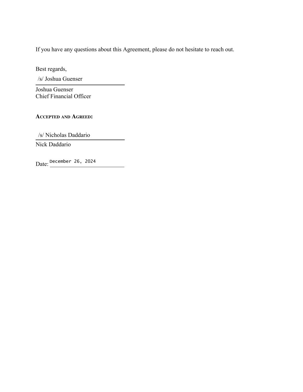 If you have any questions about this Agreement, please do not hesitate to reach out. Best regards, Joshua Guenser Chief Financial Officer ACCEPTED AND AGREED: Nick Daddario Date: _________________________December 26, 2024 /s/ Joshua Guenser /s/ Nicholas Daddario