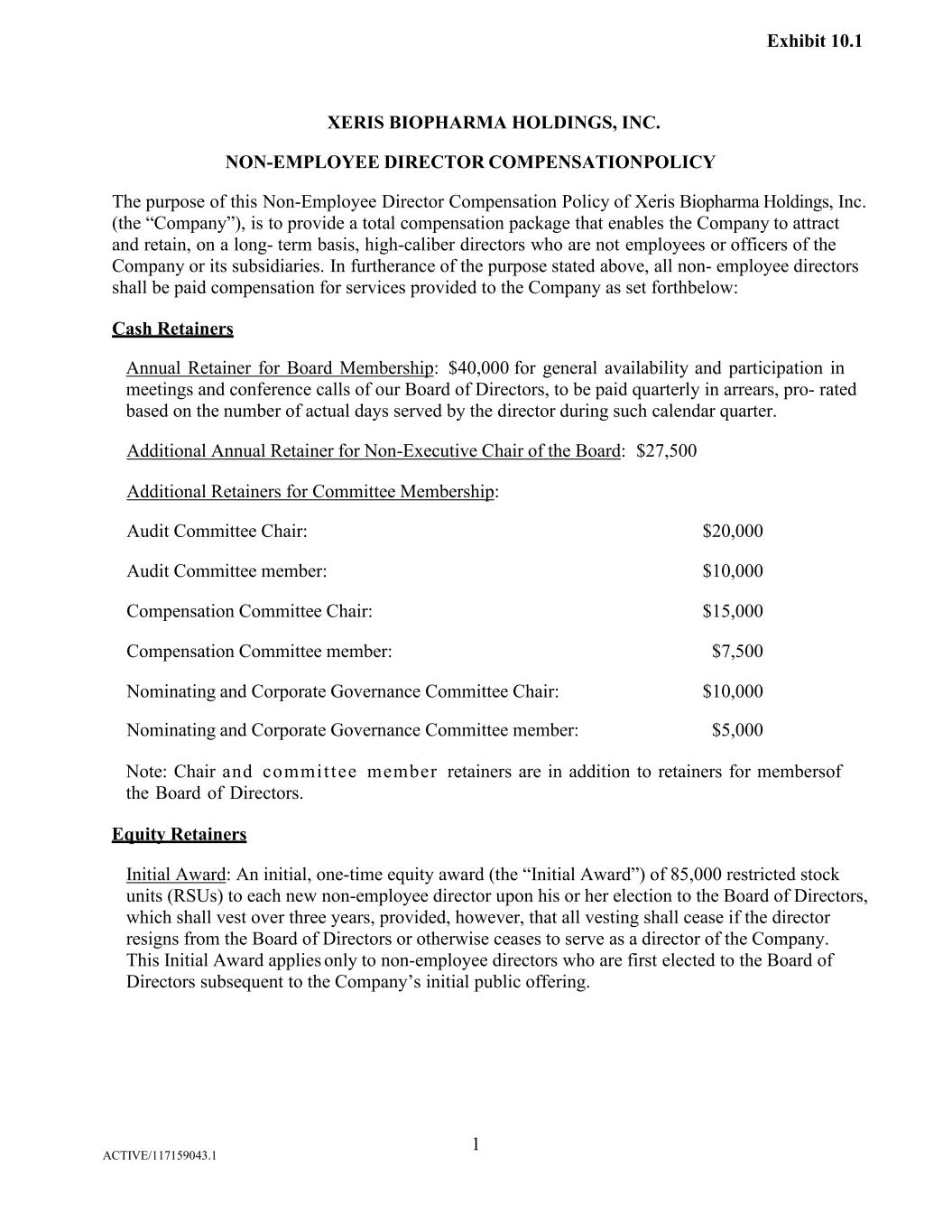 1 ACTIVE/117159043.1 XERIS BIOPHARMA HOLDINGS, INC. NON-EMPLOYEE DIRECTOR COMPENSATION POLICY The purpose of this Non-Employee Director Compensation Policy of Xeris Biopharma Holdings, Inc. (the “Company”), is to provide a total compensation package that enables the Company to attract and retain, on a long- term basis, high-caliber directors who are not employees or officers of the Company or its subsidiaries. In furtherance of the purpose stated above, all non- employee directors shall be paid compensation for services provided to the Company as set forth below: Cash Retainers Annual Retainer for Board Membership: $40,000 for general availability and participation in meetings and conference calls of our Board of Directors, to be paid quarterly in arrears, pro- rated based on the number of actual days served by the director during such calendar quarter. Additional Annual Retainer for Non-Executive Chair of the Board: $27,500 Additional Retainers for Committee Membership: Audit Committee Chair: $20,000 Audit Committee member: $10,000 Compensation Committee Chair: $15,000 Compensation Committee member: $7,500 Nominating and Corporate Governance Committee Chair: $10,000 Nominating and Corporate Governance Committee member: $5,000 Note: Chair and commit tee member retainers are in addition to retainers for members of the Board of Directors. Equity Retainers Initial Award: An initial, one-time equity award (the “Initial Award”) of 85,000 restricted stock units (RSUs) to each new non-employee director upon his or her election to the Board of Directors, which shall vest over three years, provided, however, that all vesting shall cease if the director resigns from the Board of Directors or otherwise ceases to serve as a director of the Company. This Initial Award applies only to non-employee directors who are first elected to the Board of Directors subsequent to the Company’s initial public offering. Exhibit 10.1
