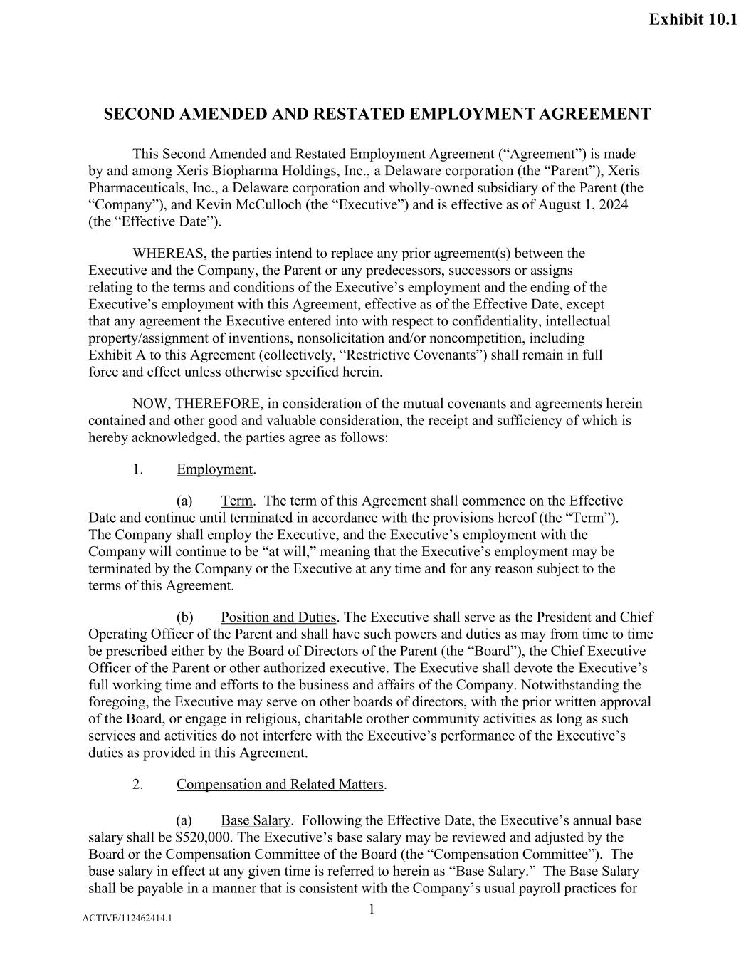 1 ACTIVE/112462414.1 SECOND AMENDED AND RESTATED EMPLOYMENT AGREEMENT This Second Amended and Restated Employment Agreement (“Agreement”) is made by and among Xeris Biopharma Holdings, Inc., a Delaware corporation (the “Parent”), Xeris Pharmaceuticals, Inc., a Delaware corporation and wholly-owned subsidiary of the Parent (the “Company”), and Kevin McCulloch (the “Executive”) and is effective as of August 1, 2024 (the “Effective Date”). WHEREAS, the parties intend to replace any prior agreement(s) between the Executive and the Company, the Parent or any predecessors, successors or assigns relating to the terms and conditions of the Executive’s employment and the ending of the Executive’s employment with this Agreement, effective as of the Effective Date, except that any agreement the Executive entered into with respect to confidentiality, intellectual property/assignment of inventions, nonsolicitation and/or noncompetition, including Exhibit A to this Agreement (collectively, “Restrictive Covenants”) shall remain in full force and effect unless otherwise specified herein. NOW, THEREFORE, in consideration of the mutual covenants and agreements herein contained and other good and valuable consideration, the receipt and sufficiency of which is hereby acknowledged, the parties agree as follows: 1. Employment. (a) Term. The term of this Agreement shall commence on the Effective Date and continue until terminated in accordance with the provisions hereof (the “Term”). The Company shall employ the Executive, and the Executive’s employment with the Company will continue to be “at will,” meaning that the Executive’s employment may be terminated by the Company or the Executive at any time and for any reason subject to the terms of this Agreement. (b) Position and Duties. The Executive shall serve as the President and Chief Operating Officer of the Parent and shall have such powers and duties as may from time to time be prescribed either by the Board of Directors of the Parent (the “Board”), the Chief Executive Officer of the Parent or other authorized executive. The Executive shall devote the Executive’s full working time and efforts to the business and affairs of the Company. Notwithstanding the foregoing, the Executive may serve on other boards of directors, with the prior written approval of the Board, or engage in religious, charitable or other community activities as long as such services and activities do not interfere with the Executive’s performance of the Executive’s duties as provided in this Agreement. 2. Compensation and Related Matters. (a) Base Salary. Following the Effective Date, the Executive’s annual base salary shall be $520,000. The Executive’s base salary may be reviewed and adjusted by the Board or the Compensation Committee of the Board (the “Compensation Committee”). The base salary in effect at any given time is referred to herein as “Base Salary.” The Base Salary shall be payable in a manner that is consistent with the Company’s usual payroll practices for Exhibit 10.1
