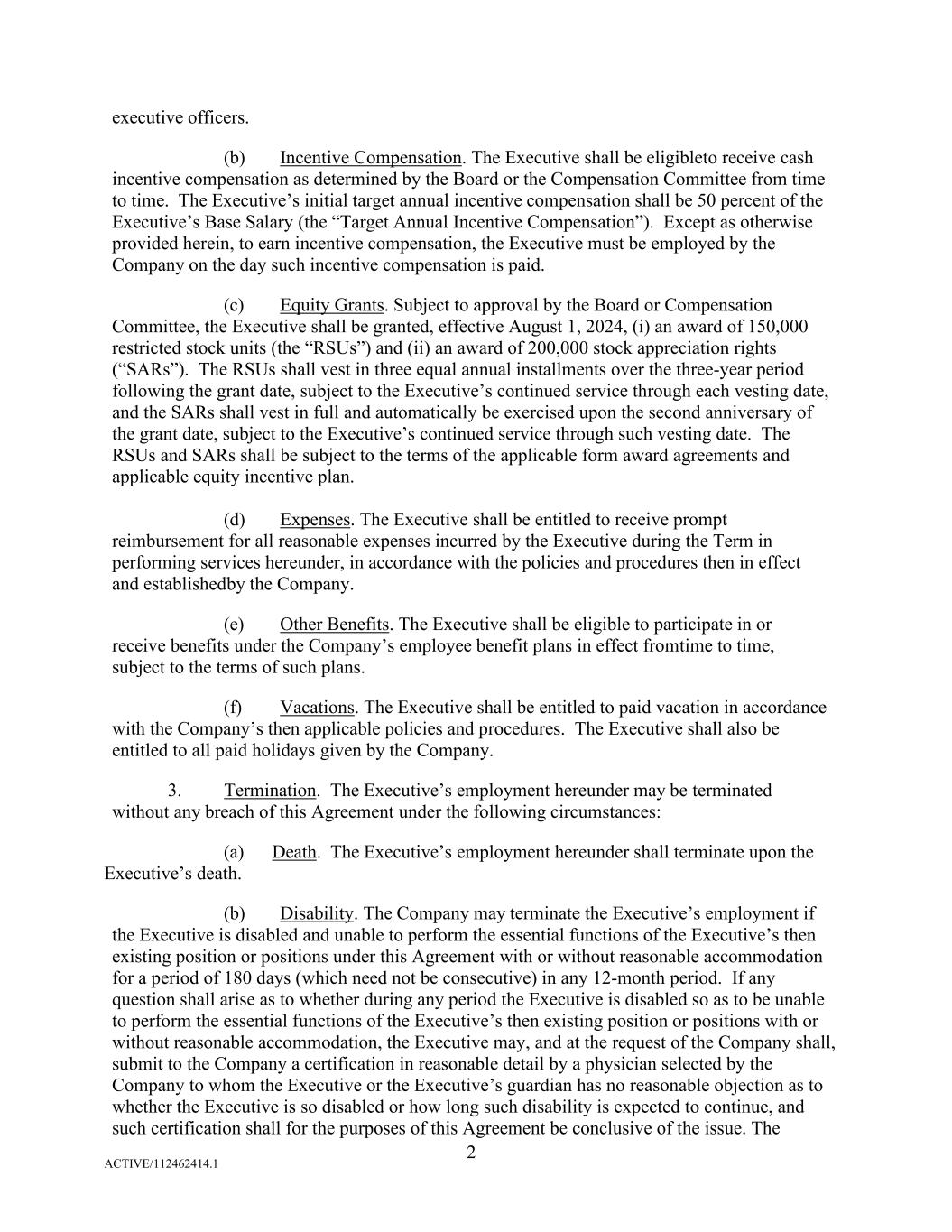 2 ACTIVE/112462414.1 executive officers. (b) Incentive Compensation. The Executive shall be eligible to receive cash incentive compensation as determined by the Board or the Compensation Committee from time to time. The Executive’s initial target annual incentive compensation shall be 50 percent of the Executive’s Base Salary (the “Target Annual Incentive Compensation”). Except as otherwise provided herein, to earn incentive compensation, the Executive must be employed by the Company on the day such incentive compensation is paid. (c) Equity Grants. Subject to approval by the Board or Compensation Committee, the Executive shall be granted, effective August 1, 2024, (i) an award of 150,000 restricted stock units (the “RSUs”) and (ii) an award of 200,000 stock appreciation rights (“SARs”). The RSUs shall vest in three equal annual installments over the three-year period following the grant date, subject to the Executive’s continued service through each vesting date, and the SARs shall vest in full and automatically be exercised upon the second anniversary of the grant date, subject to the Executive’s continued service through such vesting date. The RSUs and SARs shall be subject to the terms of the applicable form award agreements and applicable equity incentive plan. (d) Expenses. The Executive shall be entitled to receive prompt reimbursement for all reasonable expenses incurred by the Executive during the Term in performing services hereunder, in accordance with the policies and procedures then in effect and established by the Company. (e) Other Benefits. The Executive shall be eligible to participate in or receive benefits under the Company’s employee benefit plans in effect from time to time, subject to the terms of such plans. (f) Vacations. The Executive shall be entitled to paid vacation in accordance with the Company’s then applicable policies and procedures. The Executive shall also be entitled to all paid holidays given by the Company. 3. Termination. The Executive’s employment hereunder may be terminated without any breach of this Agreement under the following circumstances: (a) Death. The Executive’s employment hereunder shall terminate upon the Executive’s death. (b) Disability. The Company may terminate the Executive’s employment if the Executive is disabled and unable to perform the essential functions of the Executive’s then existing position or positions under this Agreement with or without reasonable accommodation for a period of 180 days (which need not be consecutive) in any 12-month period. If any question shall arise as to whether during any period the Executive is disabled so as to be unable to perform the essential functions of the Executive’s then existing position or positions with or without reasonable accommodation, the Executive may, and at the request of the Company shall, submit to the Company a certification in reasonable detail by a physician selected by the Company to whom the Executive or the Executive’s guardian has no reasonable objection as to whether the Executive is so disabled or how long such disability is expected to continue, and such certification shall for the purposes of this Agreement be conclusive of the issue. The