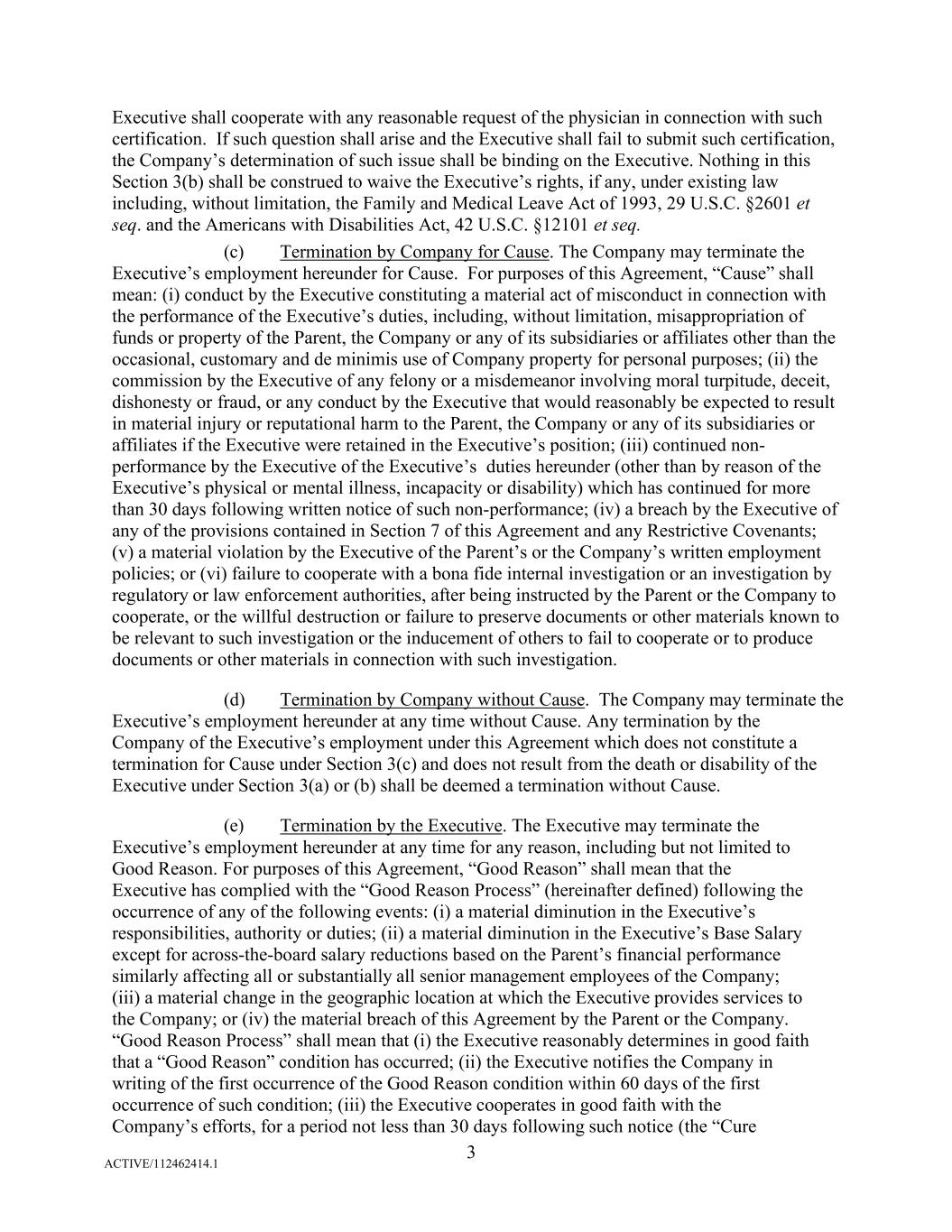 3 ACTIVE/112462414.1 Executive shall cooperate with any reasonable request of the physician in connection with such certification. If such question shall arise and the Executive shall fail to submit such certification, the Company’s determination of such issue shall be binding on the Executive. Nothing in this Section 3(b) shall be construed to waive the Executive’s rights, if any, under existing law including, without limitation, the Family and Medical Leave Act of 1993, 29 U.S.C. §2601 et seq. and the Americans with Disabilities Act, 42 U.S.C. §12101 et seq. (c) Termination by Company for Cause. The Company may terminate the Executive’s employment hereunder for Cause. For purposes of this Agreement, “Cause” shall mean: (i) conduct by the Executive constituting a material act of misconduct in connection with the performance of the Executive’s duties, including, without limitation, misappropriation of funds or property of the Parent, the Company or any of its subsidiaries or affiliates other than the occasional, customary and de minimis use of Company property for personal purposes; (ii) the commission by the Executive of any felony or a misdemeanor involving moral turpitude, deceit, dishonesty or fraud, or any conduct by the Executive that would reasonably be expected to result in material injury or reputational harm to the Parent, the Company or any of its subsidiaries or affiliates if the Executive were retained in the Executive’s position; (iii) continued non- performance by the Executive of the Executive’s duties hereunder (other than by reason of the Executive’s physical or mental illness, incapacity or disability) which has continued for more than 30 days following written notice of such non-performance; (iv) a breach by the Executive of any of the provisions contained in Section 7 of this Agreement and any Restrictive Covenants; (v) a material violation by the Executive of the Parent’s or the Company’s written employment policies; or (vi) failure to cooperate with a bona fide internal investigation or an investigation by regulatory or law enforcement authorities, after being instructed by the Parent or the Company to cooperate, or the willful destruction or failure to preserve documents or other materials known to be relevant to such investigation or the inducement of others to fail to cooperate or to produce documents or other materials in connection with such investigation. (d) Termination by Company without Cause. The Company may terminate the Executive’s employment hereunder at any time without Cause. Any termination by the Company of the Executive’s employment under this Agreement which does not constitute a termination for Cause under Section 3(c) and does not result from the death or disability of the Executive under Section 3(a) or (b) shall be deemed a termination without Cause. (e) Termination by the Executive. The Executive may terminate the Executive’s employment hereunder at any time for any reason, including but not limited to Good Reason. For purposes of this Agreement, “Good Reason” shall mean that the Executive has complied with the “Good Reason Process” (hereinafter defined) following the occurrence of any of the following events: (i) a material diminution in the Executive’s responsibilities, authority or duties; (ii) a material diminution in the Executive’s Base Salary except for across-the-board salary reductions based on the Parent’s financial performance similarly affecting all or substantially all senior management employees of the Company; (iii) a material change in the geographic location at which the Executive provides services to the Company; or (iv) the material breach of this Agreement by the Parent or the Company. “Good Reason Process” shall mean that (i) the Executive reasonably determines in good faith that a “Good Reason” condition has occurred; (ii) the Executive notifies the Company in writing of the first occurrence of the Good Reason condition within 60 days of the first occurrence of such condition; (iii) the Executive cooperates in good faith with the Company’s efforts, for a period not less than 30 days following such notice (the “Cure