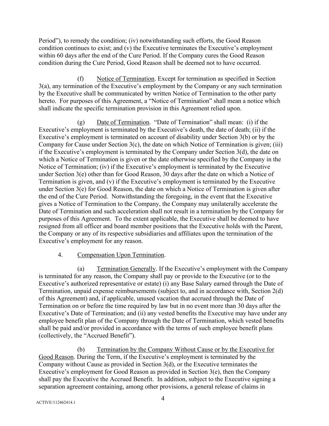 4 ACTIVE/112462414.1 Period”), to remedy the condition; (iv) notwithstanding such efforts, the Good Reason condition continues to exist; and (v) the Executive terminates the Executive’s employment within 60 days after the end of the Cure Period. If the Company cures the Good Reason condition during the Cure Period, Good Reason shall be deemed not to have occurred. (f) Notice of Termination. Except for termination as specified in Section 3(a), any termination of the Executive’s employment by the Company or any such termination by the Executive shall be communicated by written Notice of Termination to the other party hereto. For purposes of this Agreement, a “Notice of Termination” shall mean a notice which shall indicate the specific termination provision in this Agreement relied upon. (g) Date of Termination. “Date of Termination” shall mean: (i) if the Executive’s employment is terminated by the Executive’s death, the date of death; (ii) if the Executive’s employment is terminated on account of disability under Section 3(b) or by the Company for Cause under Section 3(c), the date on which Notice of Termination is given; (iii) if the Executive’s employment is terminated by the Company under Section 3(d), the date on which a Notice of Termination is given or the date otherwise specified by the Company in the Notice of Termination; (iv) if the Executive’s employment is terminated by the Executive under Section 3(e) other than for Good Reason, 30 days after the date on which a Notice of Termination is given, and (v) if the Executive’s employment is terminated by the Executive under Section 3(e) for Good Reason, the date on which a Notice of Termination is given after the end of the Cure Period. Notwithstanding the foregoing, in the event that the Executive gives a Notice of Termination to the Company, the Company may unilaterally accelerate the Date of Termination and such acceleration shall not result in a termination by the Company for purposes of this Agreement. To the extent applicable, the Executive shall be deemed to have resigned from all officer and board member positions that the Executive holds with the Parent, the Company or any of its respective subsidiaries and affiliates upon the termination of the Executive’s employment for any reason. 4. Compensation Upon Termination. (a) Termination Generally. If the Executive’s employment with the Company is terminated for any reason, the Company shall pay or provide to the Executive (or to the Executive’s authorized representative or estate) (i) any Base Salary earned through the Date of Termination, unpaid expense reimbursements (subject to, and in accordance with, Section 2(d) of this Agreement) and, if applicable, unused vacation that accrued through the Date of Termination on or before the time required by law but in no event more than 30 days after the Executive’s Date of Termination; and (ii) any vested benefits the Executive may have under any employee benefit plan of the Company through the Date of Termination, which vested benefits shall be paid and/or provided in accordance with the terms of such employee benefit plans (collectively, the “Accrued Benefit”). (b) Termination by the Company Without Cause or by the Executive for Good Reason. During the Term, if the Executive’s employment is terminated by the Company without Cause as provided in Section 3(d), or the Executive terminates the Executive’s employment for Good Reason as provided in Section 3(e), then the Company shall pay the Executive the Accrued Benefit. In addition, subject to the Executive signing a separation agreement containing, among other provisions, a general release of claims in