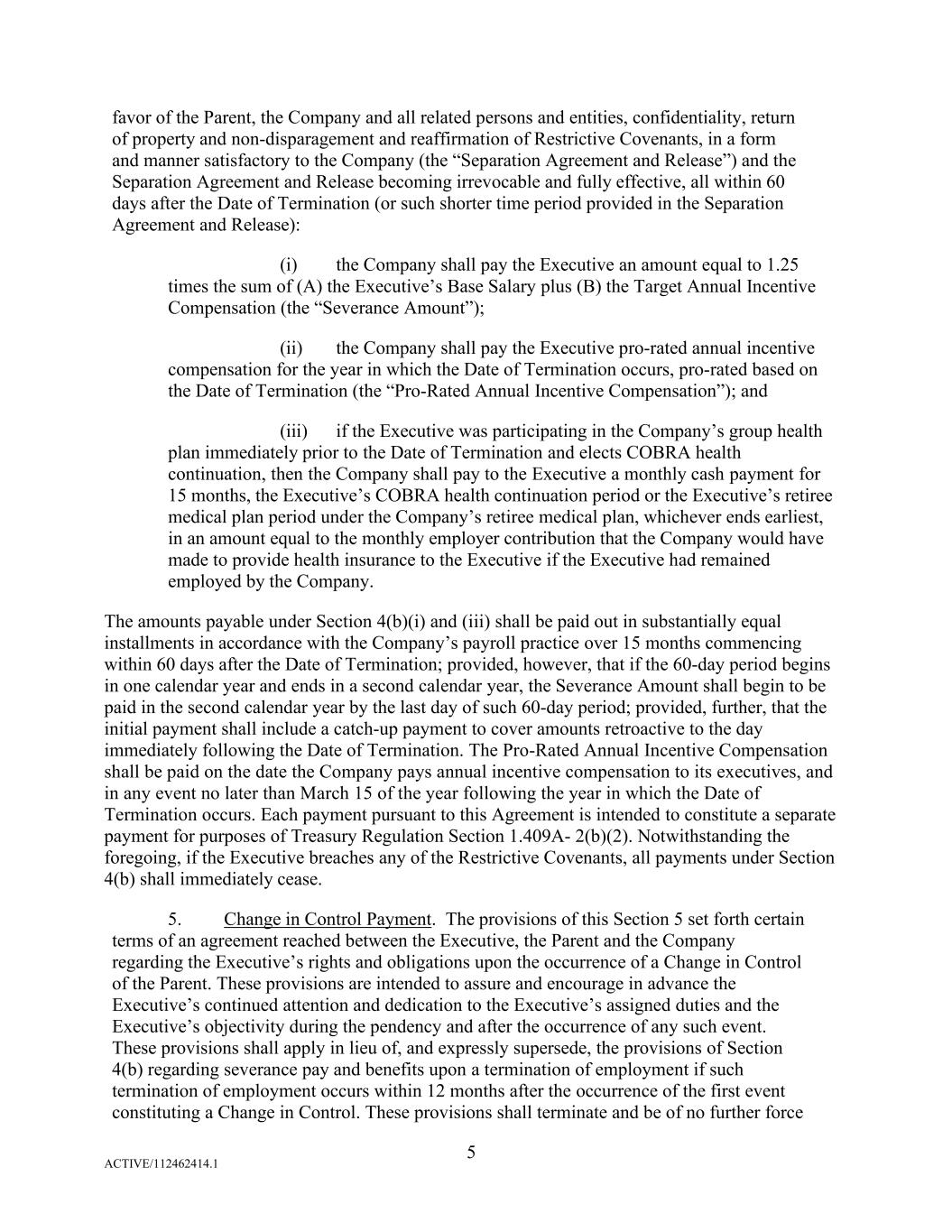 5 ACTIVE/112462414.1 favor of the Parent, the Company and all related persons and entities, confidentiality, return of property and non-disparagement and reaffirmation of Restrictive Covenants, in a form and manner satisfactory to the Company (the “Separation Agreement and Release”) and the Separation Agreement and Release becoming irrevocable and fully effective, all within 60 days after the Date of Termination (or such shorter time period provided in the Separation Agreement and Release): (i) the Company shall pay the Executive an amount equal to 1.25 times the sum of (A) the Executive’s Base Salary plus (B) the Target Annual Incentive Compensation (the “Severance Amount”); (ii) the Company shall pay the Executive pro-rated annual incentive compensation for the year in which the Date of Termination occurs, pro-rated based on the Date of Termination (the “Pro-Rated Annual Incentive Compensation”); and (iii) if the Executive was participating in the Company’s group health plan immediately prior to the Date of Termination and elects COBRA health continuation, then the Company shall pay to the Executive a monthly cash payment for 15 months, the Executive’s COBRA health continuation period or the Executive’s retiree medical plan period under the Company’s retiree medical plan, whichever ends earliest, in an amount equal to the monthly employer contribution that the Company would have made to provide health insurance to the Executive if the Executive had remained employed by the Company. The amounts payable under Section 4(b)(i) and (iii) shall be paid out in substantially equal installments in accordance with the Company’s payroll practice over 15 months commencing within 60 days after the Date of Termination; provided, however, that if the 60-day period begins in one calendar year and ends in a second calendar year, the Severance Amount shall begin to be paid in the second calendar year by the last day of such 60-day period; provided, further, that the initial payment shall include a catch-up payment to cover amounts retroactive to the day immediately following the Date of Termination. The Pro-Rated Annual Incentive Compensation shall be paid on the date the Company pays annual incentive compensation to its executives, and in any event no later than March 15 of the year following the year in which the Date of Termination occurs. Each payment pursuant to this Agreement is intended to constitute a separate payment for purposes of Treasury Regulation Section 1.409A- 2(b)(2). Notwithstanding the foregoing, if the Executive breaches any of the Restrictive Covenants, all payments under Section 4(b) shall immediately cease. 5. Change in Control Payment. The provisions of this Section 5 set forth certain terms of an agreement reached between the Executive, the Parent and the Company regarding the Executive’s rights and obligations upon the occurrence of a Change in Control of the Parent. These provisions are intended to assure and encourage in advance the Executive’s continued attention and dedication to the Executive’s assigned duties and the Executive’s objectivity during the pendency and after the occurrence of any such event. These provisions shall apply in lieu of, and expressly supersede, the provisions of Section 4(b) regarding severance pay and benefits upon a termination of employment if such termination of employment occurs within 12 months after the occurrence of the first event constituting a Change in Control. These provisions shall terminate and be of no further force