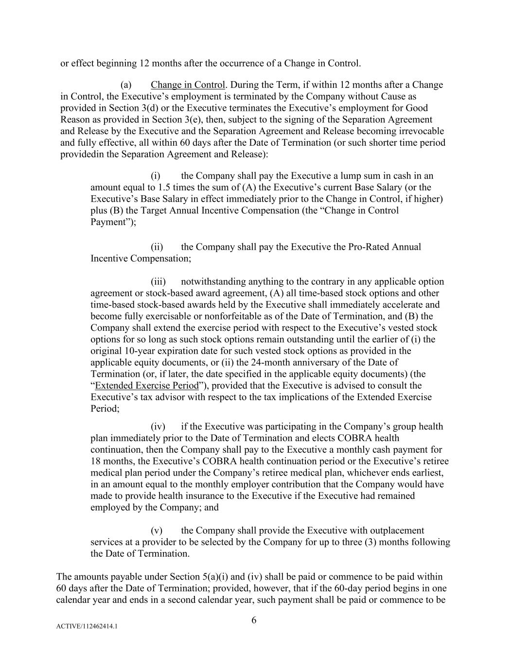 6 ACTIVE/112462414.1 or effect beginning 12 months after the occurrence of a Change in Control. (a) Change in Control. During the Term, if within 12 months after a Change in Control, the Executive’s employment is terminated by the Company without Cause as provided in Section 3(d) or the Executive terminates the Executive’s employment for Good Reason as provided in Section 3(e), then, subject to the signing of the Separation Agreement and Release by the Executive and the Separation Agreement and Release becoming irrevocable and fully effective, all within 60 days after the Date of Termination (or such shorter time period provided in the Separation Agreement and Release): (i) the Company shall pay the Executive a lump sum in cash in an amount equal to 1.5 times the sum of (A) the Executive’s current Base Salary (or the Executive’s Base Salary in effect immediately prior to the Change in Control, if higher) plus (B) the Target Annual Incentive Compensation (the “Change in Control Payment”); (ii) the Company shall pay the Executive the Pro-Rated Annual Incentive Compensation; (iii) notwithstanding anything to the contrary in any applicable option agreement or stock-based award agreement, (A) all time-based stock options and other time- based stock-based awards held by the Executive shall immediately accelerate and become fully exercisable or nonforfeitable as of the Date of Termination, and (B) the Company shall extend the exercise period with respect to the Executive’s vested stock options for so long as such stock options remain outstanding until the earlier of (i) the original 10-year expiration date for such vested stock options as provided in the applicable equity documents, or (ii) the 24-month anniversary of the Date of Termination (or, if later, the date specified in the applicable equity documents) (the “Extended Exercise Period”), provided that the Executive is advised to consult the Executive’s tax advisor with respect to the tax implications of the Extended Exercise Period; (iv) if the Executive was participating in the Company’s group health plan immediately prior to the Date of Termination and elects COBRA health continuation, then the Company shall pay to the Executive a monthly cash payment for 18 months, the Executive’s COBRA health continuation period or the Executive’s retiree medical plan period under the Company’s retiree medical plan, whichever ends earliest, in an amount equal to the monthly employer contribution that the Company would have made to provide health insurance to the Executive if the Executive had remained employed by the Company; and (v) the Company shall provide the Executive with outplacement services at a provider to be selected by the Company for up to three (3) months following the Date of Termination. The amounts payable under Section 5(a)(i) and (iv) shall be paid or commence to be paid within 60 days after the Date of Termination; provided, however, that if the 60-day period begins in one calendar year and ends in a second calendar year, such payment shall be paid or commence to be