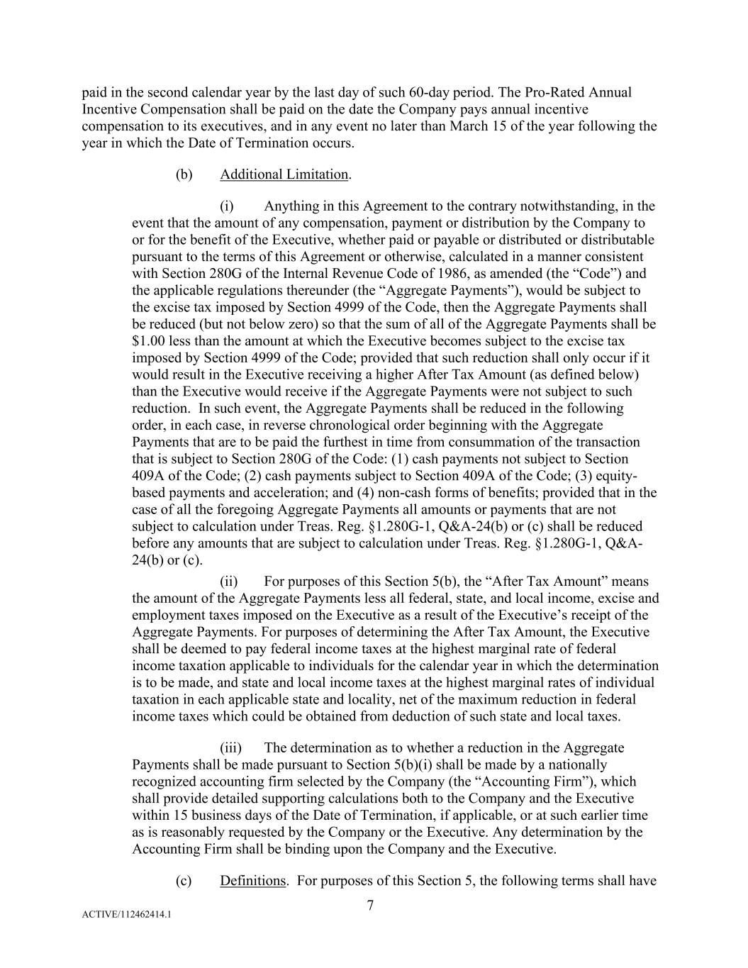 7 ACTIVE/112462414.1 paid in the second calendar year by the last day of such 60-day period. The Pro-Rated Annual Incentive Compensation shall be paid on the date the Company pays annual incentive compensation to its executives, and in any event no later than March 15 of the year following the year in which the Date of Termination occurs. (b) Additional Limitation. (i) Anything in this Agreement to the contrary notwithstanding, in the event that the amount of any compensation, payment or distribution by the Company to or for the benefit of the Executive, whether paid or payable or distributed or distributable pursuant to the terms of this Agreement or otherwise, calculated in a manner consistent with Section 280G of the Internal Revenue Code of 1986, as amended (the “Code”) and the applicable regulations thereunder (the “Aggregate Payments”), would be subject to the excise tax imposed by Section 4999 of the Code, then the Aggregate Payments shall be reduced (but not below zero) so that the sum of all of the Aggregate Payments shall be $1.00 less than the amount at which the Executive becomes subject to the excise tax imposed by Section 4999 of the Code; provided that such reduction shall only occur if it would result in the Executive receiving a higher After Tax Amount (as defined below) than the Executive would receive if the Aggregate Payments were not subject to such reduction. In such event, the Aggregate Payments shall be reduced in the following order, in each case, in reverse chronological order beginning with the Aggregate Payments that are to be paid the furthest in time from consummation of the transaction that is subject to Section 280G of the Code: (1) cash payments not subject to Section 409A of the Code; (2) cash payments subject to Section 409A of the Code; (3) equity- based payments and acceleration; and (4) non-cash forms of benefits; provided that in the case of all the foregoing Aggregate Payments all amounts or payments that are not subject to calculation under Treas. Reg. §1.280G-1, Q&A-24(b) or (c) shall be reduced before any amounts that are subject to calculation under Treas. Reg. §1.280G-1, Q&A- 24(b) or (c). (ii) For purposes of this Section 5(b), the “After Tax Amount” means the amount of the Aggregate Payments less all federal, state, and local income, excise and employment taxes imposed on the Executive as a result of the Executive’s receipt of the Aggregate Payments. For purposes of determining the After Tax Amount, the Executive shall be deemed to pay federal income taxes at the highest marginal rate of federal income taxation applicable to individuals for the calendar year in which the determination is to be made, and state and local income taxes at the highest marginal rates of individual taxation in each applicable state and locality, net of the maximum reduction in federal income taxes which could be obtained from deduction of such state and local taxes. (iii) The determination as to whether a reduction in the Aggregate Payments shall be made pursuant to Section 5(b)(i) shall be made by a nationally recognized accounting firm selected by the Company (the “Accounting Firm”), which shall provide detailed supporting calculations both to the Company and the Executive within 15 business days of the Date of Termination, if applicable, or at such earlier time as is reasonably requested by the Company or the Executive. Any determination by the Accounting Firm shall be binding upon the Company and the Executive. (c) Definitions. For purposes of this Section 5, the following terms shall have
