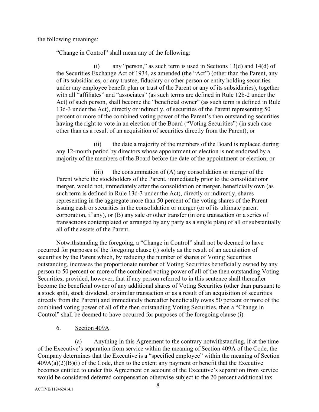 8 ACTIVE/112462414.1 the following meanings: “Change in Control” shall mean any of the following: (i) any “person,” as such term is used in Sections 13(d) and 14(d) of the Securities Exchange Act of 1934, as amended (the “Act”) (other than the Parent, any of its subsidiaries, or any trustee, fiduciary or other person or entity holding securities under any employee benefit plan or trust of the Parent or any of its subsidiaries), together with all “affiliates” and “associates” (as such terms are defined in Rule 12b-2 under the Act) of such person, shall become the “beneficial owner” (as such term is defined in Rule 13d-3 under the Act), directly or indirectly, of securities of the Parent representing 50 percent or more of the combined voting power of the Parent’s then outstanding securities having the right to vote in an election of the Board (“Voting Securities”) (in such case other than as a result of an acquisition of securities directly from the Parent); or (ii) the date a majority of the members of the Board is replaced during any 12-month period by directors whose appointment or election is not endorsed by a majority of the members of the Board before the date of the appointment or election; or (iii) the consummation of (A) any consolidation or merger of the Parent where the stockholders of the Parent, immediately prior to the consolidation or merger, would not, immediately after the consolidation or merger, beneficially own (as such term is defined in Rule 13d-3 under the Act), directly or indirectly, shares representing in the aggregate more than 50 percent of the voting shares of the Parent issuing cash or securities in the consolidation or merger (or of its ultimate parent corporation, if any), or (B) any sale or other transfer (in one transaction or a series of transactions contemplated or arranged by any party as a single plan) of all or substantially all of the assets of the Parent. Notwithstanding the foregoing, a “Change in Control” shall not be deemed to have occurred for purposes of the foregoing clause (i) solely as the result of an acquisition of securities by the Parent which, by reducing the number of shares of Voting Securities outstanding, increases the proportionate number of Voting Securities beneficially owned by any person to 50 percent or more of the combined voting power of all of the then outstanding Voting Securities; provided, however, that if any person referred to in this sentence shall thereafter become the beneficial owner of any additional shares of Voting Securities (other than pursuant to a stock split, stock dividend, or similar transaction or as a result of an acquisition of securities directly from the Parent) and immediately thereafter beneficially owns 50 percent or more of the combined voting power of all of the then outstanding Voting Securities, then a “Change in Control” shall be deemed to have occurred for purposes of the foregoing clause (i). 6. Section 409A. (a) Anything in this Agreement to the contrary notwithstanding, if at the time of the Executive’s separation from service within the meaning of Section 409A of the Code, the Company determines that the Executive is a “specified employee” within the meaning of Section 409A(a)(2)(B)(i) of the Code, then to the extent any payment or benefit that the Executive becomes entitled to under this Agreement on account of the Executive’s separation from service would be considered deferred compensation otherwise subject to the 20 percent additional tax