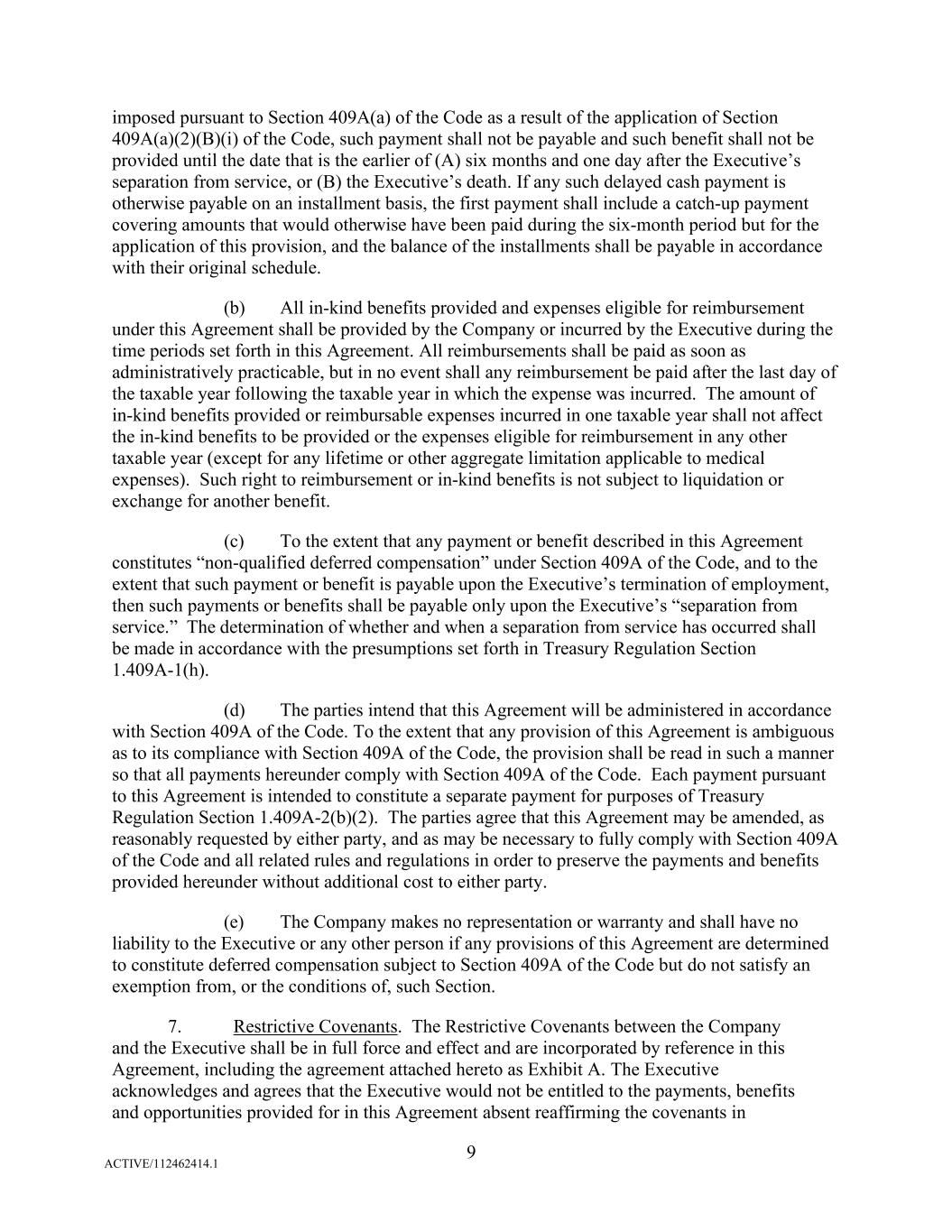 9 ACTIVE/112462414.1 imposed pursuant to Section 409A(a) of the Code as a result of the application of Section 409A(a)(2)(B)(i) of the Code, such payment shall not be payable and such benefit shall not be provided until the date that is the earlier of (A) six months and one day after the Executive’s separation from service, or (B) the Executive’s death. If any such delayed cash payment is otherwise payable on an installment basis, the first payment shall include a catch-up payment covering amounts that would otherwise have been paid during the six-month period but for the application of this provision, and the balance of the installments shall be payable in accordance with their original schedule. (b) All in-kind benefits provided and expenses eligible for reimbursement under this Agreement shall be provided by the Company or incurred by the Executive during the time periods set forth in this Agreement. All reimbursements shall be paid as soon as administratively practicable, but in no event shall any reimbursement be paid after the last day of the taxable year following the taxable year in which the expense was incurred. The amount of in-kind benefits provided or reimbursable expenses incurred in one taxable year shall not affect the in-kind benefits to be provided or the expenses eligible for reimbursement in any other taxable year (except for any lifetime or other aggregate limitation applicable to medical expenses). Such right to reimbursement or in-kind benefits is not subject to liquidation or exchange for another benefit. (c) To the extent that any payment or benefit described in this Agreement constitutes “non-qualified deferred compensation” under Section 409A of the Code, and to the extent that such payment or benefit is payable upon the Executive’s termination of employment, then such payments or benefits shall be payable only upon the Executive’s “separation from service.” The determination of whether and when a separation from service has occurred shall be made in accordance with the presumptions set forth in Treasury Regulation Section 1.409A-1(h). (d) The parties intend that this Agreement will be administered in accordance with Section 409A of the Code. To the extent that any provision of this Agreement is ambiguous as to its compliance with Section 409A of the Code, the provision shall be read in such a manner so that all payments hereunder comply with Section 409A of the Code. Each payment pursuant to this Agreement is intended to constitute a separate payment for purposes of Treasury Regulation Section 1.409A-2(b)(2). The parties agree that this Agreement may be amended, as reasonably requested by either party, and as may be necessary to fully comply with Section 409A of the Code and all related rules and regulations in order to preserve the payments and benefits provided hereunder without additional cost to either party. (e) The Company makes no representation or warranty and shall have no liability to the Executive or any other person if any provisions of this Agreement are determined to constitute deferred compensation subject to Section 409A of the Code but do not satisfy an exemption from, or the conditions of, such Section. 7. Restrictive Covenants. The Restrictive Covenants between the Company and the Executive shall be in full force and effect and are incorporated by reference in this Agreement, including the agreement attached hereto as Exhibit A. The Executive acknowledges and agrees that the Executive would not be entitled to the payments, benefits and opportunities provided for in this Agreement absent reaffirming the covenants in