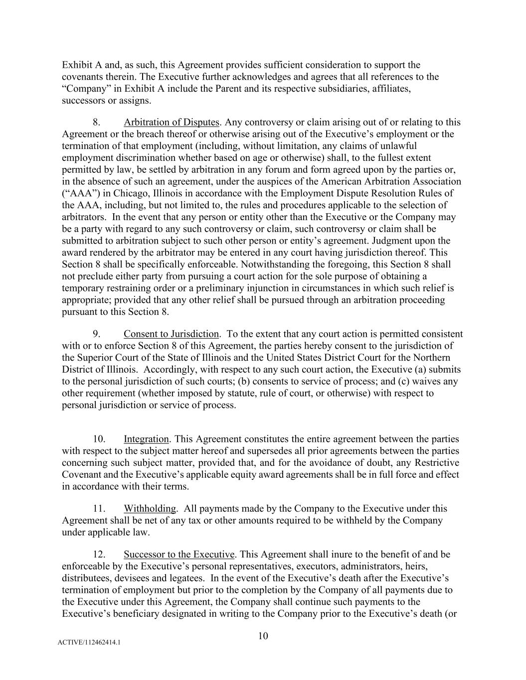 10 ACTIVE/112462414.1 Exhibit A and, as such, this Agreement provides sufficient consideration to support the covenants therein. The Executive further acknowledges and agrees that all references to the “Company” in Exhibit A include the Parent and its respective subsidiaries, affiliates, successors or assigns. 8. Arbitration of Disputes. Any controversy or claim arising out of or relating to this Agreement or the breach thereof or otherwise arising out of the Executive’s employment or the termination of that employment (including, without limitation, any claims of unlawful employment discrimination whether based on age or otherwise) shall, to the fullest extent permitted by law, be settled by arbitration in any forum and form agreed upon by the parties or, in the absence of such an agreement, under the auspices of the American Arbitration Association (“AAA”) in Chicago, Illinois in accordance with the Employment Dispute Resolution Rules of the AAA, including, but not limited to, the rules and procedures applicable to the selection of arbitrators. In the event that any person or entity other than the Executive or the Company may be a party with regard to any such controversy or claim, such controversy or claim shall be submitted to arbitration subject to such other person or entity’s agreement. Judgment upon the award rendered by the arbitrator may be entered in any court having jurisdiction thereof. This Section 8 shall be specifically enforceable. Notwithstanding the foregoing, this Section 8 shall not preclude either party from pursuing a court action for the sole purpose of obtaining a temporary restraining order or a preliminary injunction in circumstances in which such relief is appropriate; provided that any other relief shall be pursued through an arbitration proceeding pursuant to this Section 8. 9. Consent to Jurisdiction. To the extent that any court action is permitted consistent with or to enforce Section 8 of this Agreement, the parties hereby consent to the jurisdiction of the Superior Court of the State of Illinois and the United States District Court for the Northern District of Illinois. Accordingly, with respect to any such court action, the Executive (a) submits to the personal jurisdiction of such courts; (b) consents to service of process; and (c) waives any other requirement (whether imposed by statute, rule of court, or otherwise) with respect to personal jurisdiction or service of process. 10. Integration. This Agreement constitutes the entire agreement between the parties with respect to the subject matter hereof and supersedes all prior agreements between the parties concerning such subject matter, provided that, and for the avoidance of doubt, any Restrictive Covenant and the Executive’s applicable equity award agreements shall be in full force and effect in accordance with their terms. 11. Withholding. All payments made by the Company to the Executive under this Agreement shall be net of any tax or other amounts required to be withheld by the Company under applicable law. 12. Successor to the Executive. This Agreement shall inure to the benefit of and be enforceable by the Executive’s personal representatives, executors, administrators, heirs, distributees, devisees and legatees. In the event of the Executive’s death after the Executive’s termination of employment but prior to the completion by the Company of all payments due to the Executive under this Agreement, the Company shall continue such payments to the Executive’s beneficiary designated in writing to the Company prior to the Executive’s death (or
