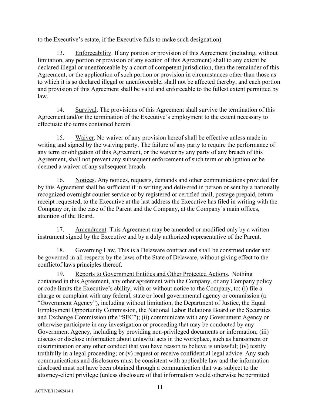 11 ACTIVE/112462414.1 to the Executive’s estate, if the Executive fails to make such designation). 13. Enforceability. If any portion or provision of this Agreement (including, without limitation, any portion or provision of any section of this Agreement) shall to any extent be declared illegal or unenforceable by a court of competent jurisdiction, then the remainder of this Agreement, or the application of such portion or provision in circumstances other than those as to which it is so declared illegal or unenforceable, shall not be affected thereby, and each portion and provision of this Agreement shall be valid and enforceable to the fullest extent permitted by law. 14. Survival. The provisions of this Agreement shall survive the termination of this Agreement and/or the termination of the Executive’s employment to the extent necessary to effectuate the terms contained herein. 15. Waiver. No waiver of any provision hereof shall be effective unless made in writing and signed by the waiving party. The failure of any party to require the performance of any term or obligation of this Agreement, or the waiver by any party of any breach of this Agreement, shall not prevent any subsequent enforcement of such term or obligation or be deemed a waiver of any subsequent breach. 16. Notices. Any notices, requests, demands and other communications provided for by this Agreement shall be sufficient if in writing and delivered in person or sent by a nationally recognized overnight courier service or by registered or certified mail, postage prepaid, return receipt requested, to the Executive at the last address the Executive has filed in writing with the Company or, in the case of the Parent and the Company, at the Company’s main offices, attention of the Board. 17. Amendment. This Agreement may be amended or modified only by a written instrument signed by the Executive and by a duly authorized representative of the Parent. 18. Governing Law. This is a Delaware contract and shall be construed under and be governed in all respects by the laws of the State of Delaware, without giving effect to the conflict of laws principles thereof. 19. Reports to Government Entities and Other Protected Actions. Nothing contained in this Agreement, any other agreement with the Company, or any Company policy or code limits the Executive’s ability, with or without notice to the Company, to: (i) file a charge or complaint with any federal, state or local governmental agency or commission (a “Government Agency”), including without limitation, the Department of Justice, the Equal Employment Opportunity Commission, the National Labor Relations Board or the Securities and Exchange Commission (the “SEC”); (ii) communicate with any Government Agency or otherwise participate in any investigation or proceeding that may be conducted by any Government Agency, including by providing non-privileged documents or information; (iii) discuss or disclose information about unlawful acts in the workplace, such as harassment or discrimination or any other conduct that you have reason to believe is unlawful; (iv) testify truthfully in a legal proceeding; or (v) request or receive confidential legal advice. Any such communications and disclosures must be consistent with applicable law and the information disclosed must not have been obtained through a communication that was subject to the attorney-client privilege (unless disclosure of that information would otherwise be permitted