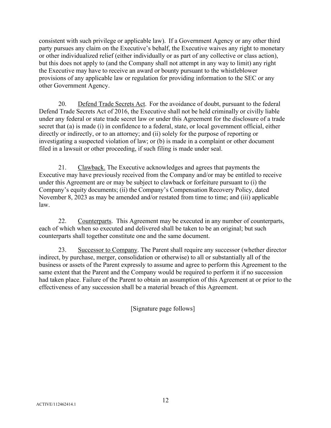 12 ACTIVE/112462414.1 consistent with such privilege or applicable law). If a Government Agency or any other third party pursues any claim on the Executive’s behalf, the Executive waives any right to monetary or other individualized relief (either individually or as part of any collective or class action), but this does not apply to (and the Company shall not attempt in any way to limit) any right the Executive may have to receive an award or bounty pursuant to the whistleblower provisions of any applicable law or regulation for providing information to the SEC or any other Government Agency. 20. Defend Trade Secrets Act. For the avoidance of doubt, pursuant to the federal Defend Trade Secrets Act of 2016, the Executive shall not be held criminally or civilly liable under any federal or state trade secret law or under this Agreement for the disclosure of a trade secret that (a) is made (i) in confidence to a federal, state, or local government official, either directly or indirectly, or to an attorney; and (ii) solely for the purpose of reporting or investigating a suspected violation of law; or (b) is made in a complaint or other document filed in a lawsuit or other proceeding, if such filing is made under seal. 21. Clawback. The Executive acknowledges and agrees that payments the Executive may have previously received from the Company and/or may be entitled to receive under this Agreement are or may be subject to clawback or forfeiture pursuant to (i) the Company’s equity documents; (ii) the Company’s Compensation Recovery Policy, dated November 8, 2023 as may be amended and/or restated from time to time; and (iii) applicable law. 22. Counterparts. This Agreement may be executed in any number of counterparts, each of which when so executed and delivered shall be taken to be an original; but such counterparts shall together constitute one and the same document. 23. Successor to Company. The Parent shall require any successor (whether direct or indirect, by purchase, merger, consolidation or otherwise) to all or substantially all of the business or assets of the Parent expressly to assume and agree to perform this Agreement to the same extent that the Parent and the Company would be required to perform it if no succession had taken place. Failure of the Parent to obtain an assumption of this Agreement at or prior to the effectiveness of any succession shall be a material breach of this Agreement. [Signature page follows]