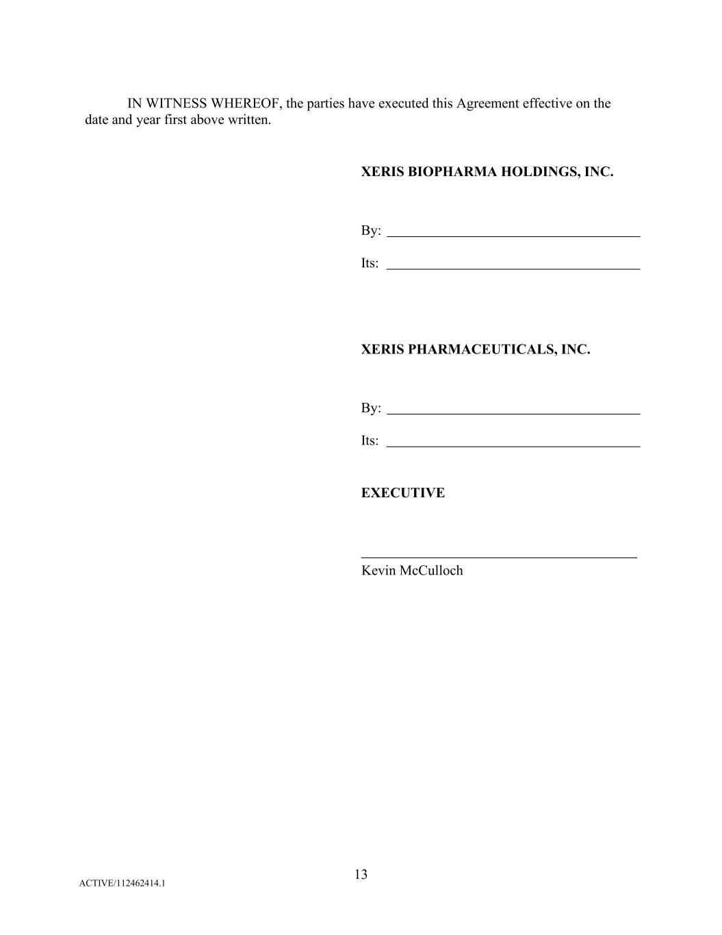 13 ACTIVE/112462414.1 IN WITNESS WHEREOF, the parties have executed this Agreement effective on the date and year first above written. XERIS BIOPHARMA HOLDINGS, INC. By: Its: XERIS PHARMACEUTICALS, INC. By: Its: EXECUTIVE Kevin McCulloch