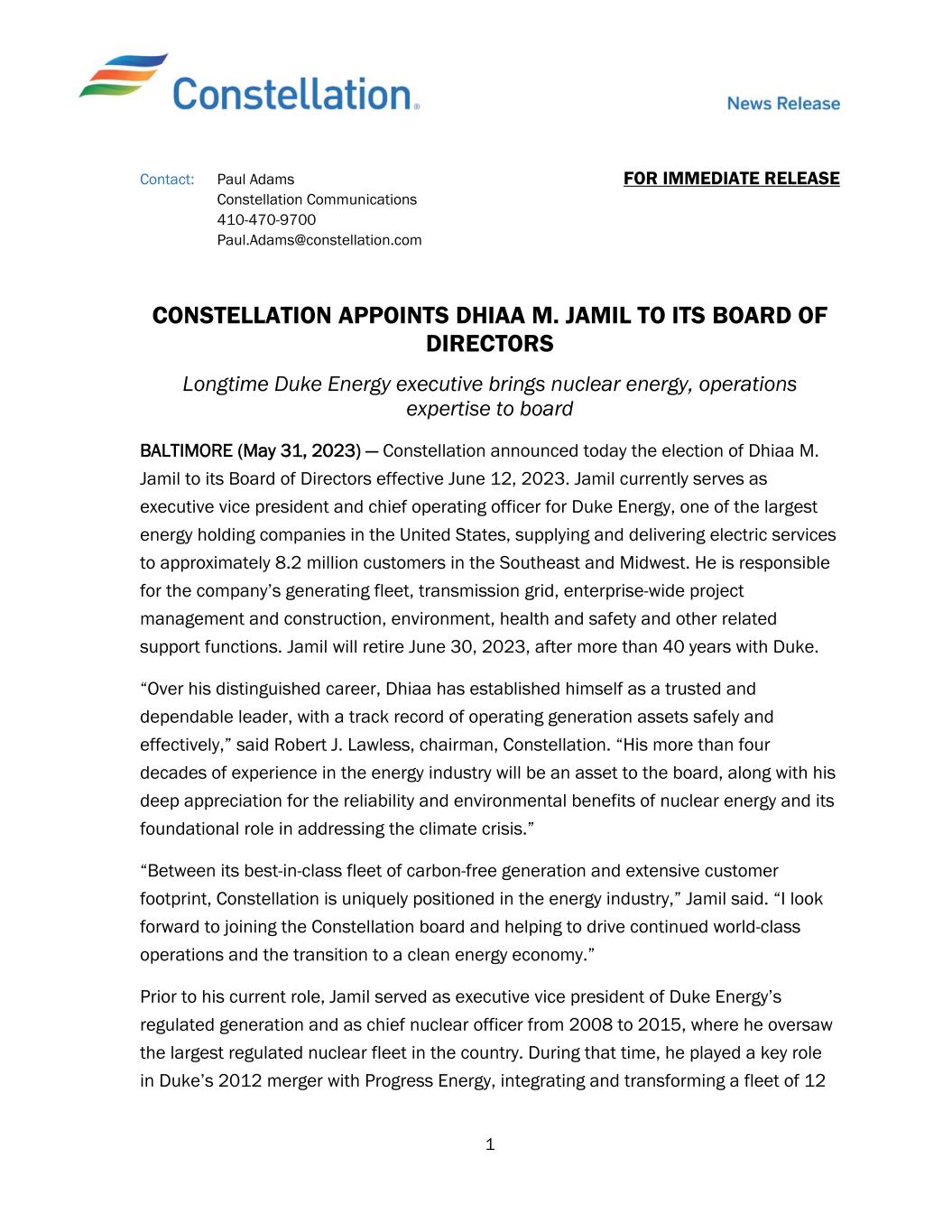 1 Contact: Paul Adams Constellation Communications 410-470-9700 Paul.Adams@constellation.com FOR IMMEDIATE RELEASE CONSTELLATION APPOINTS DHIAA M. JAMIL TO ITS BOARD OF DIRECTORS Longtime Duke Energy executive brings nuclear energy, operations expertise to board BALTIMORE (May 31, 2023) — Constellation announced today the election of Dhiaa M. Jamil to its Board of Directors effective June 12, 2023. Jamil currently serves as executive vice president and chief operating officer for Duke Energy, one of the largest energy holding companies in the United States, supplying and delivering electric services to approximately 8.2 million customers in the Southeast and Midwest. He is responsible for the company’s generating fleet, transmission grid, enterprise-wide project management and construction, environment, health and safety and other related support functions. Jamil will retire June 30, 2023, after more than 40 years with Duke. “Over his distinguished career, Dhiaa has established himself as a trusted and dependable leader, with a track record of operating generation assets safely and effectively,” said Robert J. Lawless, chairman, Constellation. “His more than four decades of experience in the energy industry will be an asset to the board, along with his deep appreciation for the reliability and environmental benefits of nuclear energy and its foundational role in addressing the climate crisis.” “Between its best-in-class fleet of carbon-free generation and extensive customer footprint, Constellation is uniquely positioned in the energy industry,” Jamil said. “I look forward to joining the Constellation board and helping to drive continued world-class operations and the transition to a clean energy economy.” Prior to his current role, Jamil served as executive vice president of Duke Energy’s regulated generation and as chief nuclear officer from 2008 to 2015, where he oversaw the largest regulated nuclear fleet in the country. During that time, he played a key role in Duke’s 2012 merger with Progress Energy, integrating and transforming a fleet of 12