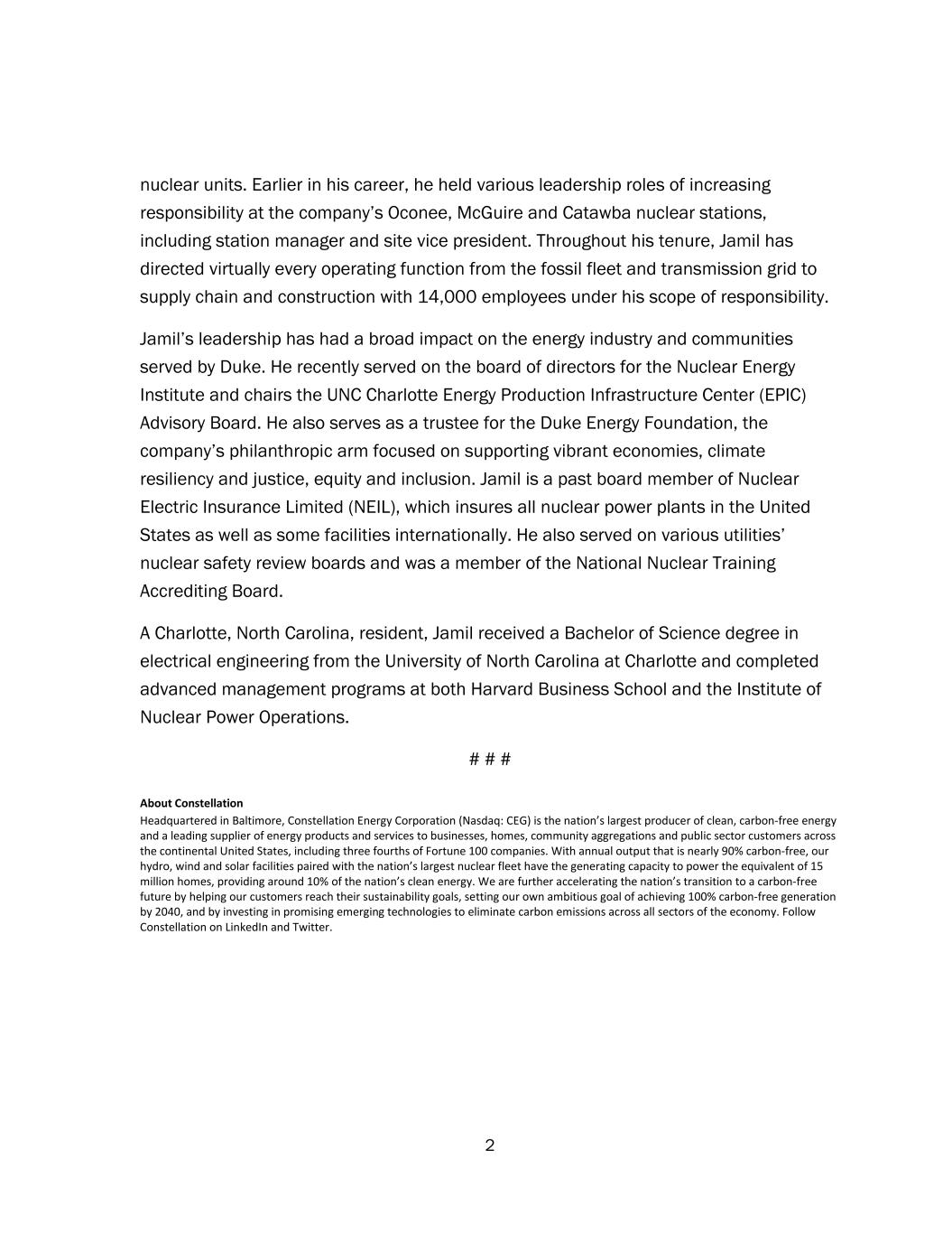 2 nuclear units. Earlier in his career, he held various leadership roles of increasing responsibility at the company’s Oconee, McGuire and Catawba nuclear stations, including station manager and site vice president. Throughout his tenure, Jamil has directed virtually every operating function from the fossil fleet and transmission grid to supply chain and construction with 14,000 employees under his scope of responsibility. Jamil’s leadership has had a broad impact on the energy industry and communities served by Duke. He recently served on the board of directors for the Nuclear Energy Institute and chairs the UNC Charlotte Energy Production Infrastructure Center (EPIC) Advisory Board. He also serves as a trustee for the Duke Energy Foundation, the company’s philanthropic arm focused on supporting vibrant economies, climate resiliency and justice, equity and inclusion. Jamil is a past board member of Nuclear Electric Insurance Limited (NEIL), which insures all nuclear power plants in the United States as well as some facilities internationally. He also served on various utilities’ nuclear safety review boards and was a member of the National Nuclear Training Accrediting Board. A Charlotte, North Carolina, resident, Jamil received a Bachelor of Science degree in electrical engineering from the University of North Carolina at Charlotte and completed advanced management programs at both Harvard Business School and the Institute of Nuclear Power Operations. # # # About Constellation Headquartered in Baltimore, Constellation Energy Corporation (Nasdaq: CEG) is the nation’s largest producer of clean, carbon-free energy and a leading supplier of energy products and services to businesses, homes, community aggregations and public sector customers across the continental United States, including three fourths of Fortune 100 companies. With annual output that is nearly 90% carbon-free, our hydro, wind and solar facilities paired with the nation’s largest nuclear fleet have the generating capacity to power the equivalent of 15 million homes, providing around 10% of the nation’s clean energy. We are further accelerating the nation’s transition to a carbon-free future by helping our customers reach their sustainability goals, setting our own ambitious goal of achieving 100% carbon-free generation by 2040, and by investing in promising emerging technologies to eliminate carbon emissions across all sectors of the economy. Follow Constellation on LinkedIn and Twitter.