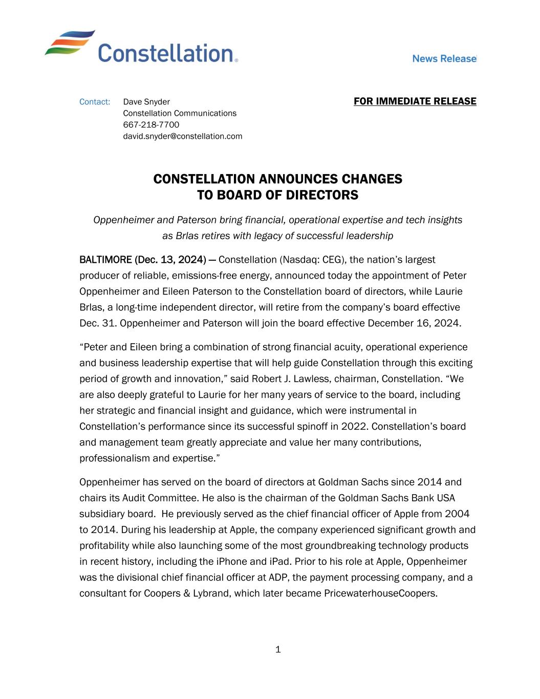 1 Contact: Dave Snyder Constellation Communications 667-218-7700 david.snyder@constellation.com FOR IMMEDIATE RELEASE CONSTELLATION ANNOUNCES CHANGES TO BOARD OF DIRECTORS Oppenheimer and Paterson bring financial, operational expertise and tech insights as Brlas retires with legacy of successful leadership BALTIMORE (Dec. 13, 2024) — Constellation (Nasdaq: CEG), the nation’s largest producer of reliable, emissions-free energy, announced today the appointment of Peter Oppenheimer and Eileen Paterson to the Constellation board of directors, while Laurie Brlas, a long-time independent director, will retire from the company’s board effective Dec. 31. Oppenheimer and Paterson will join the board effective December 16, 2024. “Peter and Eileen bring a combination of strong financial acuity, operational experience and business leadership expertise that will help guide Constellation through this exciting period of growth and innovation,” said Robert J. Lawless, chairman, Constellation. “We are also deeply grateful to Laurie for her many years of service to the board, including her strategic and financial insight and guidance, which were instrumental in Constellation’s performance since its successful spinoff in 2022. Constellation’s board and management team greatly appreciate and value her many contributions, professionalism and expertise.” Oppenheimer has served on the board of directors at Goldman Sachs since 2014 and chairs its Audit Committee. He also is the chairman of the Goldman Sachs Bank USA subsidiary board. He previously served as the chief financial officer of Apple from 2004 to 2014. During his leadership at Apple, the company experienced significant growth and profitability while also launching some of the most groundbreaking technology products in recent history, including the iPhone and iPad. Prior to his role at Apple, Oppenheimer was the divisional chief financial officer at ADP, the payment processing company, and a consultant for Coopers & Lybrand, which later became PricewaterhouseCoopers.