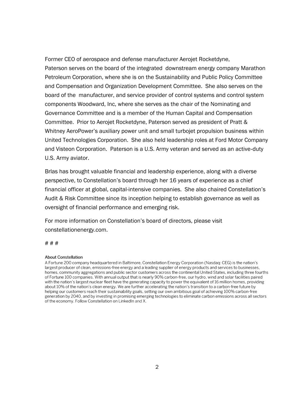 2 Former CEO of aerospace and defense manufacturer Aerojet Rocketdyne, Paterson serves on the board of the integrated downstream energy company Marathon Petroleum Corporation, where she is on the Sustainability and Public Policy Committee and Compensation and Organization Development Committee. She also serves on the board of the manufacturer, and service provider of control systems and control system components Woodward, Inc, where she serves as the chair of the Nominating and Governance Committee and is a member of the Human Capital and Compensation Committee. Prior to Aerojet Rocketdyne, Paterson served as president of Pratt & Whitney AeroPower’s auxiliary power unit and small turbojet propulsion business within United Technologies Corporation. She also held leadership roles at Ford Motor Company and Visteon Corporation. Paterson is a U.S. Army veteran and served as an active‐duty U.S. Army aviator. Brlas has brought valuable financial and leadership experience, along with a diverse perspective, to Constellation’s board through her 16 years of experience as a chief financial officer at global, capital-intensive companies. She also chaired Constellation’s Audit & Risk Committee since its inception helping to establish governance as well as oversight of financial performance and emerging risk. For more information on Constellation’s board of directors, please visit constellationenergy.com. # # #
