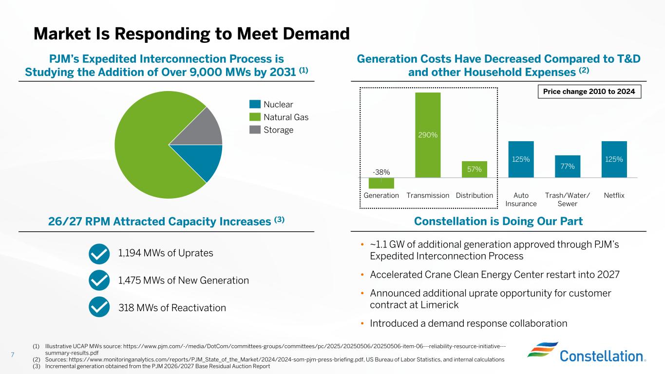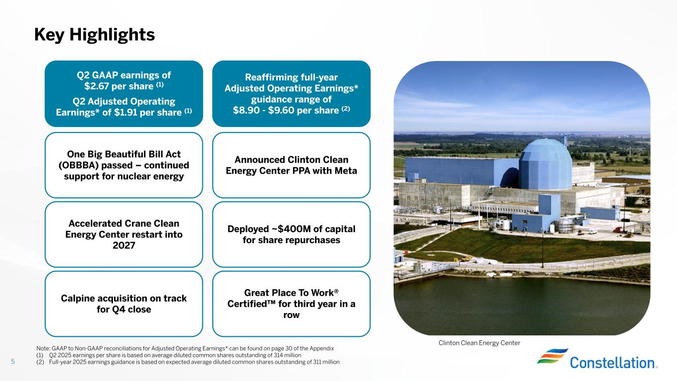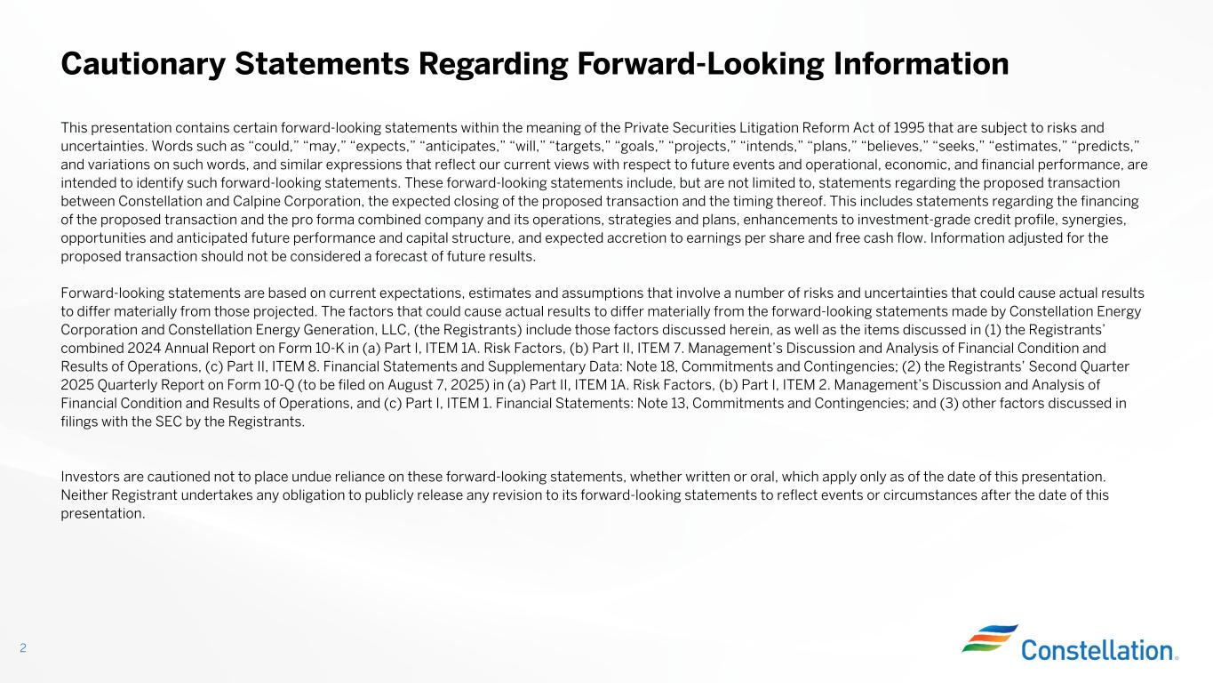This presentation contains certain forward-looking statements within the meaning of the Private Securities Litigation Reform Act of 1995 that are subject to risks and uncertainties. Words such as “could,” “may,” “expects,” “anticipates,” “will,” “targets,” “goals,” “projects,” “intends,” “plans,” “believes,” “seeks,” “estimates,” “predicts,” and variations on such words, and similar expressions that reflect our current views with respect to future events and operational, economic, and financial performance, are intended to identify such forward-looking statements. These forward-looking statements include, but are not limited to, statements regarding the proposed transaction between Constellation and Calpine Corporation, the expected closing of the proposed transaction and the timing thereof. This includes statements regarding the financing of the proposed transaction and the pro forma combined company and its operations, strategies and plans, enhancements to investment-grade credit profile, synergies, opportunities and anticipated future performance and capital structure, and expected accretion to earnings per share and free cash flow. Information adjusted for the proposed transaction should not be considered a forecast of future results. Forward-looking statements are based on current expectations, estimates and assumptions that involve a number of risks and uncertainties that could cause actual results to differ materially from those projected. The factors that could cause actual results to differ materially from the forward-looking statements made by Constellation Energy Corporation and Constellation Energy Generation, LLC, (the Registrants) include those factors discussed herein, as well as the items discussed in (1) the Registrants’ combined 2024 Annual Report on Form 10-K in (a) Part I, ITEM 1A. Risk Factors, (b) Part II, ITEM 7. Management’s Discussion and Analysis of Financial Condition and Results of Operations, (c) Part II, ITEM 8. Financial Statements and Supplementary Data: Note 18, Commitments and Contingencies; (2) the Registrants’ Second Quarter 2025 Quarterly Report on Form 10-Q (to be filed on August 7, 2025) in (a) Part II, ITEM 1A. Risk Factors, (b) Part I, ITEM 2. Management’s Discussion and Analysis of Financial Condition and Results of Operations, and (c) Part I, ITEM 1. Financial Statements: Note 13, Commitments and Contingencies; and (3) other factors discussed in filings with the SEC by the Registrants. Investors are cautioned not to place undue reliance on these forward-looking statements, whether written or oral, which apply only as of the date of this presentation. Neither Registrant undertakes any obligation to publicly release any revision to its forward-looking statements to reflect events or circumstances after the date of this presentation. Cautionary Statements Regarding Forward-Looking Information 2