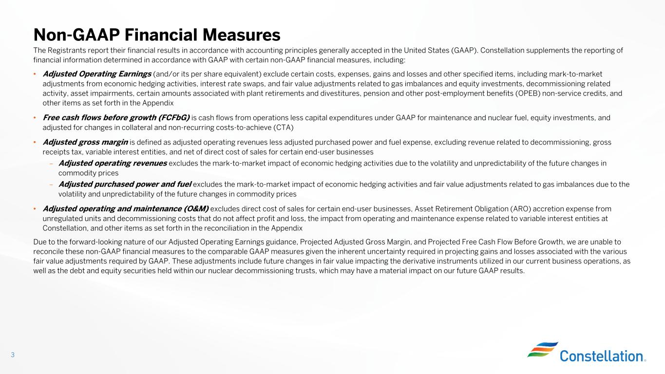 The Registrants report their financial results in accordance with accounting principles generally accepted in the United States (GAAP). Constellation supplements the reporting of financial information determined in accordance with GAAP with certain non-GAAP financial measures, including: • Adjusted Operating Earnings (and/or its per share equivalent) exclude certain costs, expenses, gains and losses and other specified items, including mark-to-market adjustments from economic hedging activities, interest rate swaps, and fair value adjustments related to gas imbalances and equity investments, decommissioning related activity, asset impairments, certain amounts associated with plant retirements and divestitures, pension and other post-employment benefits (OPEB) non-service credits, and other items as set forth in the Appendix • Free cash flows before growth (FCFbG) is cash flows from operations less capital expenditures under GAAP for maintenance and nuclear fuel, equity investments, and adjusted for changes in collateral and non-recurring costs-to-achieve (CTA) • Adjusted gross margin is defined as adjusted operating revenues less adjusted purchased power and fuel expense, excluding revenue related to decommissioning, gross receipts tax, variable interest entities, and net of direct cost of sales for certain end-user businesses – Adjusted operating revenues excludes the mark-to-market impact of economic hedging activities due to the volatility and unpredictability of the future changes in commodity prices – Adjusted purchased power and fuel excludes the mark-to-market impact of economic hedging activities and fair value adjustments related to gas imbalances due to the volatility and unpredictability of the future changes in commodity prices • Adjusted operating and maintenance (O&M) excludes direct cost of sales for certain end-user businesses, Asset Retirement Obligation (ARO) accretion expense from unregulated units and decommissioning costs that do not affect profit and loss, the impact from operating and maintenance expense related to variable interest entities at Constellation, and other items as set forth in the reconciliation in the Appendix Due to the forward-looking nature of our Adjusted Operating Earnings guidance, Projected Adjusted Gross Margin, and Projected Free Cash Flow Before Growth, we are unable to reconcile these non-GAAP financial measures to the comparable GAAP measures given the inherent uncertainty required in projecting gains and losses associated with the various fair value adjustments required by GAAP. These adjustments include future changes in fair value impacting the derivative instruments utilized in our current business operations, as well as the debt and equity securities held within our nuclear decommissioning trusts, which may have a material impact on our future GAAP results. Non-GAAP Financial Measures 3