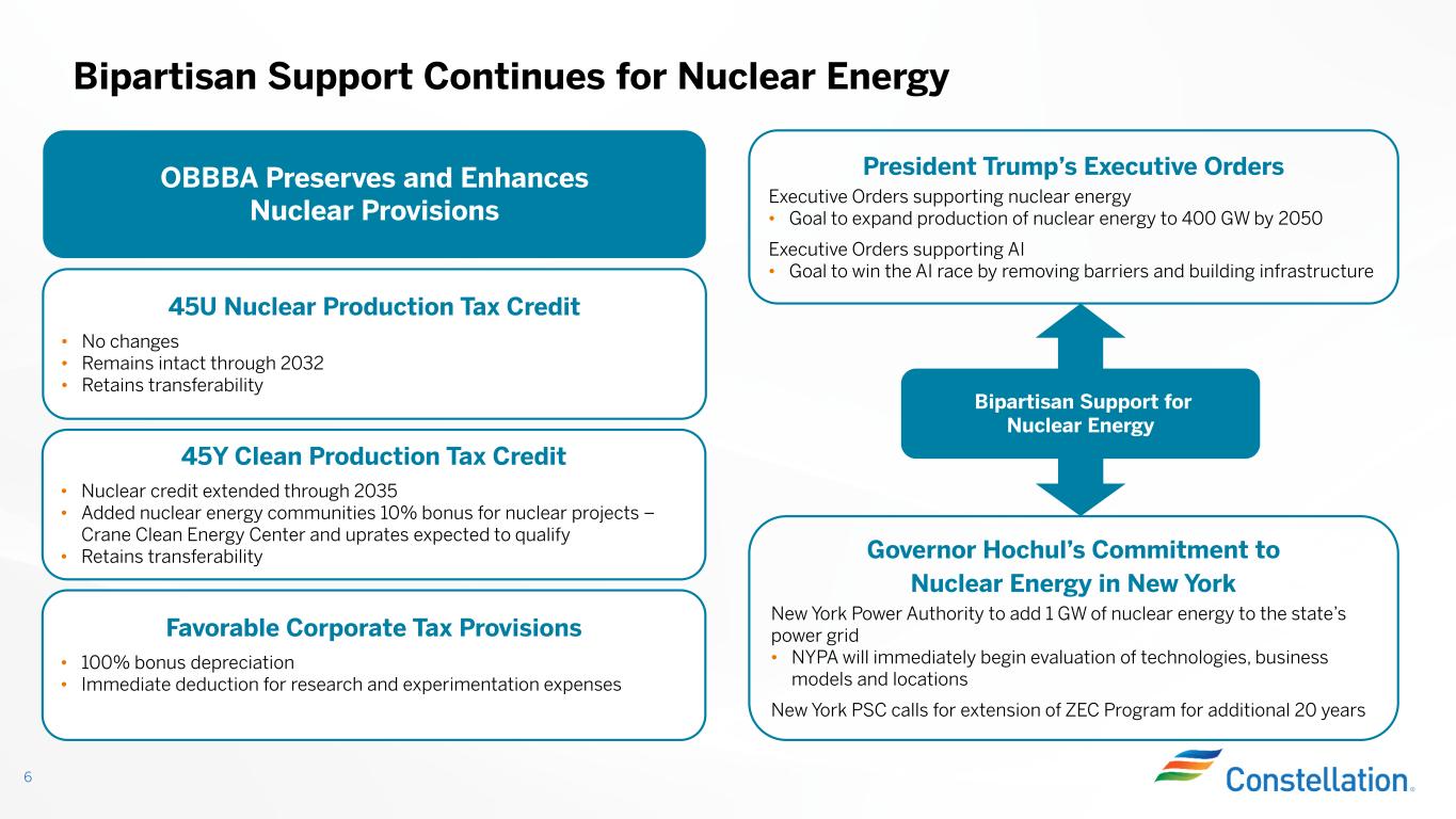 Key Highlights 5 Accelerated Crane Clean Energy Center restart into 2027 Deployed ~$400M of capital for share repurchases Q2 GAAP earnings of $2.67 per share (1) Q2 Adjusted Operating Earnings* of $1.91 per share (1) Calpine acquisition on track for Q4 close Reaffirming full-year Adjusted Operating Earnings* guidance range of $8.90 - $9.60 per share (2) (1) Q2 2025 earnings per share is based on average diluted common shares outstanding of 314 million (2) Full-year 2025 earnings guidance is based on expected average diluted common shares outstanding of 311 million Note: GAAP to Non-GAAP reconciliations for Adjusted Operating Earnings* can be found on page 30 of the Appendix Clinton Clean Energy Center Great Place To Work® Certified for third year in a row One Big Beautiful Bill Act (OBBBA) passed – continued support for nuclear energy Announced Clinton Clean Energy Center PPA with Meta