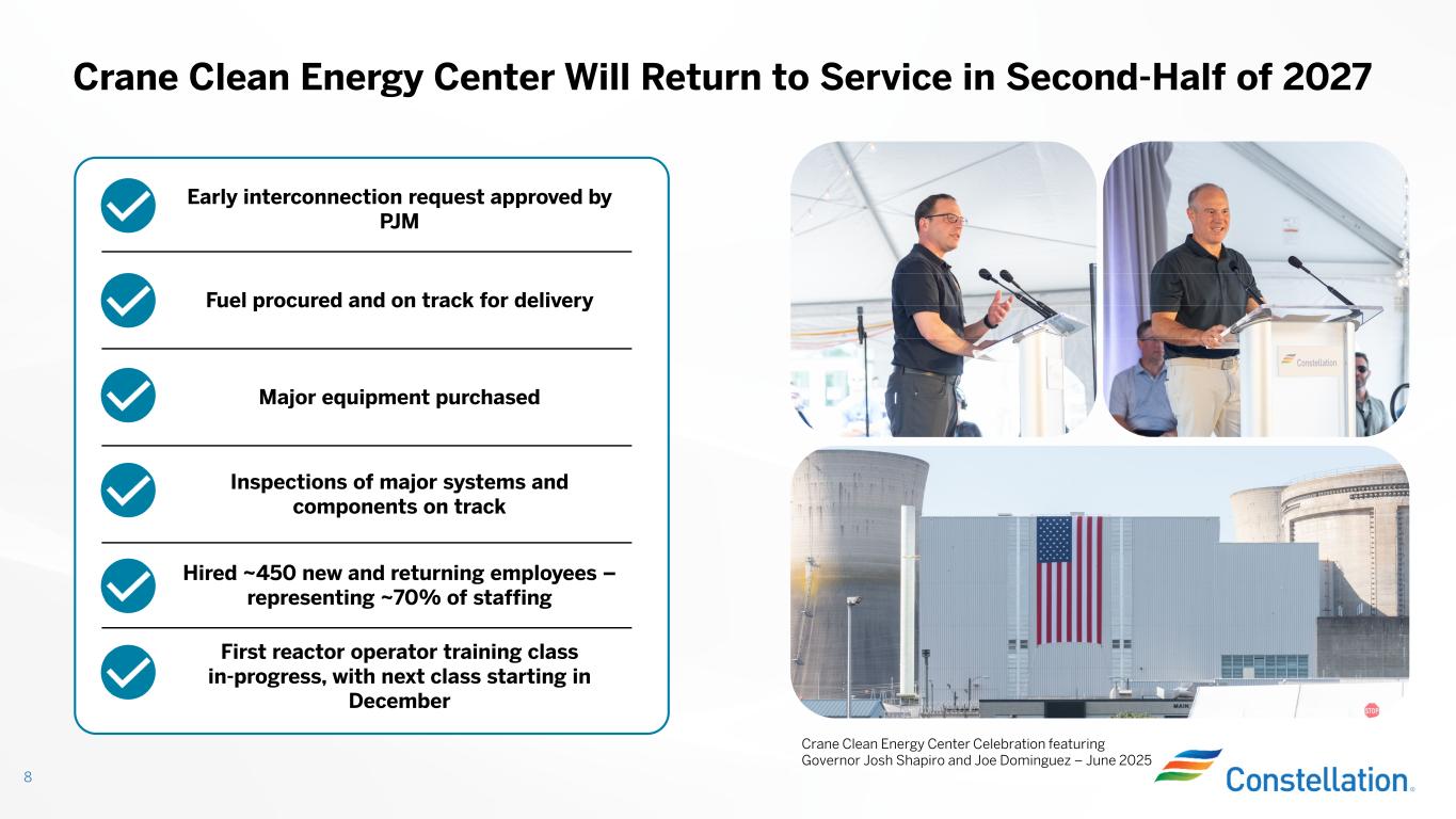 Market Is Responding to Meet Demand 7 (1) Illustrative UCAP MWs source: https://www.pjm.com/-/media/DotCom/committees-groups/committees/pc/2025/20250506/20250506-item-06---reliability-resource-initiative--- summary-results.pdf (2) Sources: https://www.monitoringanalytics.com/reports/PJM_State_of_the_Market/2024/2024-som-pjm-press-briefing.pdf, US Bureau of Labor Statistics, and internal calculations (3) Incremental generation obtained from the PJM 2026/2027 Base Residual Auction Report PJM’s Expedited Interconnection Process is Studying the Addition of Over 9,000 MWs by 2031 (1) Constellation is Doing Our Part Generation Costs Have Decreased Compared to T&D and other Household Expenses (2) 26/27 RPM Attracted Capacity Increases (3) 1,194 MWs of Uprates 1,475 MWs of New Generation 318 MWs of Reactivation • ~1.1 GW of additional generation approved through PJM’s Expedited Interconnection Process • Accelerated Crane Clean Energy Center restart into 2027 • Announced additional uprate opportunity for customer contract at Limerick • Introduced a demand response collaboration -38% 290% 57% 125% 77% 125% Generation Transmission Distribution Auto Insurance Trash/Water/ Sewer Netflix Price change 2010 to 2024 Nuclear Natural Gas Storage