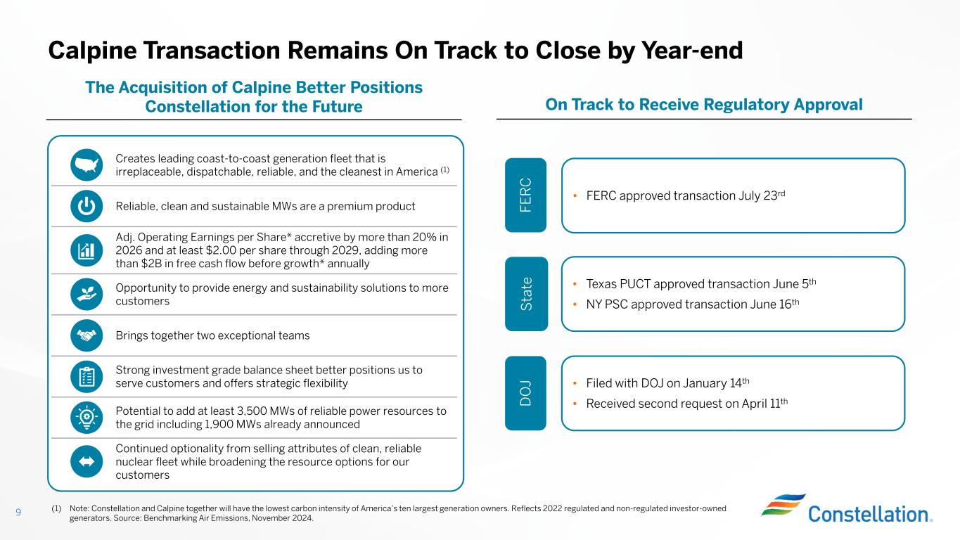 Early interconnection request approved by PJM Fuel procured and on track for delivery Major equipment purchased Inspections of major systems and components on track Hired ~450 new and returning employees – representing ~70% of staffing First reactor operator training class in-progress, with next class starting in December Crane Clean Energy Center Will Return to Service in Second-Half of 2027 8 Crane Clean Energy Center Celebration featuring Governor Josh Shapiro and Joe Dominguez – June 2025
