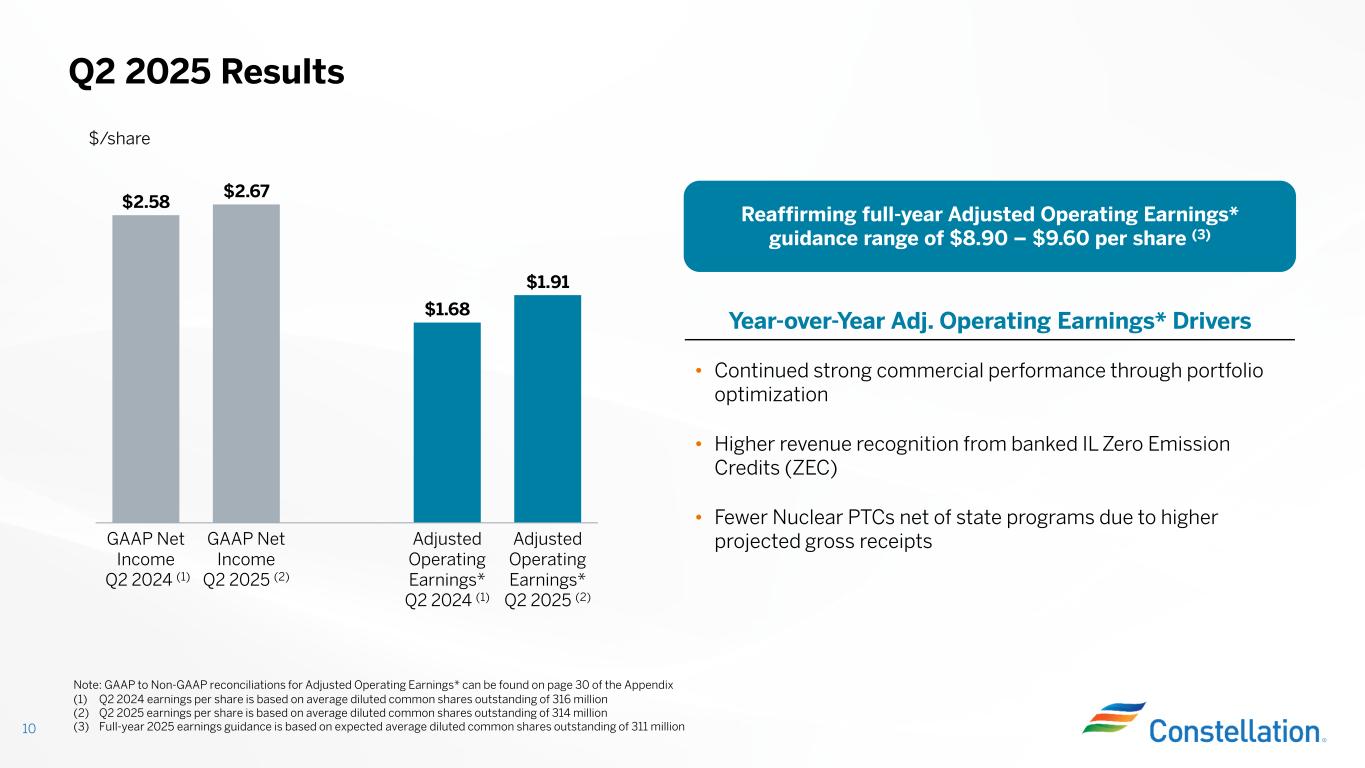 Calpine Transaction Remains On Track to Close by Year-end 9 On Track to Receive Regulatory Approval The Acquisition of Calpine Better Positions Constellation for the Future D O J FE R C S ta te • Filed with DOJ on January 14th • Received second request on April 11th • Texas PUCT approved transaction June 5th • NY PSC approved transaction June 16th Creates leading coast-to-coast generation fleet that is irreplaceable, dispatchable, reliable, and the cleanest in America (1) Reliable, clean and sustainable MWs are a premium product Adj. Operating Earnings per Share* accretive by more than 20% in 2026 and at least $2.00 per share through 2029, adding more than $2B in free cash flow before growth* annually Opportunity to provide energy and sustainability solutions to more customers Brings together two exceptional teams Strong investment grade balance sheet better positions us to serve customers and offers strategic flexibility Potential to add at least 3,500 MWs of reliable power resources to the grid including 1,900 MWs already announced Continued optionality from selling attributes of clean, reliable nuclear fleet while broadening the resource options for our customers (1) Note: Constellation and Calpine together will have the lowest carbon intensity of America’s ten largest generation owners. Reflects 2022 regulated and non-regulated investor-owned generators. Source: Benchmarking Air Emissions, November 2024. • FERC approved transaction July 23rd