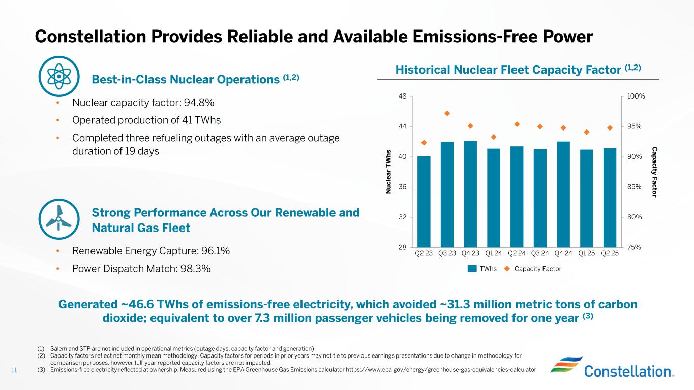 (1) Q2 2024 earnings per share is based on average diluted common shares outstanding of 316 million (2) Q2 2025 earnings per share is based on average diluted common shares outstanding of 314 million (3) Full-year 2025 earnings guidance is based on expected average diluted common shares outstanding of 311 million Q2 2025 Results 10 Year-over-Year Adj. Operating Earnings* Drivers $2.58 $2.67 $1.68 $1.91 GAAP Net Income Q2 2024 (1) GAAP Net Income Q2 2025 (2) Adjusted Operating Earnings* Q2 2024 (1) Adjusted Operating Earnings* Q2 2025 (2) • Continued strong commercial performance through portfolio optimization • Higher revenue recognition from banked IL Zero Emission Credits (ZEC) • Fewer Nuclear PTCs net of state programs due to higher projected gross receipts Note: GAAP to Non-GAAP reconciliations for Adjusted Operating Earnings* can be found on page 30 of the Appendix $/share Reaffirming full-year Adjusted Operating Earnings* guidance range of $8.90 – $9.60 per share (3)