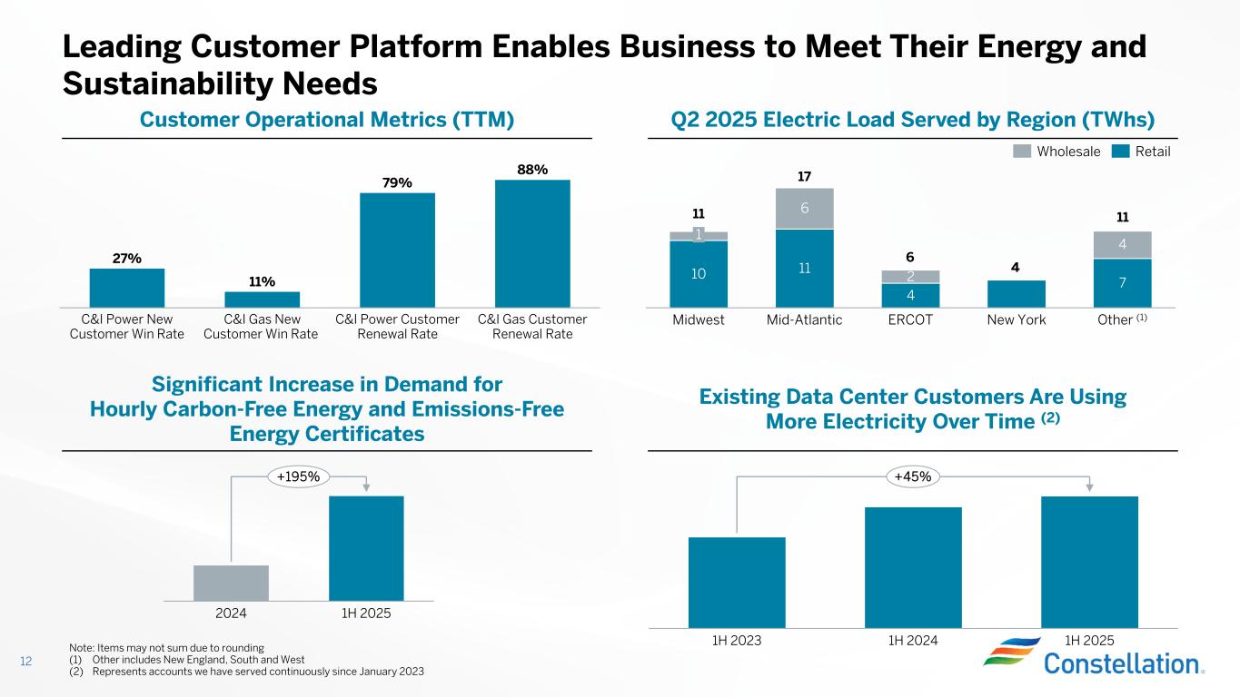 Best-in-Class Nuclear Operations (1,2) • Nuclear capacity factor: 94.8% • Operated production of 41 TWhs • Completed three refueling outages with an average outage duration of 19 days 11 Constellation Provides Reliable and Available Emissions-Free Power (1) Salem and STP are not included in operational metrics (outage days, capacity factor and generation) (2) Capacity factors reflect net monthly mean methodology. Capacity factors for periods in prior years may not tie to previous earnings presentations due to change in methodology for comparison purposes, however full-year reported capacity factors are not impacted. (3) Emissions-free electricity reflected at ownership. Measured using the EPA Greenhouse Gas Emissions calculator https://www.epa.gov/energy/greenhouse-gas-equivalencies-calculator 75% 80% 85% 90% 95% 100% 28 32 36 40 44 48 N u cl ea r T W h s C ap acity F acto r Q2 23 Q3 23 Q4 23 Q1 24 Q2 24 Q3 24 Q4 24 Q1 25 Q2 25 TWhs Capacity Factor Generated ~46.6 TWhs of emissions-free electricity, which avoided ~31.3 million metric tons of carbon dioxide; equivalent to over 7.3 million passenger vehicles being removed for one year (3) Historical Nuclear Fleet Capacity Factor (1,2) Strong Performance Across Our Renewable and Natural Gas Fleet • Renewable Energy Capture: 96.1% • Power Dispatch Match: 98.3%
