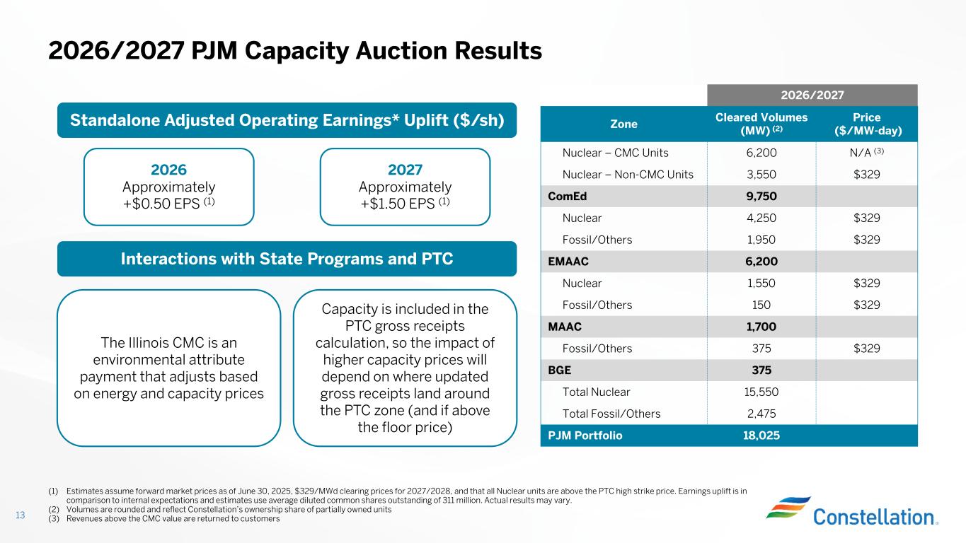 Leading Customer Platform Enables Business to Meet Their Energy and Sustainability Needs 12 Existing Data Center Customers Are Using More Electricity Over Time (2) Significant Increase in Demand for Hourly Carbon-Free Energy and Emissions-Free Energy Certificates 2024 1H 2025 +195% Q2 2025 Electric Load Served by Region (TWhs)Customer Operational Metrics (TTM) 10 11 4 4 7 6 2 4 1 Midwest Mid-Atlantic ERCOT New York Other (1) 11 17 6 11 Wholesale Retail 27% 11% 79% 88% C&I Power New Customer Win Rate C&I Gas New Customer Win Rate C&I Power Customer Renewal Rate C&I Gas Customer Renewal Rate Note: Items may not sum due to rounding (1) Other includes New England, South and West (2) Represents accounts we have served continuously since January 2023 1H 2023 1H 2024 1H 2025 +45%