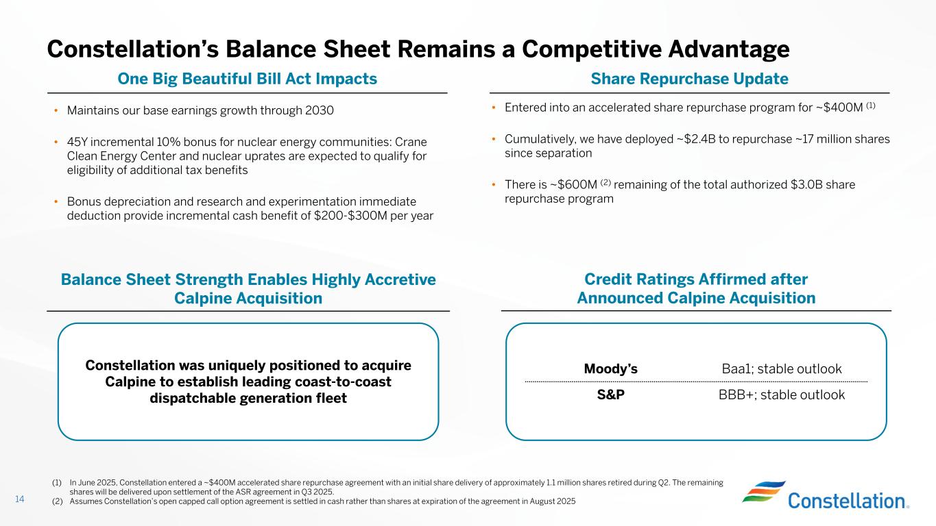 2026/2027 PJM Capacity Auction Results 13 2026/2027 Price ($/MW-day) Cleared Volumes (MW) (2)Zone N/A (3)6,200Nuclear – CMC Units $3293,550Nuclear – Non-CMC Units 9,750ComEd $3294,250Nuclear $3291,950Fossil/Others 6,200EMAAC $3291,550Nuclear $329150Fossil/Others 1,700MAAC $329375Fossil/Others 375BGE 15,550Total Nuclear 2,475Total Fossil/Others 18,025PJM Portfolio (1) Estimates assume forward market prices as of June 30, 2025, $329/MWd clearing prices for 2027/2028, and that all Nuclear units are above the PTC high strike price. Earnings uplift is in comparison to internal expectations and estimates use average diluted common shares outstanding of 311 million. Actual results may vary. (2) Volumes are rounded and reflect Constellation’s ownership share of partially owned units (3) Revenues above the CMC value are returned to customers Standalone Adjusted Operating Earnings* Uplift ($/sh) 2026 Approximately +$0.50 EPS (1) Interactions with State Programs and PTC Capacity is included in the PTC gross receipts calculation, so the impact of higher capacity prices will depend on where updated gross receipts land around the PTC zone (and if above the floor price) The Illinois CMC is an environmental attribute payment that adjusts based on energy and capacity prices 2027 Approximately +$1.50 EPS (1)