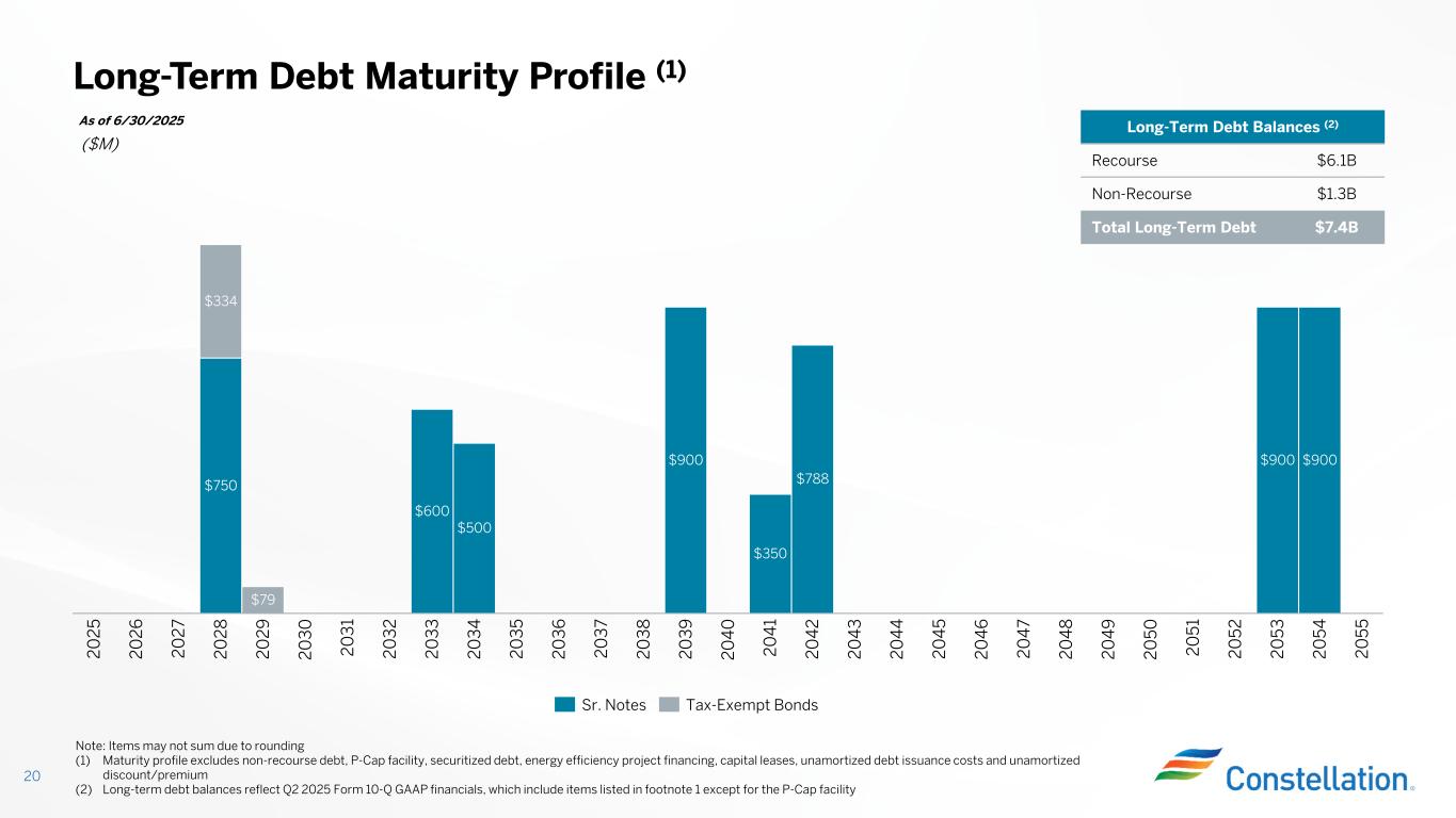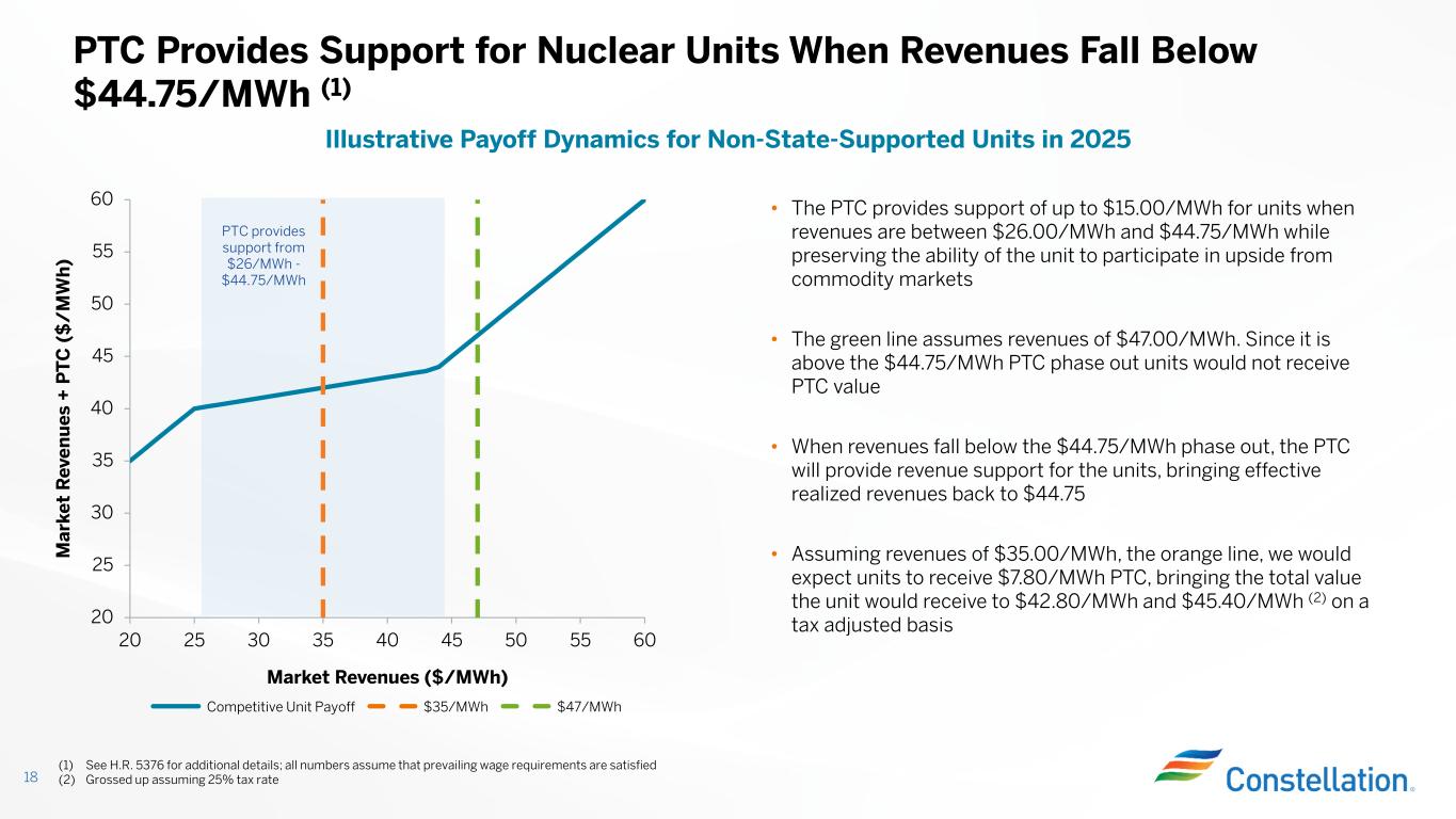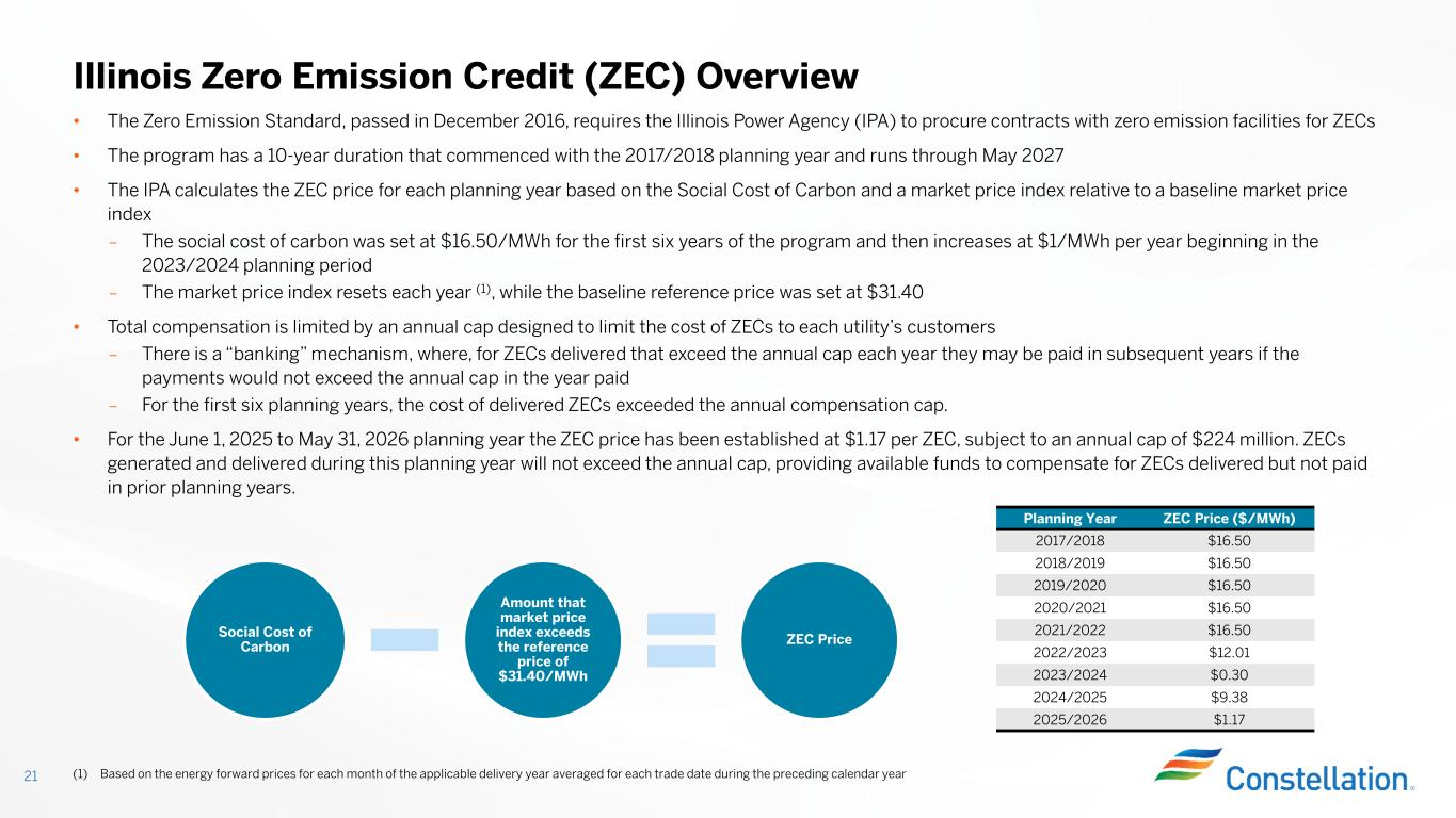 • Starting in 2025, the maximum PTC and gross receipts threshold are subject to an inflation adjustment based on the GDP price deflator for the preceding calendar year: • Maximum PTC is rounded to nearest $2.50/MWh and gross receipts threshold is rounded to nearest $1.00/MWh Inflation of Nuclear Production Tax Credit (1) 19 (1) See H.R. 5376 for additional details; all numbers assume that prevailing wage requirements are satisfied (2) Annual inflation adjustment is consistent with past published guidance for renewable energy credits, published annually. (3) 2025 reflects published inflation adjustment of 2.4% Example Assuming 2%, 3% and 4% Inflation Adjustment (2)PTC Overview Inflation Adjustment= GDP price deflator in preceeding year GDP price deflator in 2023 PTC Inflation Adjustment • The PTC is in effect through 12/31/32 • In 2025, Constellation qualifies for the nuclear PTC up to $15.00/MWh; the PTC amount is reduced by 80% of gross receipts exceeding $26.00/MWh, phasing out completely after $44.75/MWh • The nuclear PTC can be credited against taxes or monetized through sale to an unrelated taxpayer Maximum PTC Gross Receipts Threshold Power Price At Which PTC=$0 Maximum PTC Gross Receipts Threshold Power Price At Which PTC=$0 Maximum PTC Gross Receipts Threshold Power Price At Which PTC=$0 2024 15.00$ 25.00$ 43.75$ 15.00$ 25.00$ 43.75$ 15.00$ 25.00$ 43.75$ 2025 15.00$ 26.00$ 44.75$ 15.00$ 26.00$ 44.75$ 15.00$ 26.00$ 44.75$ 2026 15.00$ 26.00$ 44.75$ 15.00$ 27.00$ 45.75$ 15.00$ 27.00$ 45.75$ 2027 15.00$ 27.00$ 45.75$ 17.50$ 27.00$ 48.88$ 17.50$ 28.00$ 49.88$ 2028 17.50$ 27.00$ 48.88$ 17.50$ 28.00$ 49.88$ 17.50$ 29.00$ 50.88$ 2029 17.50$ 28.00$ 49.88$ 17.50$ 29.00$ 50.88$ 17.50$ 30.00$ 51.88$ 2030 17.50$ 28.00$ 49.88$ 17.50$ 30.00$ 51.88$ 20.00$ 32.00$ 57.00$ 2031 17.50$ 29.00$ 50.88$ 17.50$ 31.00$ 52.88$ 20.00$ 33.00$ 58.00$ 2032 17.50$ 29.00$ 50.88$ 20.00$ 32.00$ 57.00$ 20.00$ 34.00$ 59.00$ 2% Inflation Adjustment (3) 3% Inflation Adjustment 4% Inflation Adjustment